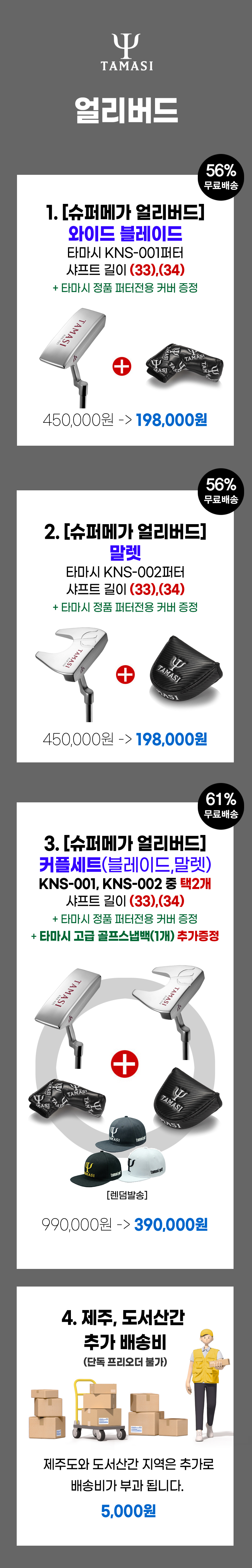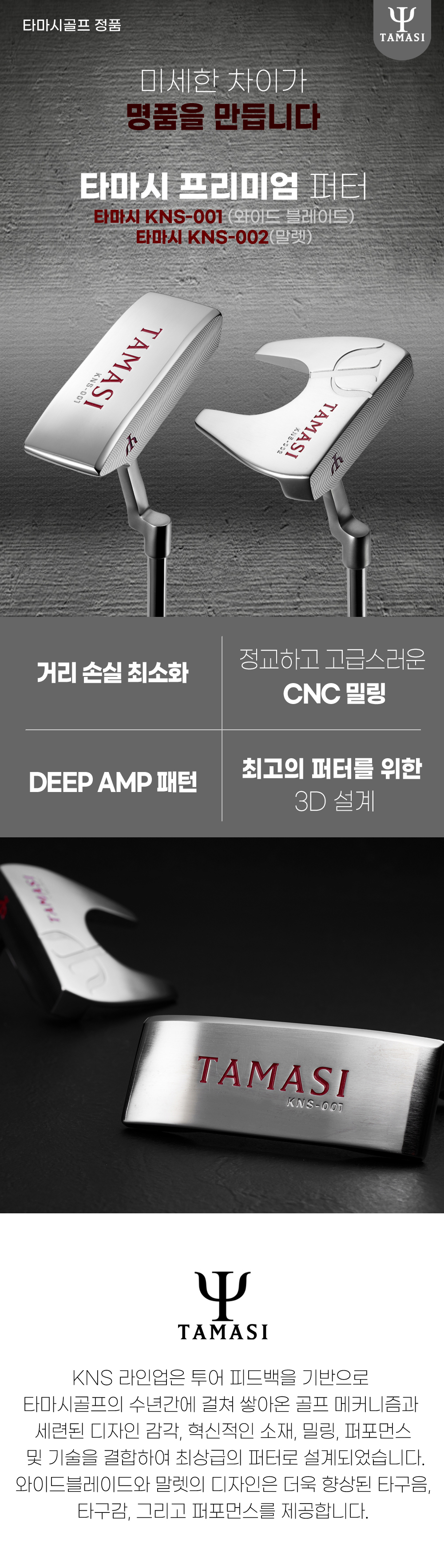 허나 모든 클럽을 쉽고 편하게 만드는 타마시골프이지면 퍼터만큼은 '자세'가 나와야 한다고 생각합니다. 타마시 디자인팀은 그 자세에 주목했습니다. 어떡하면 최고의 퍼터를 만들까 고민끝에 타마시 KNS퍼터 라인을 출시하였습니다. 이번에 출시한 KNS퍼터는 단연컨대 타마시골프에서 명품퍼터라 자부합니다. 그린 위 원펏을 목표로 만든 이 퍼터는 원가를 무시하고 최고의 퍼터로 완성 했습니다. 이 퍼터도 상당히 고가의 제품입니다. 허나 와디즈 펀딩에만 노마진으로 진행 합니다. 그러기에 주변의 서퍼터님들께 구전해 주세요. 거리감 OK, 방향성 OK, 타구감 OK, 타구음 OK, 4박자를 모두 만족시키는 타마시 KNS 퍼터... 쉽지 않았습니다. 결과로 말씀드릴께요. 펀딩 후 제품을 받아보시면 완전히 대만족 하실겁니다. 자신 있습니다.