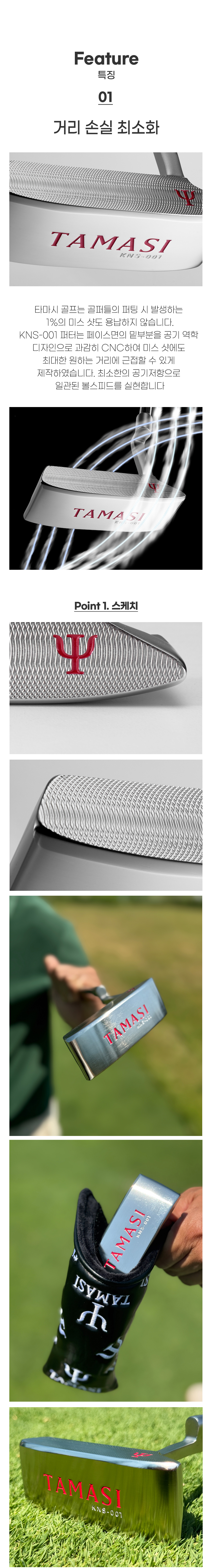 그린위에 뒷땅? ‘퍼터로 무슨 뒷땅이야?’라고 생각하겠지만 의외로 골퍼라면 한 번쯤은 경험이 있습니다. 타마시 KNS-001은 페이스면 하단부를 부드럽게 라운딩 처리를 하여 퍼텅 시 뒷땅이 나도 마찰을 최소화하여 원하는 거리를 유지시킵니다. 웨지의 바운스 같은 역할을 하며 여러 번의 제품설계와 시행 착오를 통해 퍼팅에는 문제가 없고 마찰에 저항은 최소화 하는 각도를 찾아냈습니다.