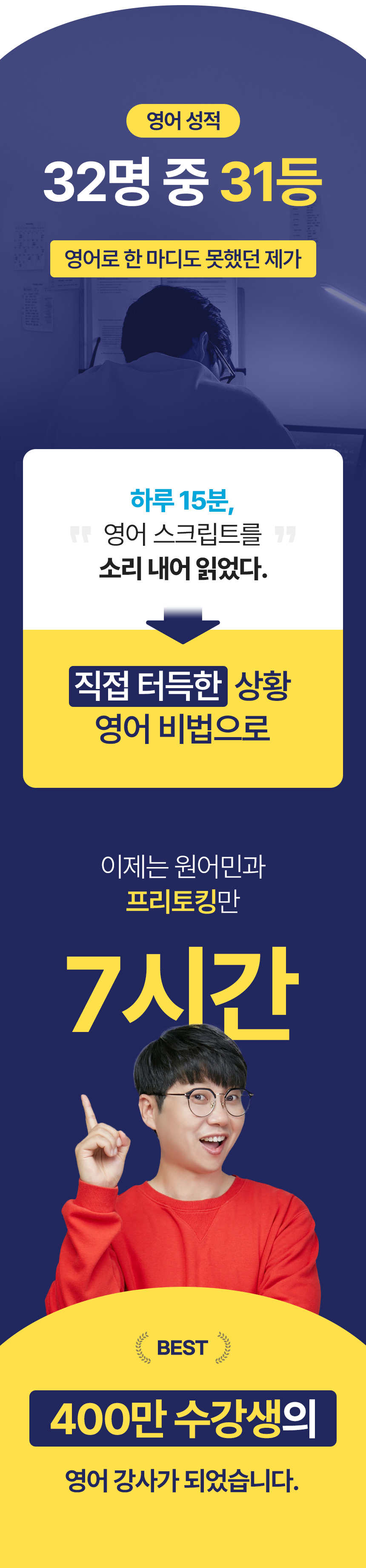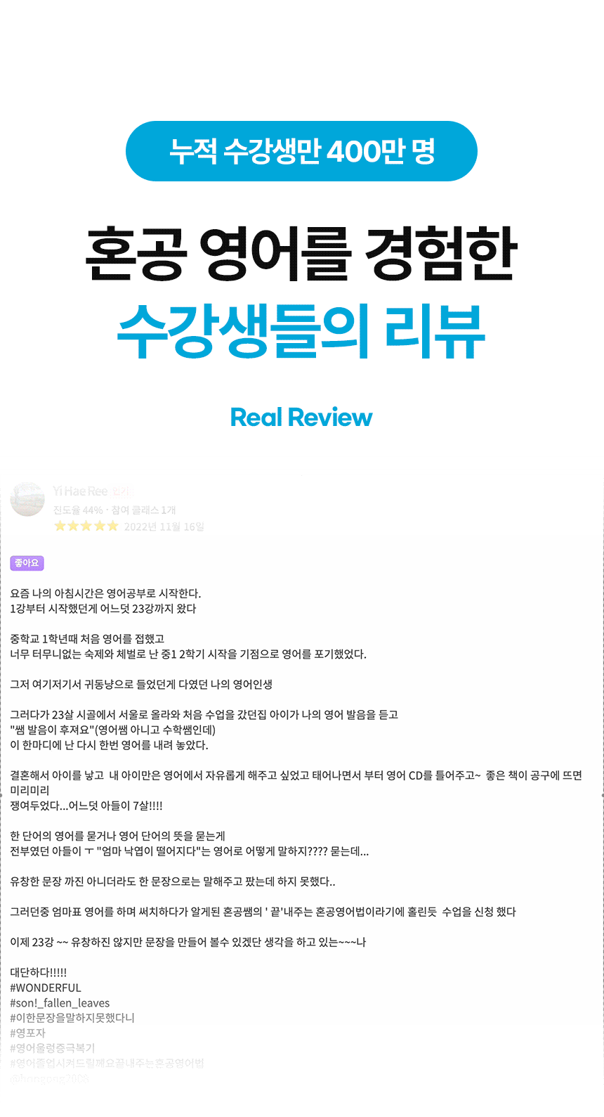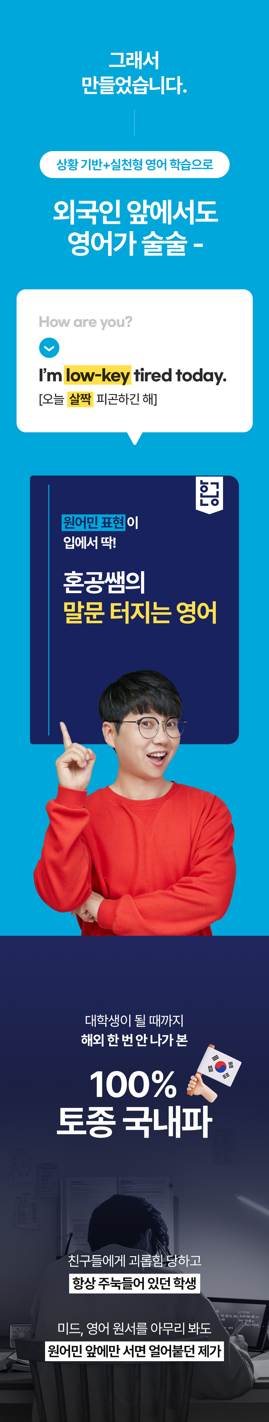 저는 중학교 때부터 학교 폭력을 당하며 힘들게 학교생활을 한 학생이었습니다. 지방에서 태어나 자랐고, 잘하는 게 없어 늘 괴로운 삶을 살았습니다. 그러던 어느 날, 영어 시간에 들은 원어민의 목소리에 매료되어 영어 읽기를 시작했습니다. 영어를 통해 자신감을 얻으면서, 지금은 어떤 순간에도 포기하지 않고 도전하는 어른이 되었습니다. 지금도 외국인과 소통하는 게 즐겁기만 합니다.