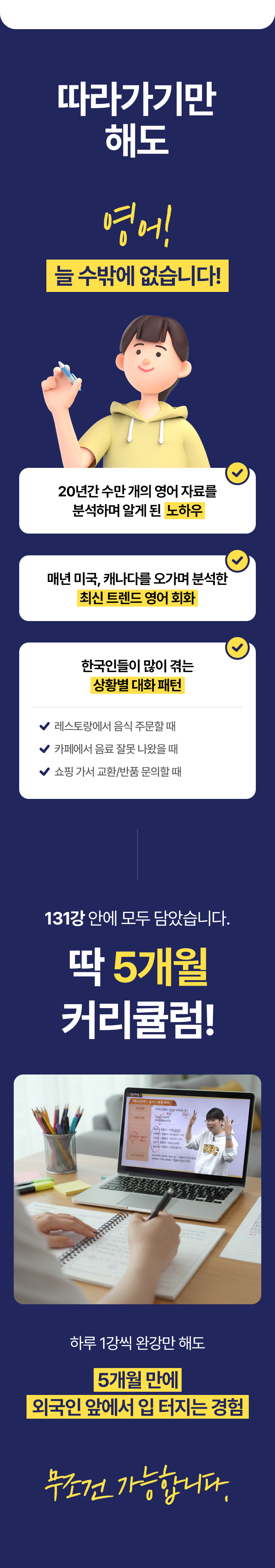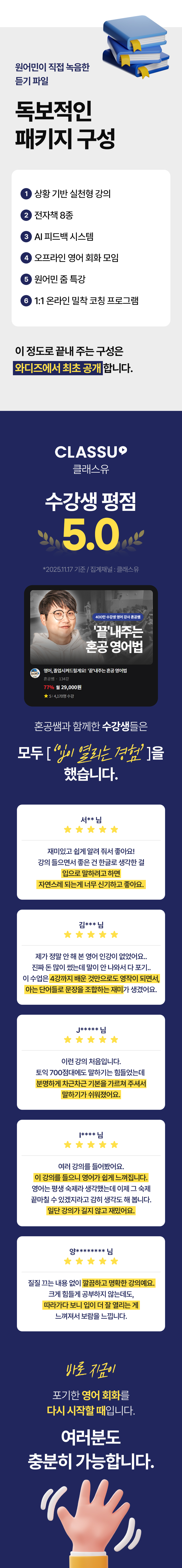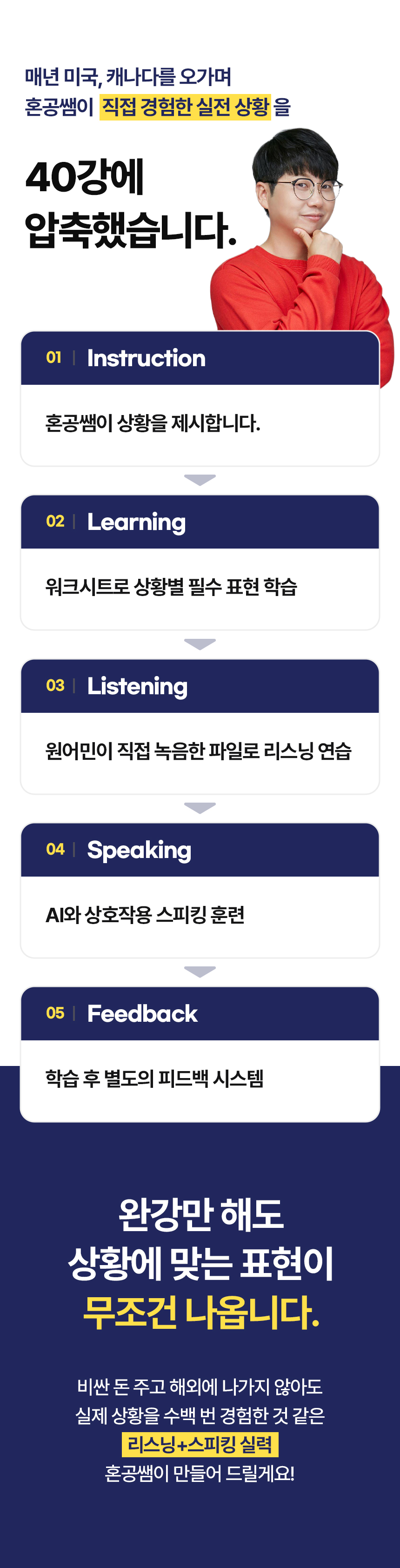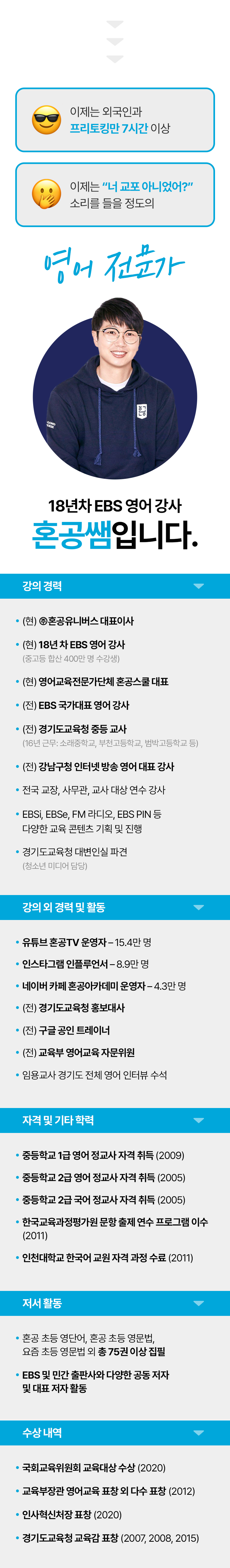 여러분, 인생에 큰 변화를 줄 수 있는 제1의 언어는 영어입니다. 똑똑한 한국인들에게 영어 실력이 더해진다면 무엇이든 할 수 있습니다. 초보 시절의 서러움을 너무나 잘 알기에, 눈높이를 가장 잘 아는 영어 강사가 될 수 있었습니다. 여러분이 스스로 영어를 공부하고 실력을 키워 나갈 수 있도록, 가장 효율적인 방법으로 온 마음 다해 돕겠습니다.
