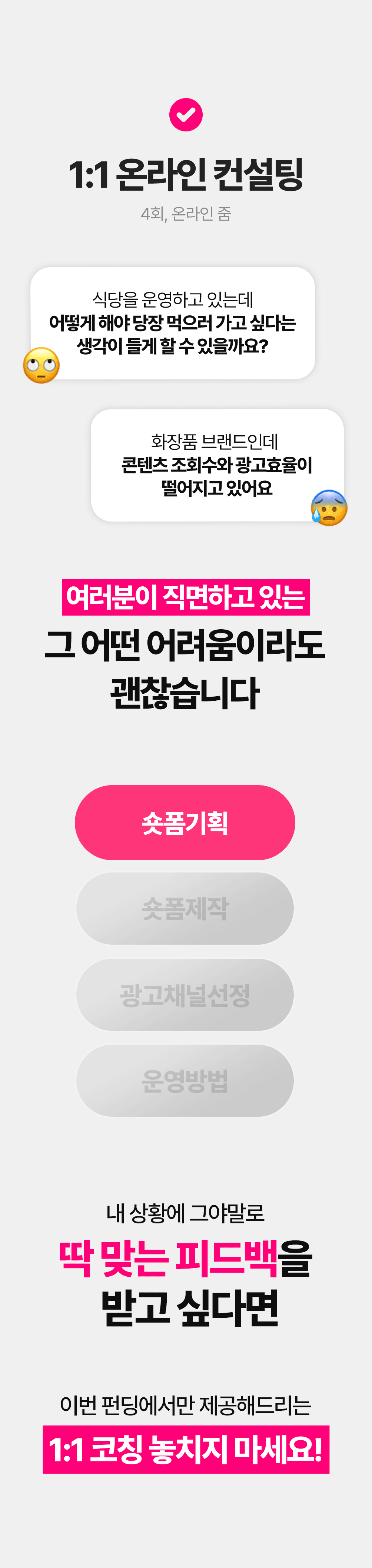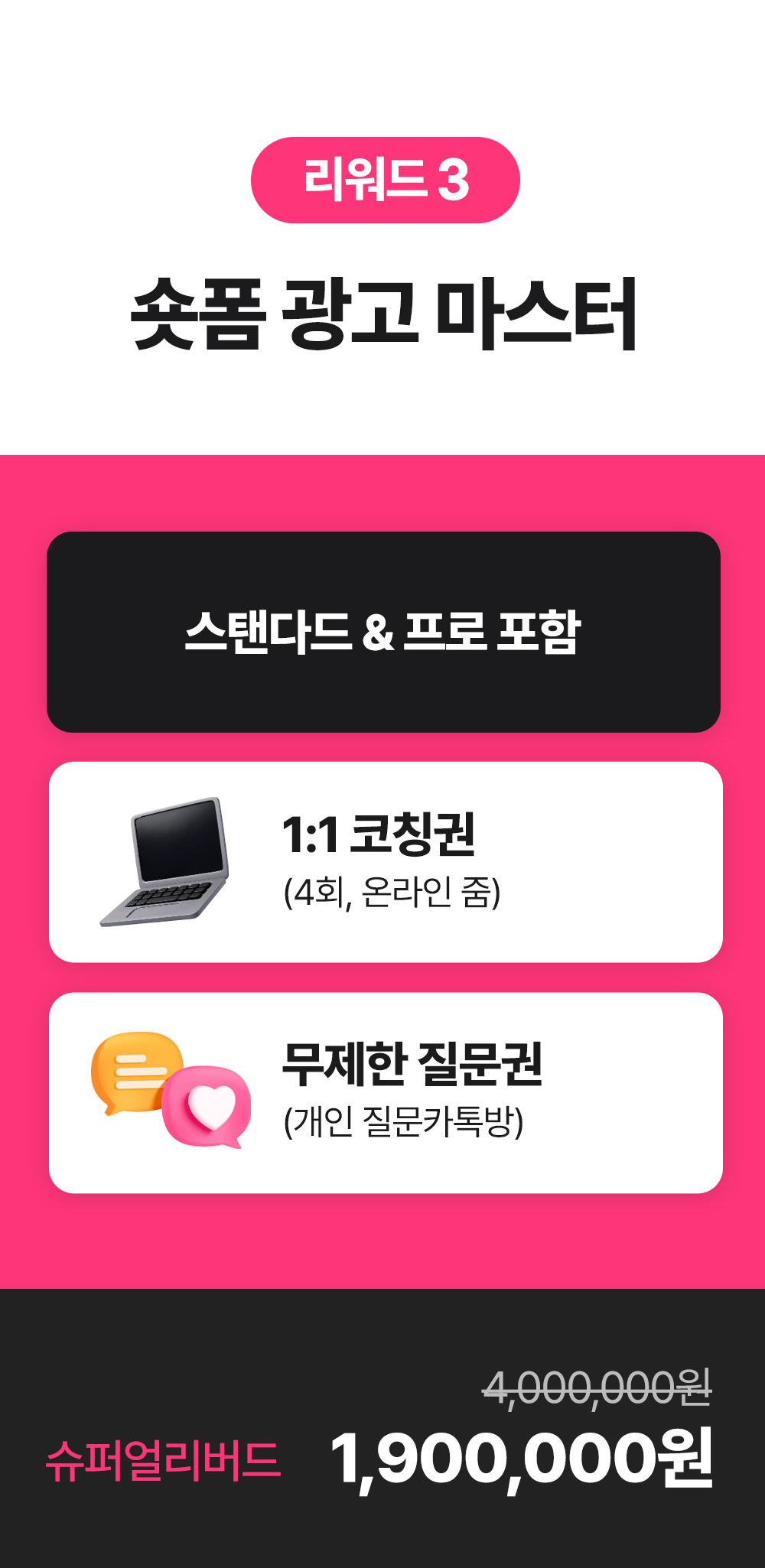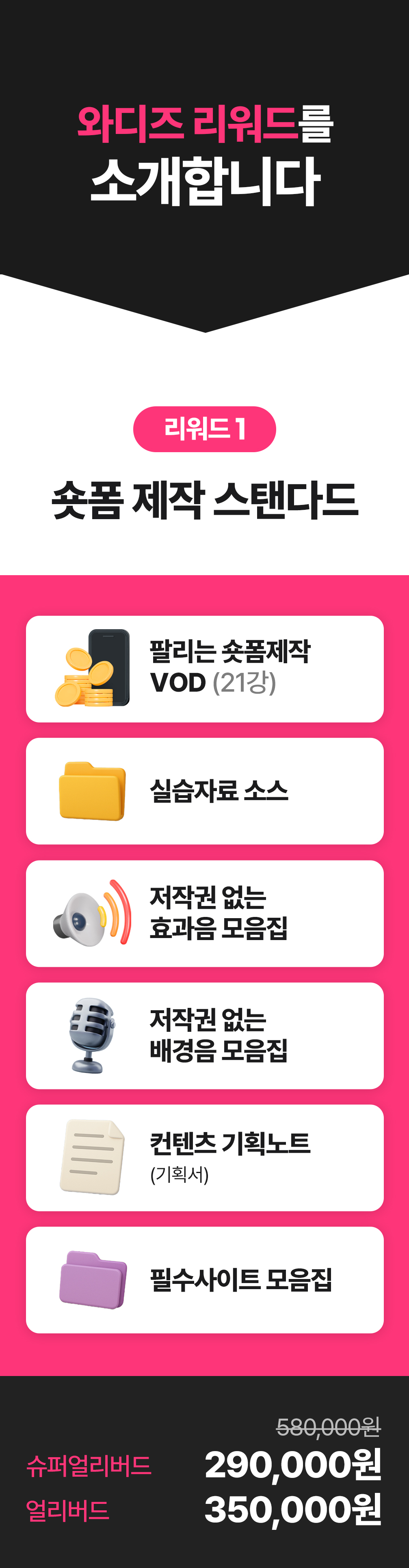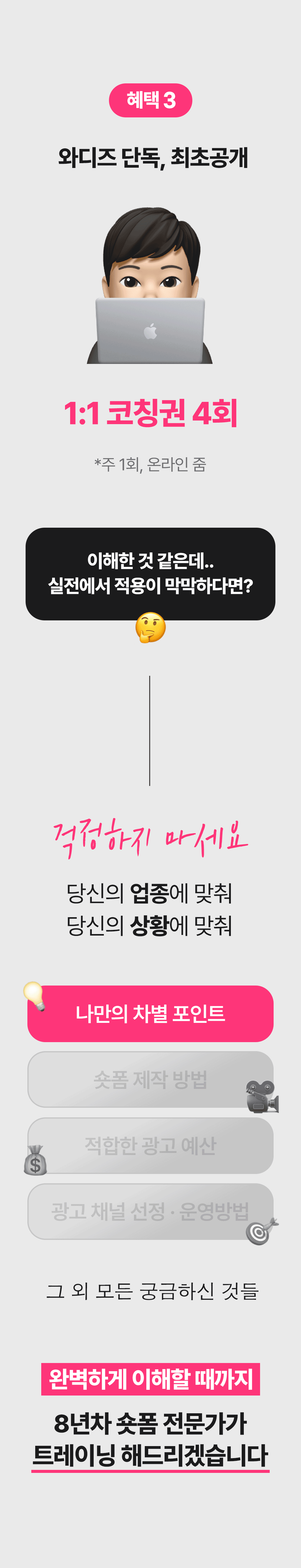 1. 🎥 숏폼 영상 제작과 광고 운영 - 8년차 전문가가 숏폼 제작부터 광고 운영법까지 전수 2. 🚀 매출 극대화와 광고 효율 향상 - 3초 후킹과 데이터 기반 전략으로 매출과 ROAS 대폭 상승 3. 🎁 와디즈 단독 1:1 맞춤 코칭 - 주 1회 4회 코칭과 실전 적용 교육을 단독 최초 공개