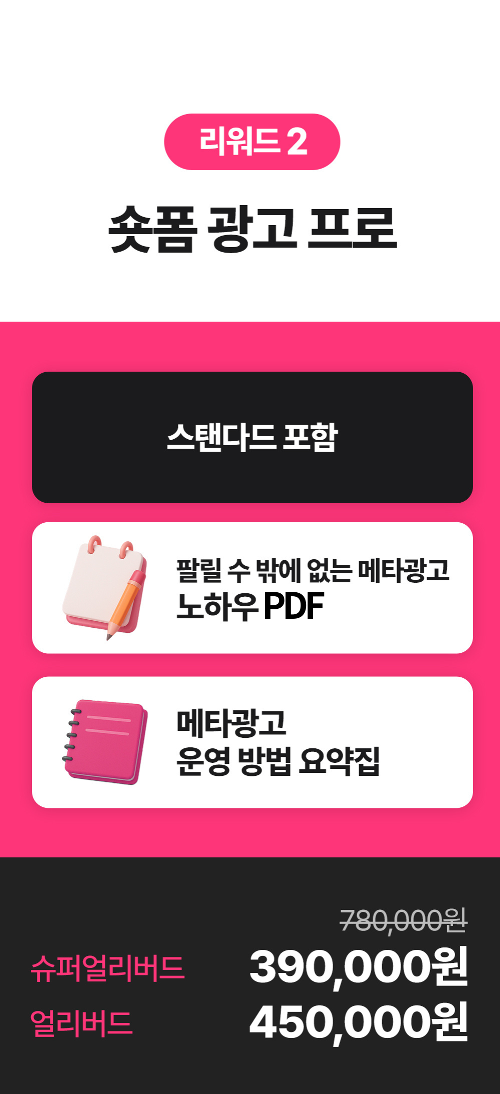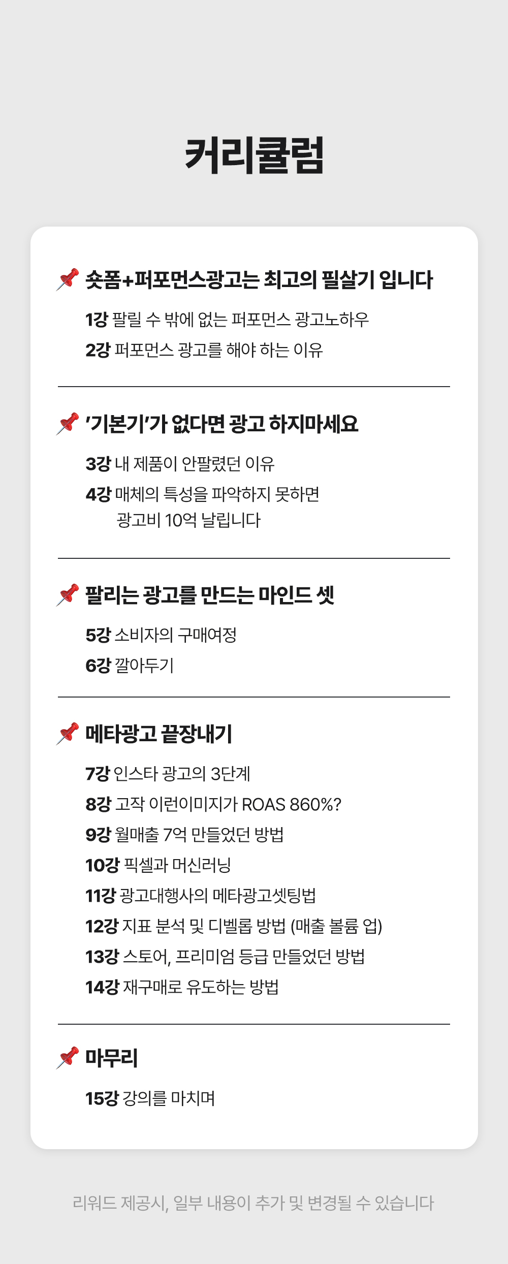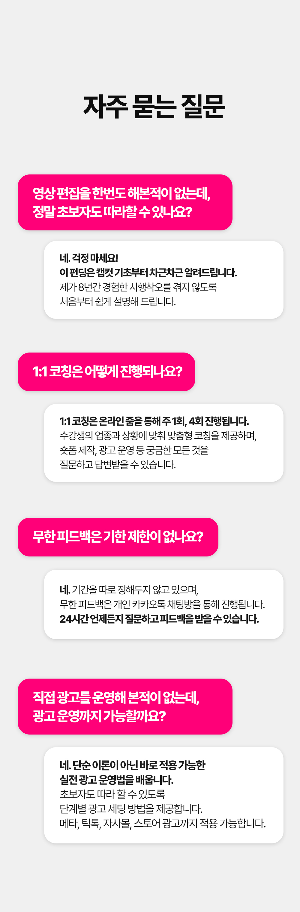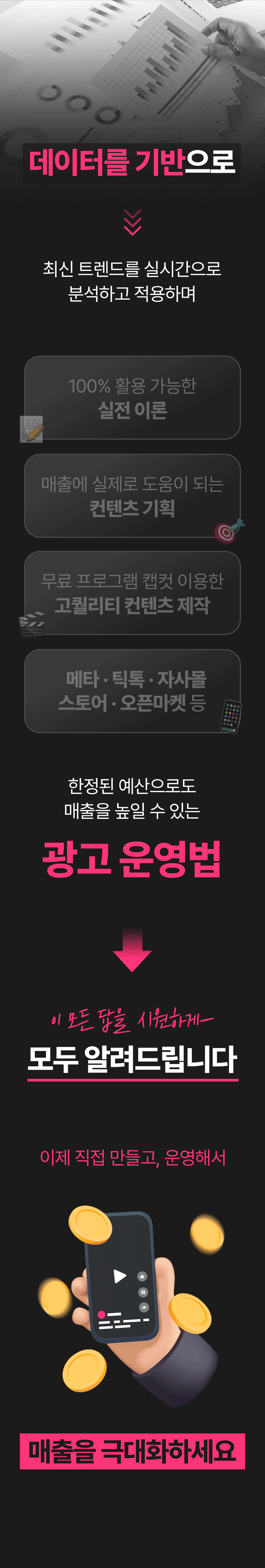 1. 🎥 숏폼 영상 제작과 광고 운영 - 8년차 전문가가 숏폼 제작부터 광고 운영법까지 전수 2. 🚀 매출 극대화와 광고 효율 향상 - 3초 후킹과 데이터 기반 전략으로 매출과 ROAS 대폭 상승 3. 🎁 와디즈 단독 1:1 맞춤 코칭 - 주 1회 4회 코칭과 실전 적용 교육을 단독 최초 공개