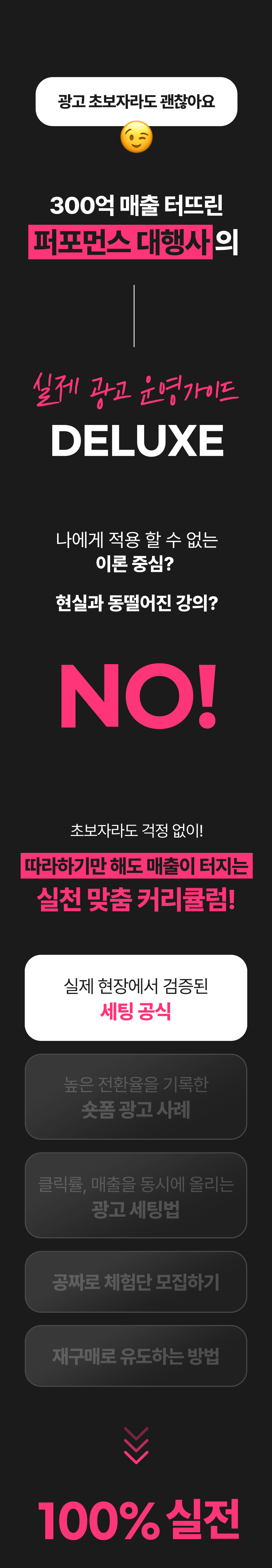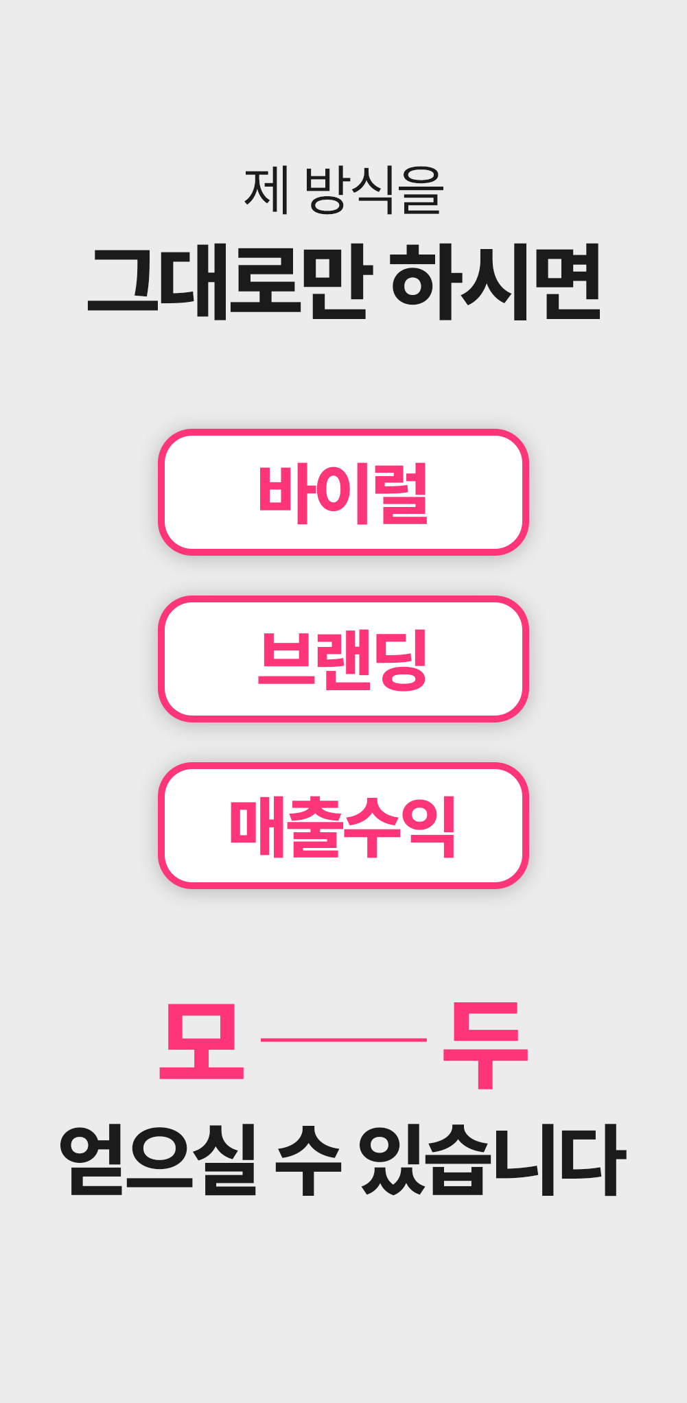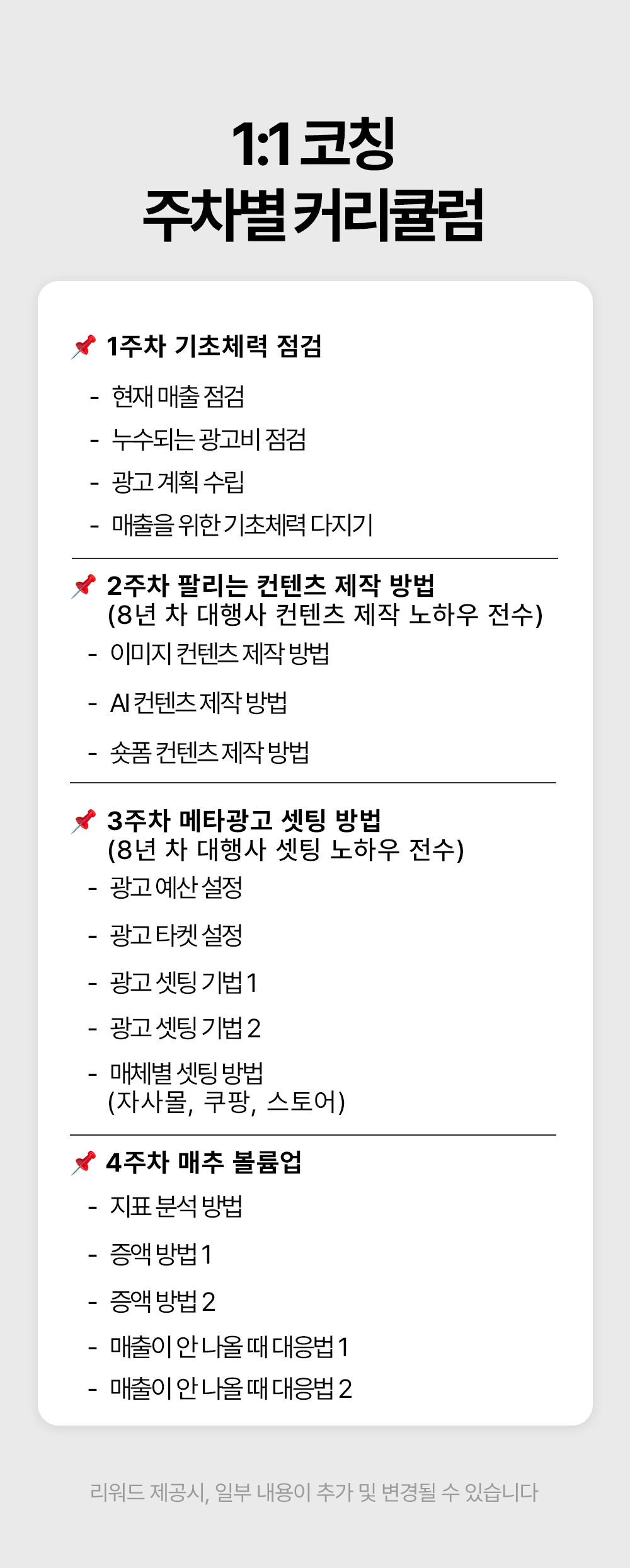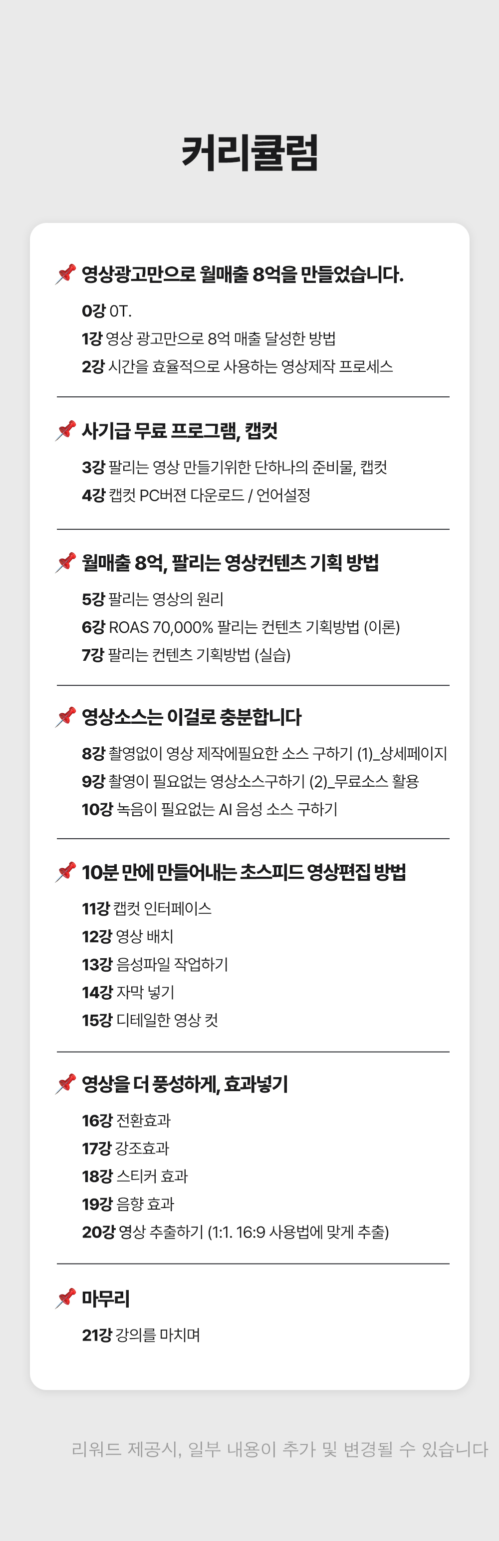 1. 🎥 숏폼 영상 제작과 광고 운영 - 8년차 전문가가 숏폼 제작부터 광고 운영법까지 전수 2. 🚀 매출 극대화와 광고 효율 향상 - 3초 후킹과 데이터 기반 전략으로 매출과 ROAS 대폭 상승 3. 🎁 와디즈 단독 1:1 맞춤 코칭 - 주 1회 4회 코칭과 실전 적용 교육을 단독 최초 공개