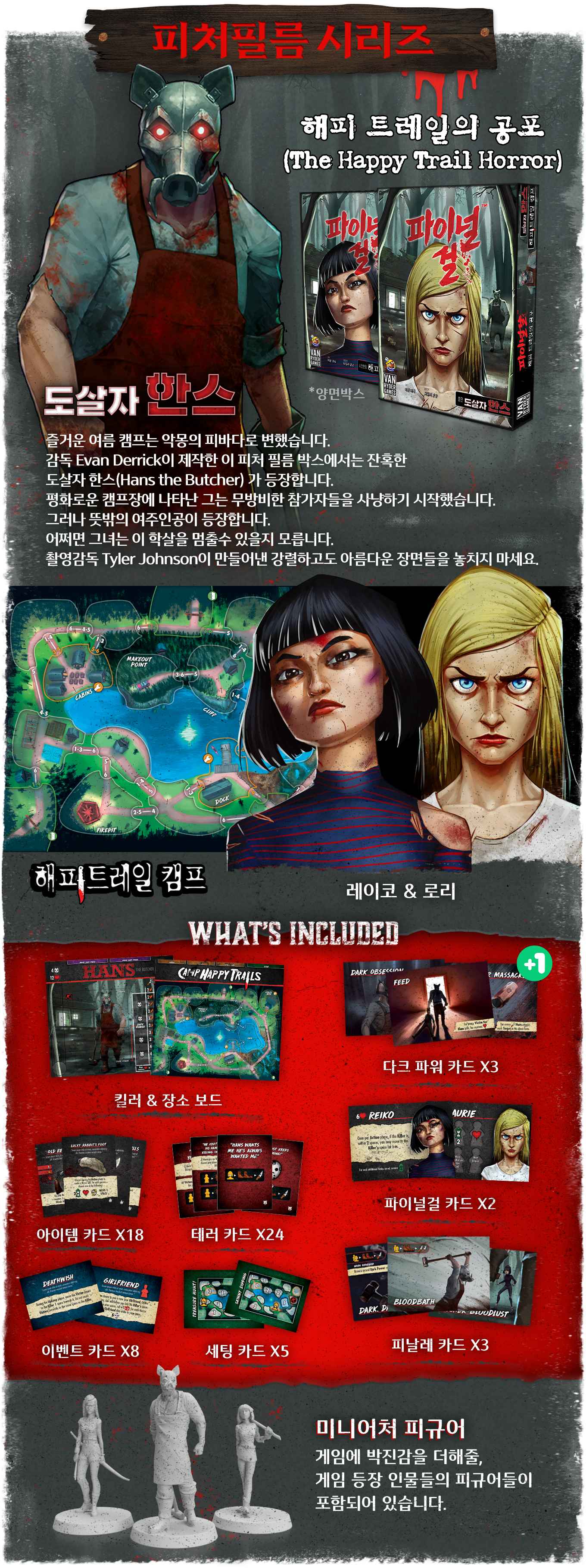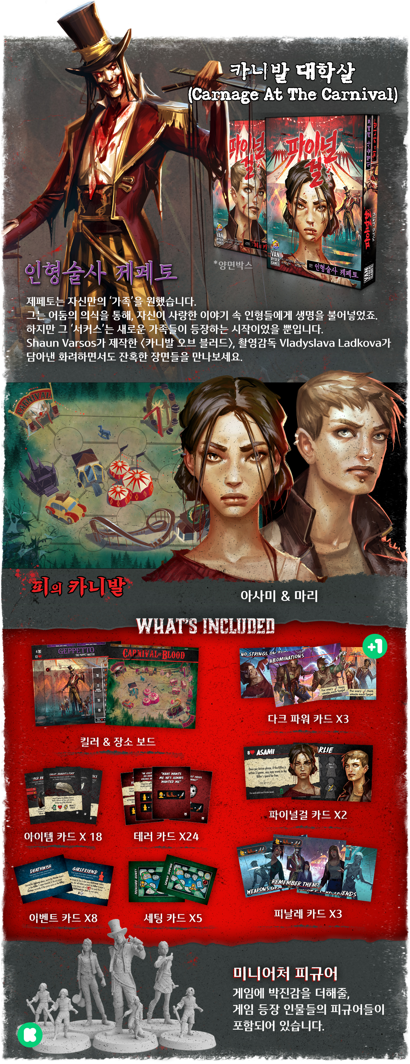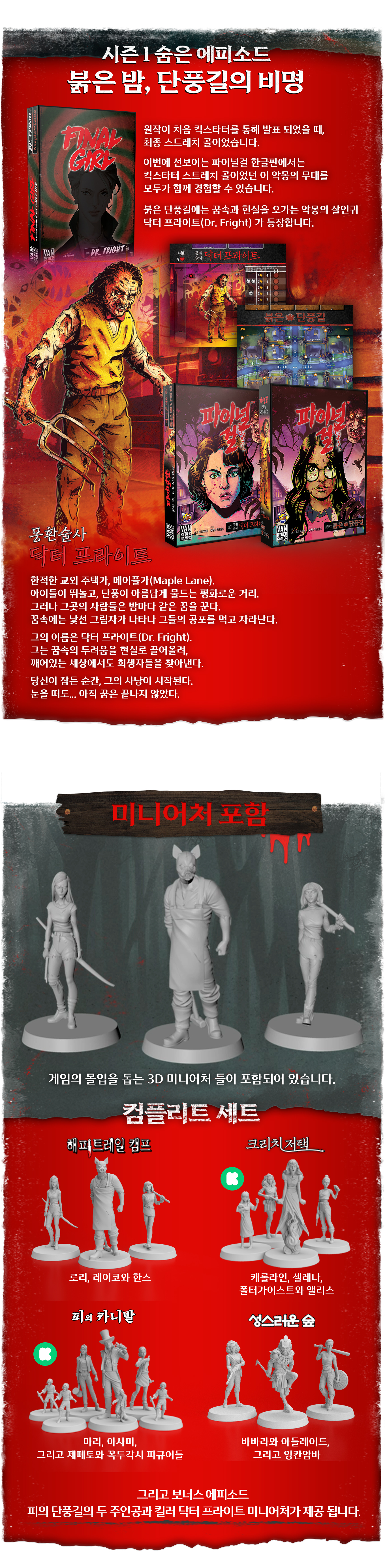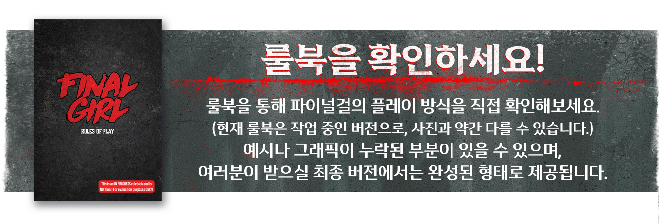 이번 파이널걸 시즌1의 정식 한국어판 출시는 솔로 호러보드게임의 세계를 국내 보드게이머와 보드게임 입문자분들께 제대로 소개하기 위한 시작입니다. 파이널걸의 매력적인 스토리 라인과 게임 플레이를 서포터들에게 소개할 수 있도록 대표 플랫폼인 와디즈를 선택했습니다.