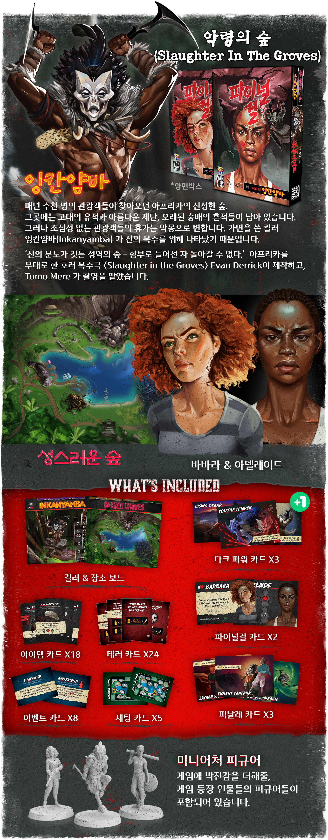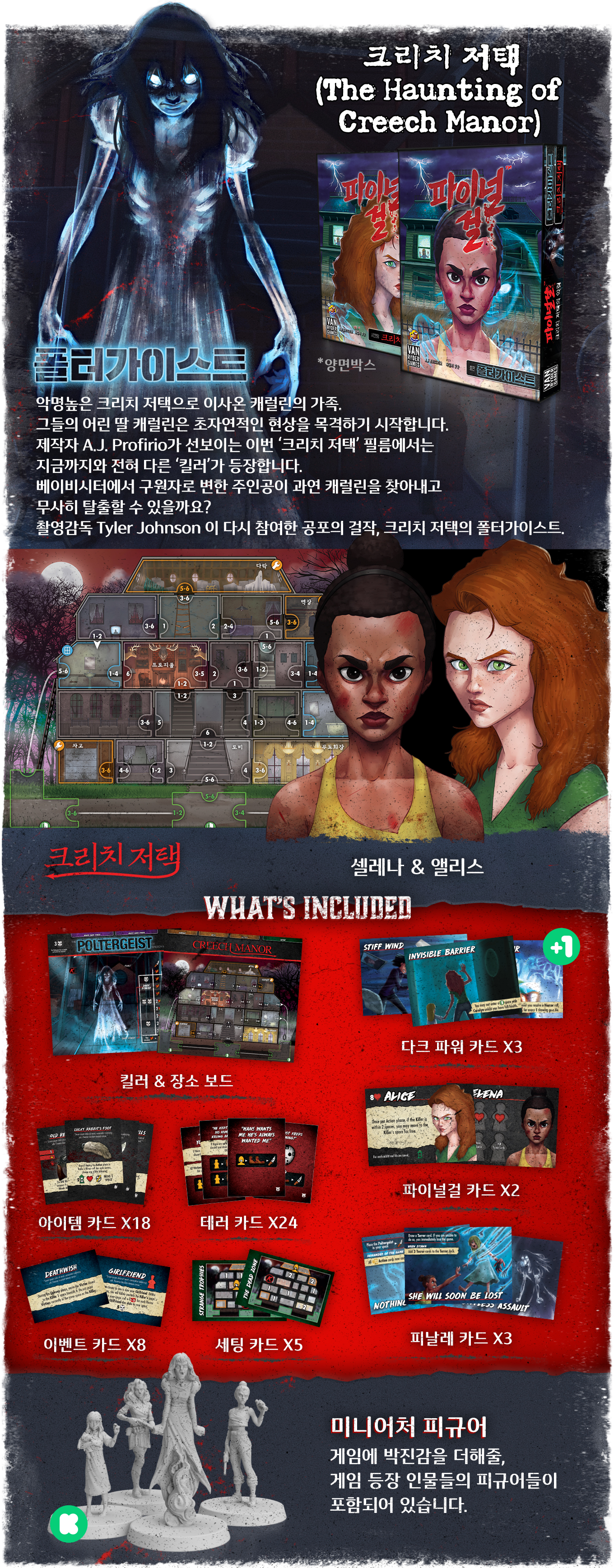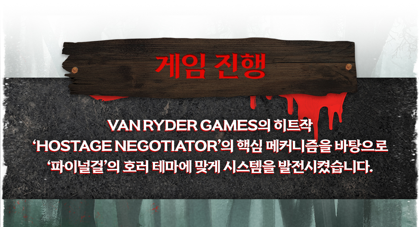 이번 파이널걸 시즌1의 정식 한국어판 출시는 솔로 호러보드게임의 세계를 국내 보드게이머와 보드게임 입문자분들께 제대로 소개하기 위한 시작입니다. 파이널걸의 매력적인 스토리 라인과 게임 플레이를 서포터들에게 소개할 수 있도록 대표 플랫폼인 와디즈를 선택했습니다.