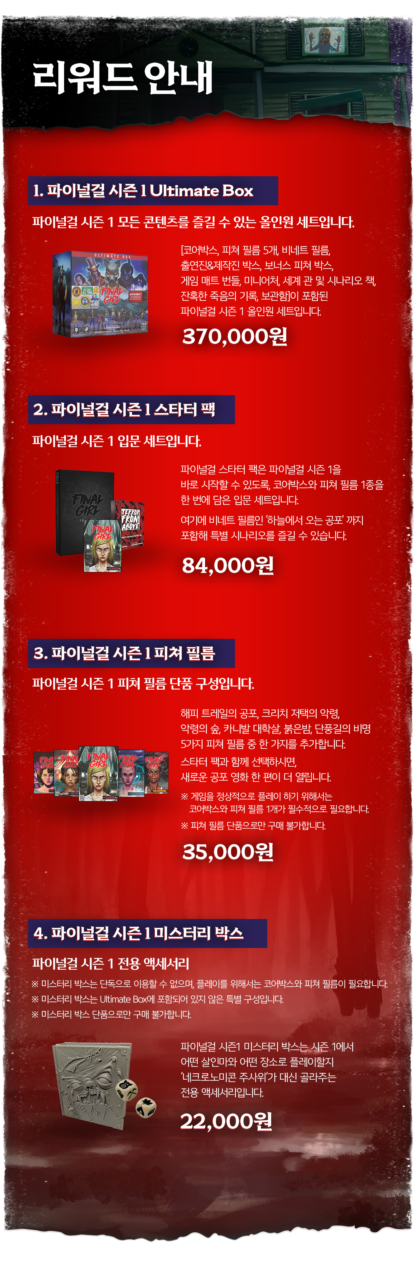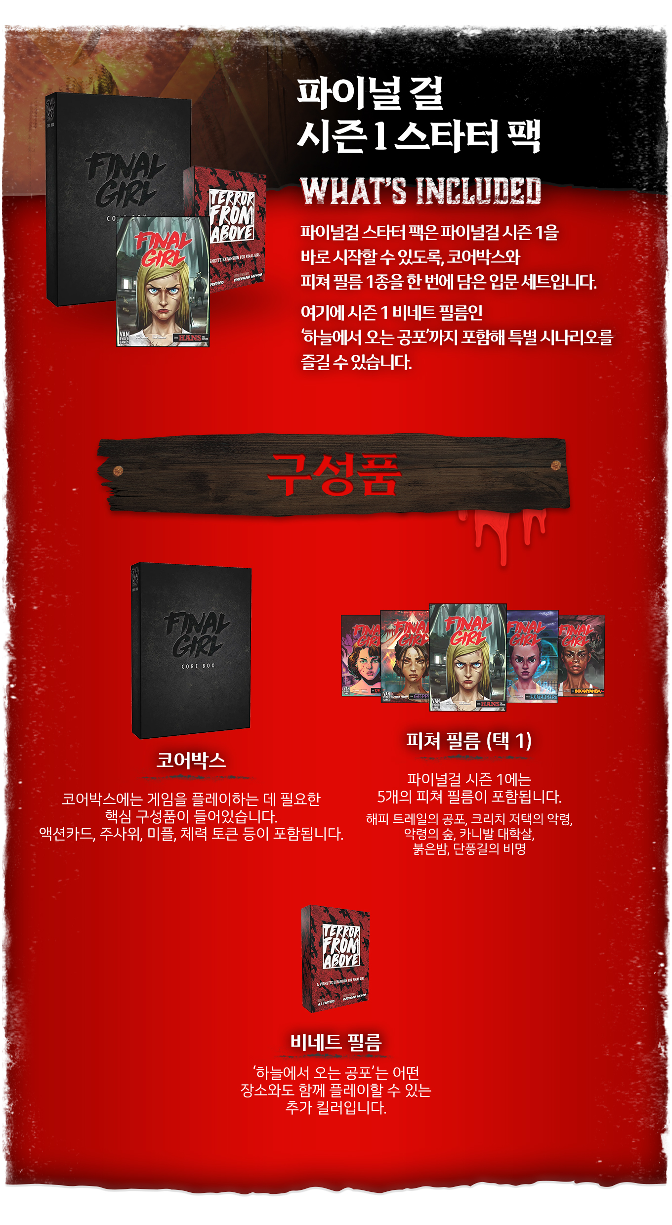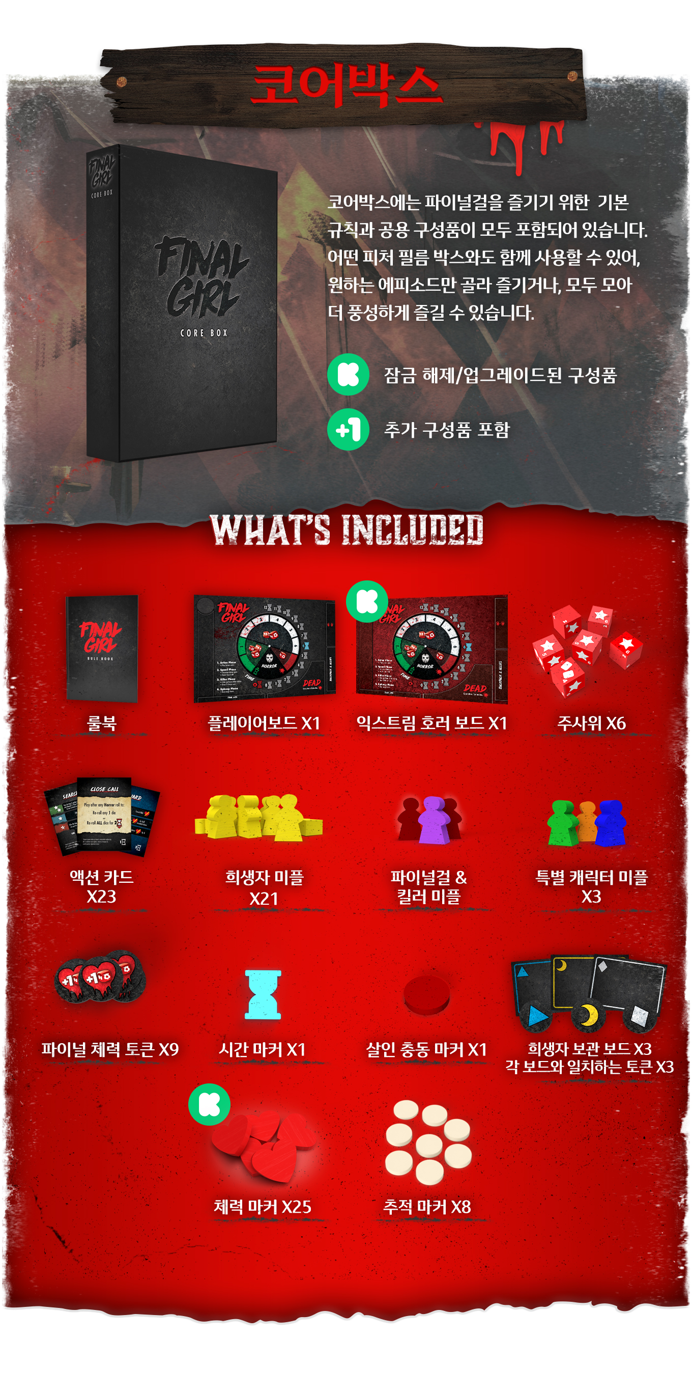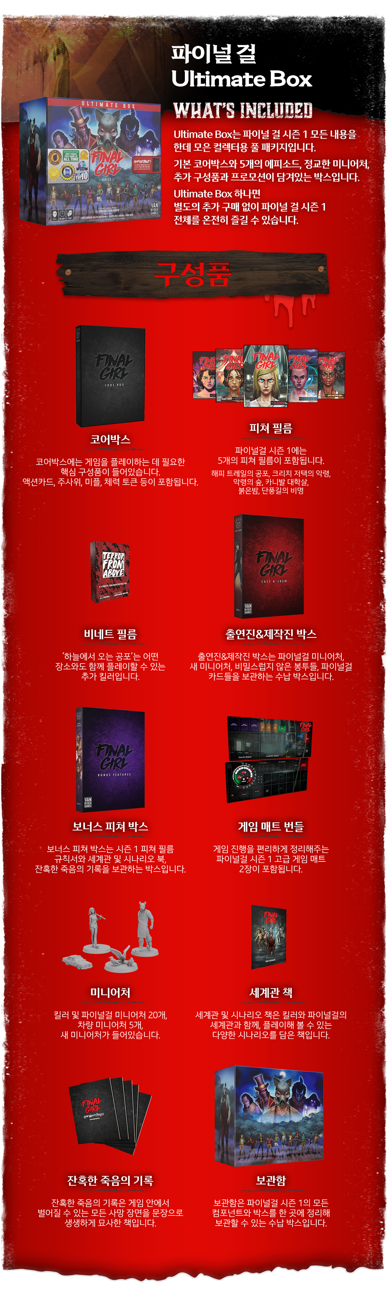 파이널걸 시리즈 1은 코어박스, 개별 피쳐 필름, 플레이 매트, 미니어처 세트, 보너스 피쳐 박스, 세계관 및 잔혹한 죽음의 기록 등 포함된 구성품이 다양합니다.