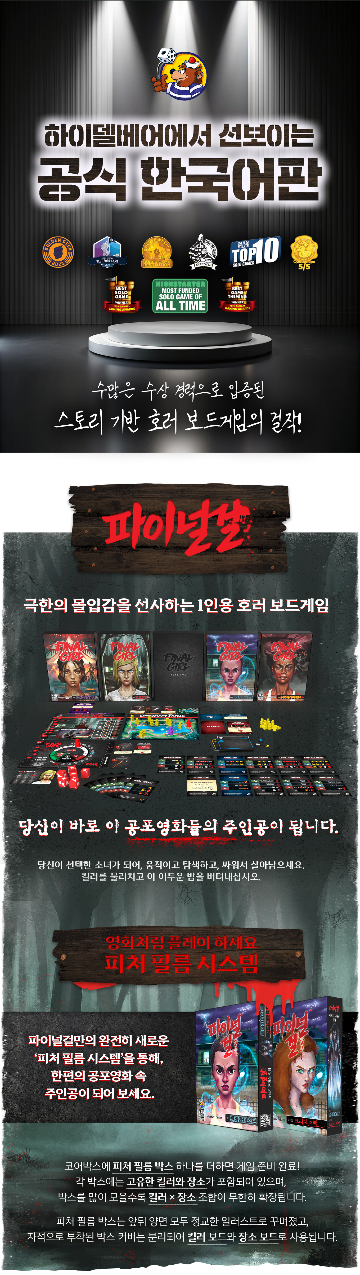 파이널걸은 전 세계에서 호평받은 1인용 호러 보드게임의 대표작입니다.