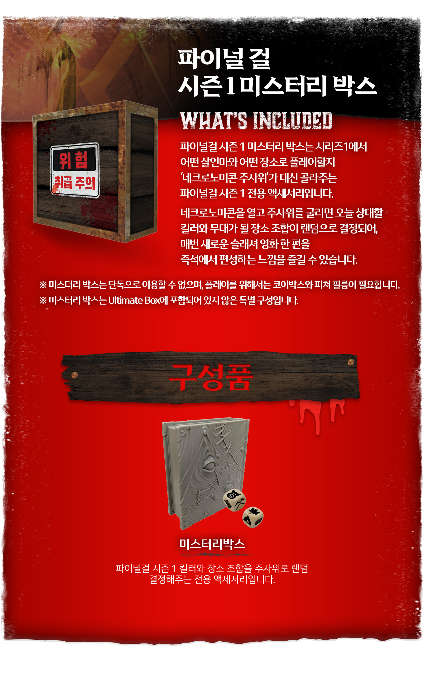 Ultimate Box에 포함된 개별 구성품(보너스 피쳐 박스, 세계관 및 시나리오 책, 잔혹한 죽음의 기록, 매트 등)은 향후 일반 판매 시, 남아 있는 재고 상황을 보고 개별 판매를 검토할 예정입니다.