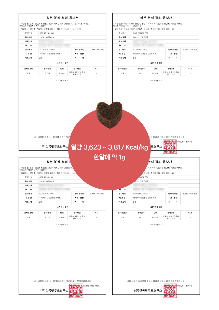 4종 모두 약 3.8kcal 정도의 열량으로 부담없이 급여해요.