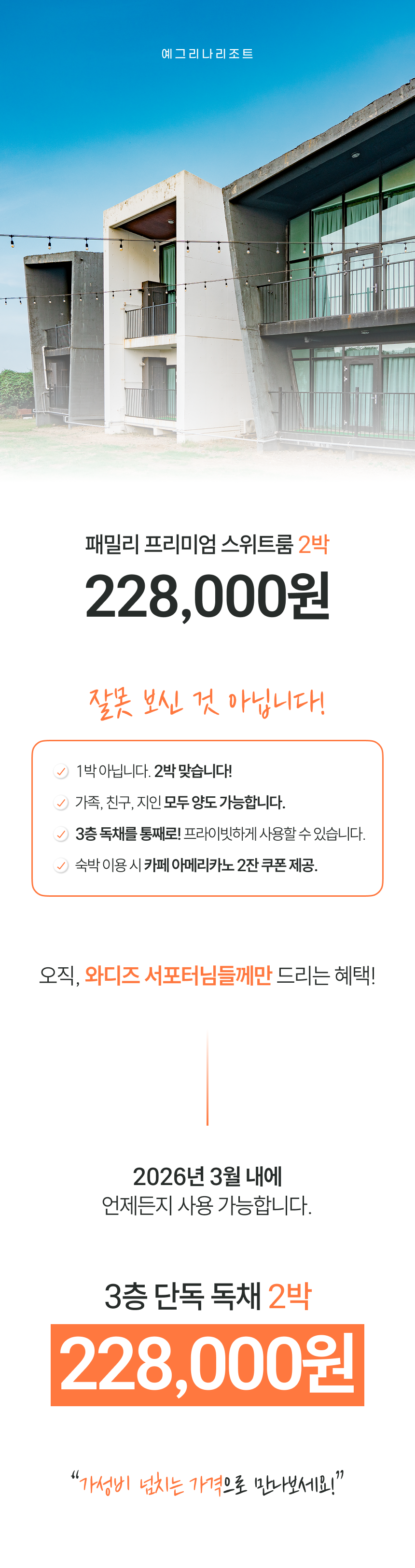3층 독채를 프라이빗하게! [1+1 숙박] 으로 가격은 최저, 혜택은 최고로 준비했습니다. 연박으로 더 좋은 혜택! ★1박 결제시 1박 무료★ 오직 와디즈에서만 만나보세요!