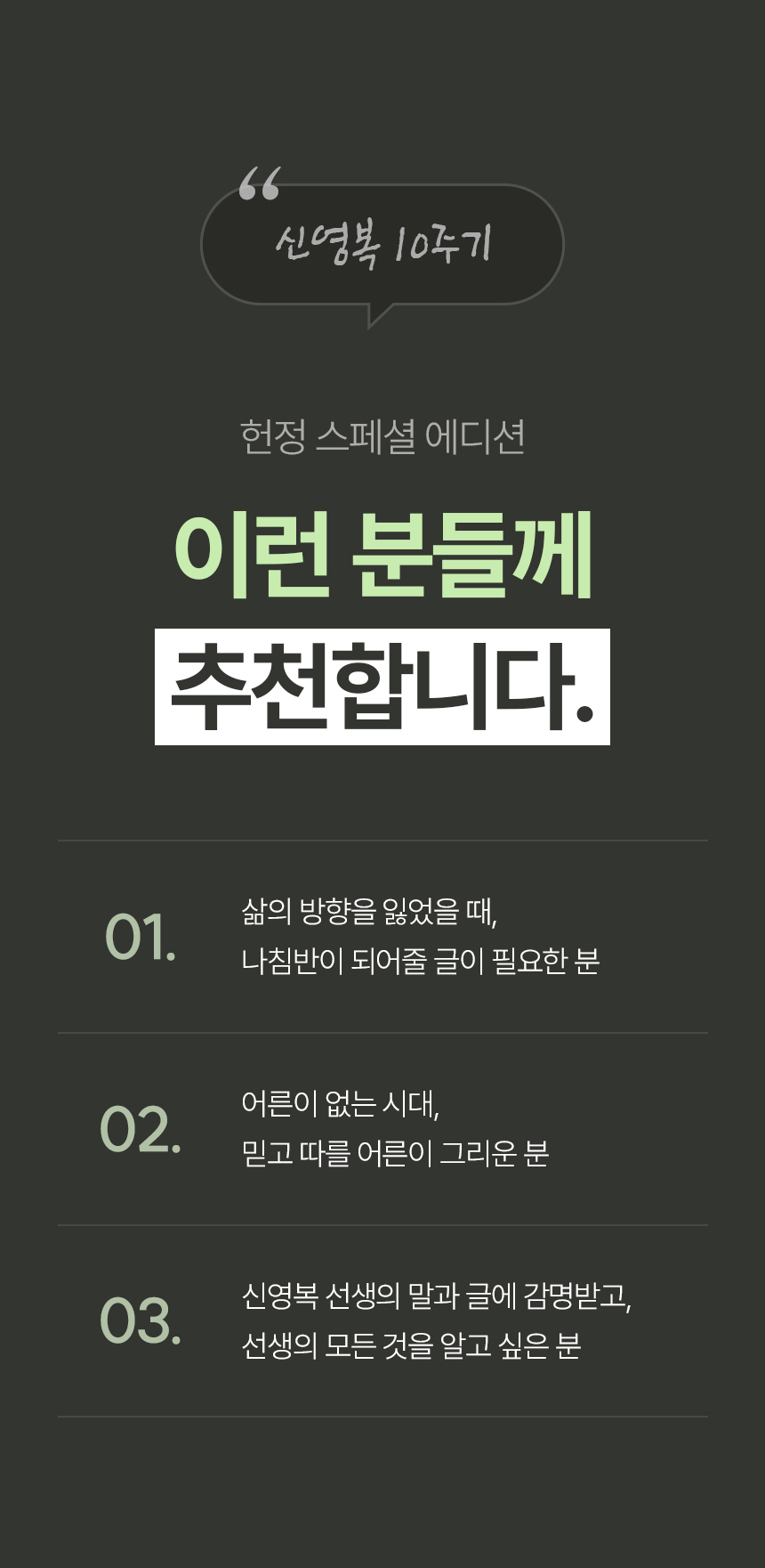 특별한 콘텐츠를 특별하게 다룬 수십 년의 노력을 기반으로 높은 퀄리티의 도서를 선보이겠습니다. - 대표이사 한철희