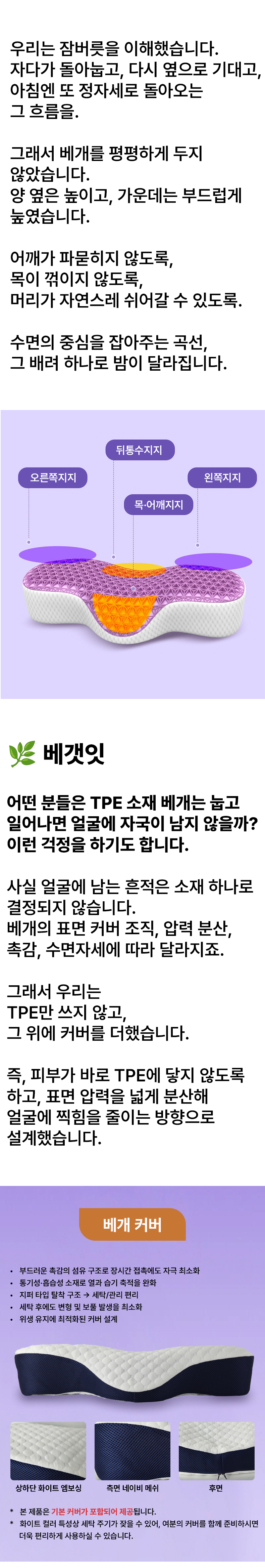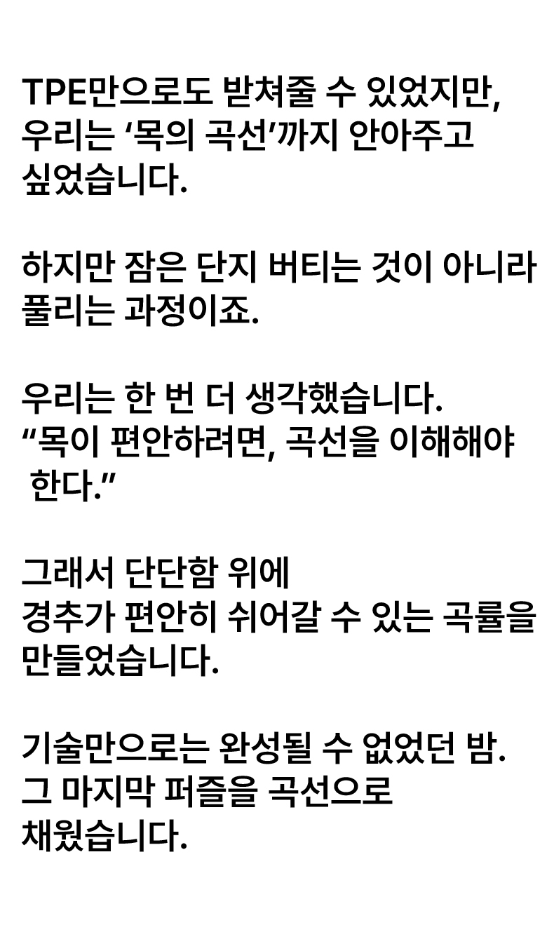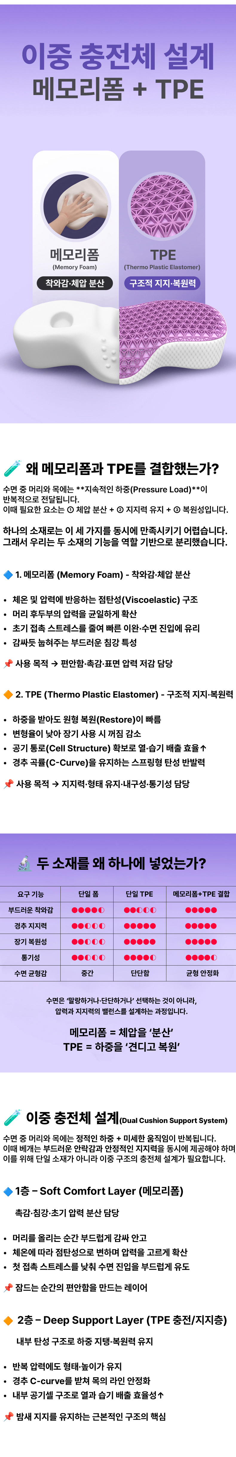 1. 🛏️ TPE+메모리폼 이중 설계 베개 - 경추 C-커브 맞춤 인체공학적 곡률 설계 2. 🌙 편안한 숙면과 목 지지력 강화 - 목의 곡선을 따라 지지력과 복원력 균형 제공 3. 🎁 세련된 커버 포함 편리한 관리 - 화이트+네이비 커버, 지퍼 탈착 세탁 가능
