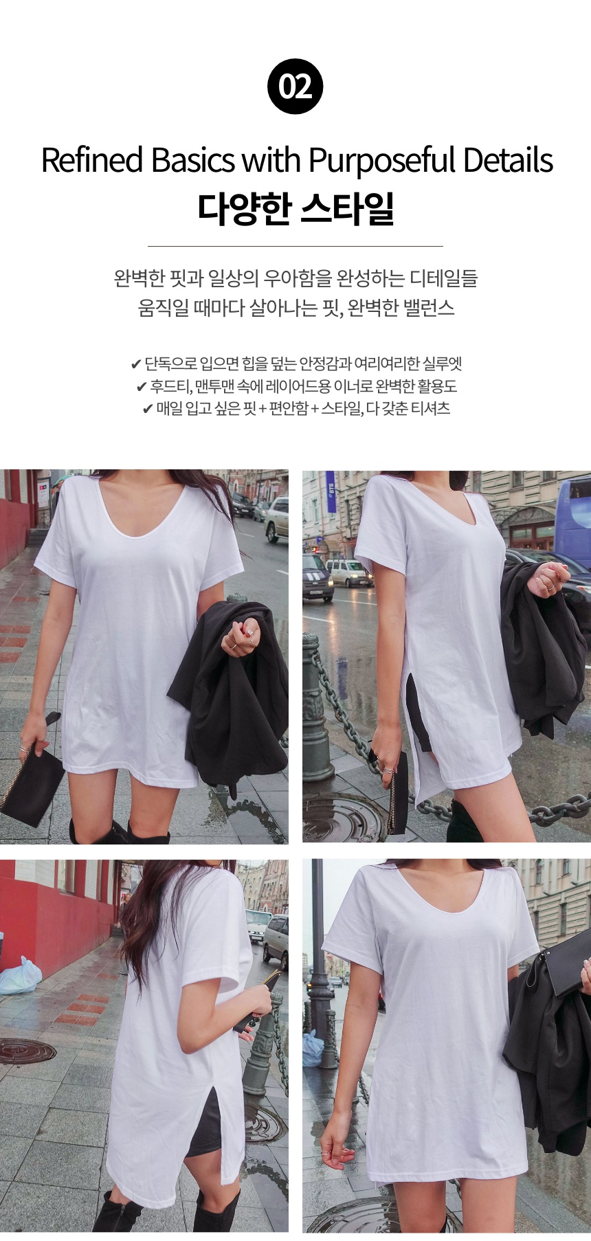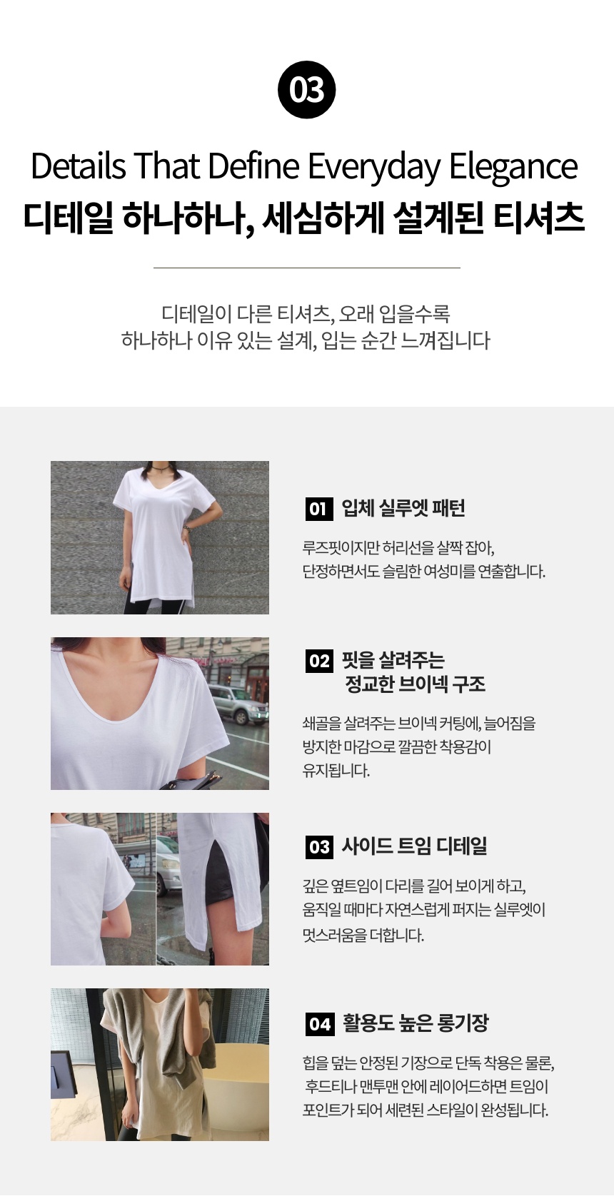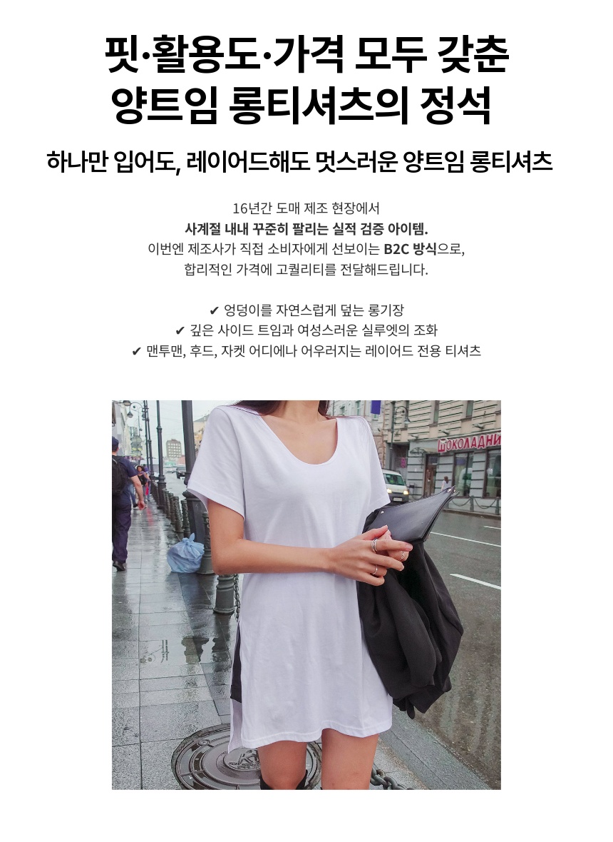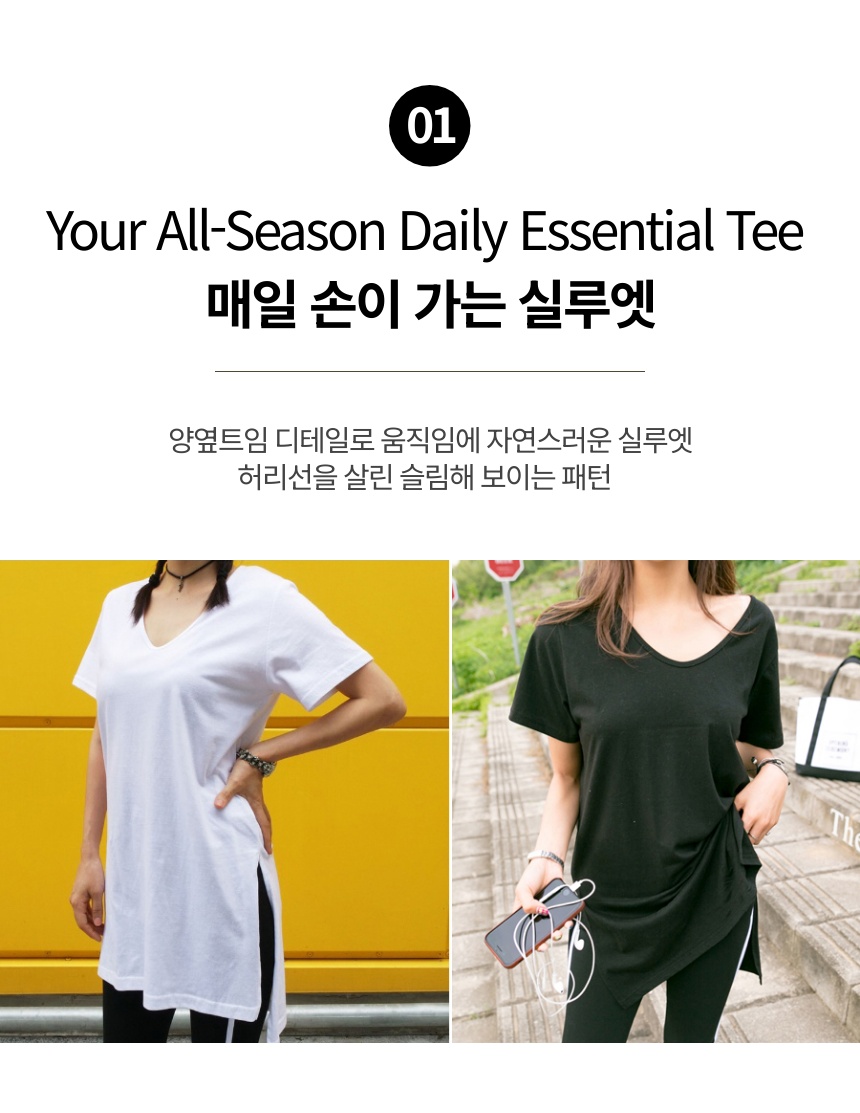 1. 👚 고퀄리티 면 양트임 롱 티셔츠 - 16년 제조 노하우로 완성된 편안한 여성용 롱기장 티셔츠 2. ✨ 단독 및 레이어드 완벽 핏 - 힙을 덮는 안정된 기장과 깊은 사이드 트임으로 우아한 실루엣 연출 3. 🎁 D2C 합리적 가격 제공 - 제조사 직거래로 프리미엄 티셔츠를 와디즈 한정특별가에 선보임