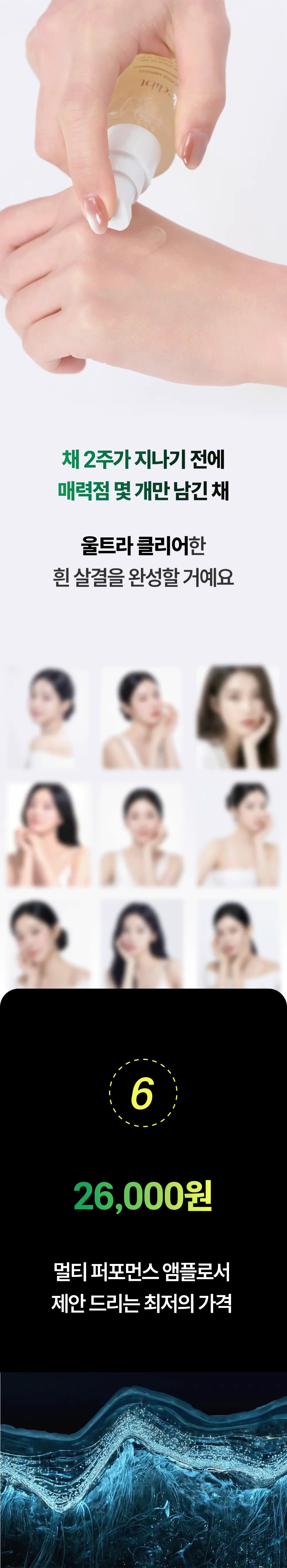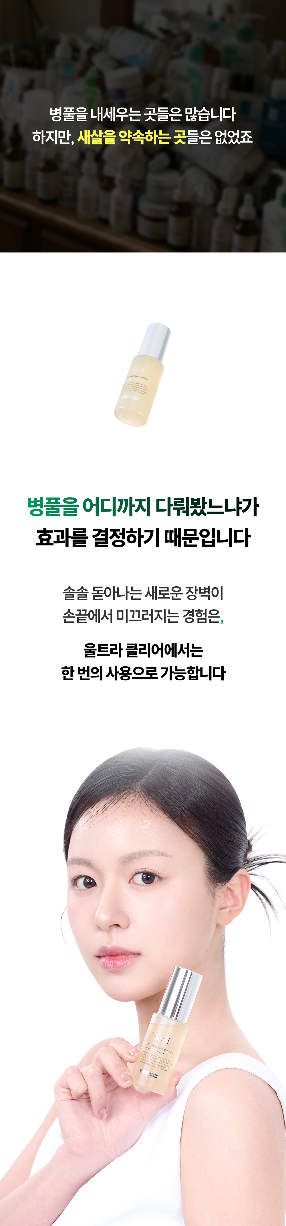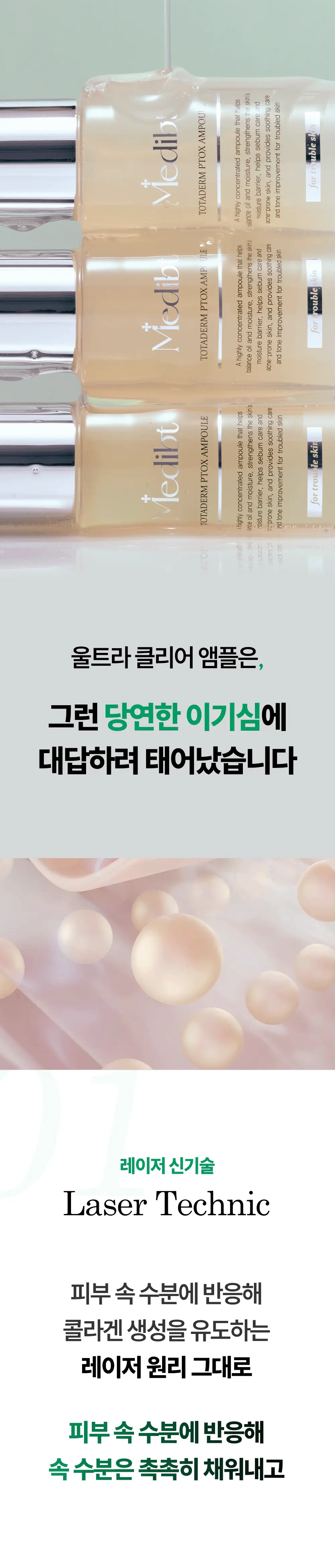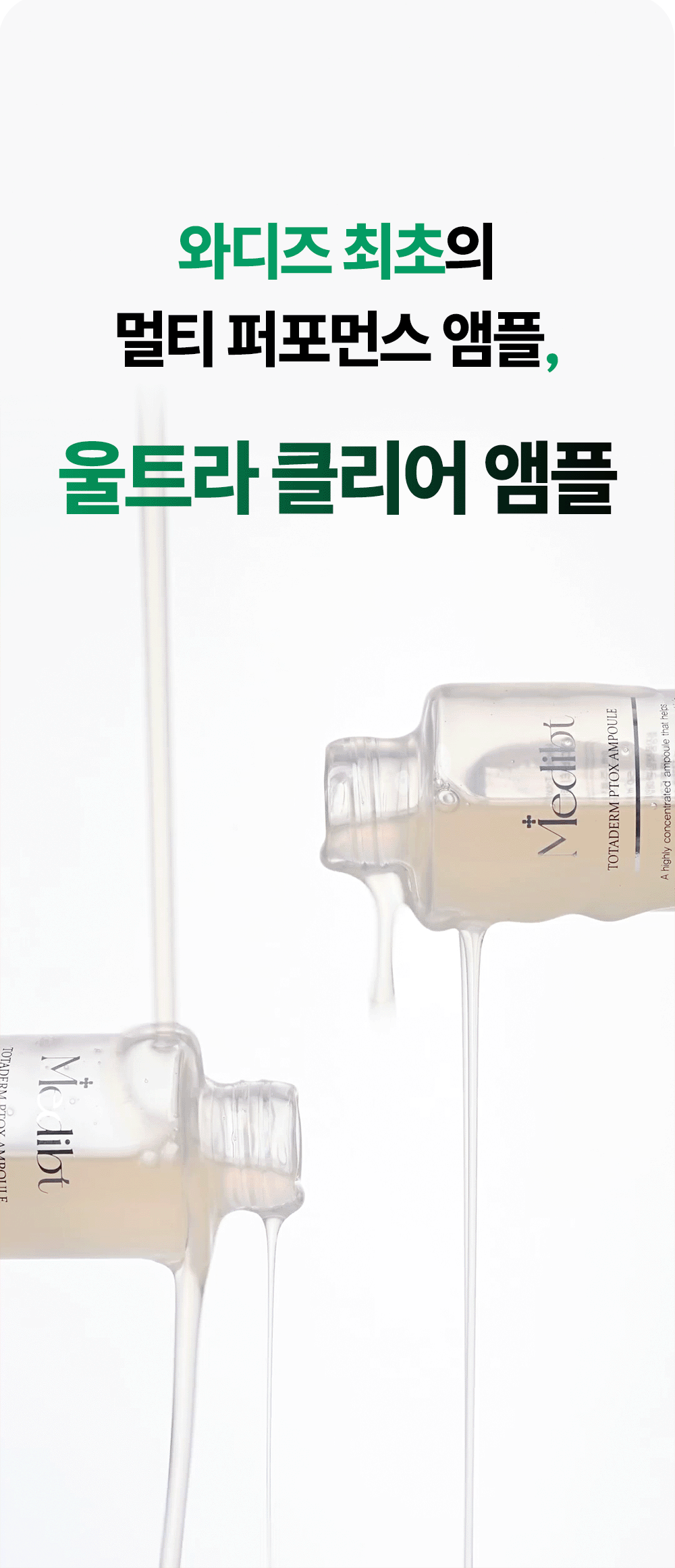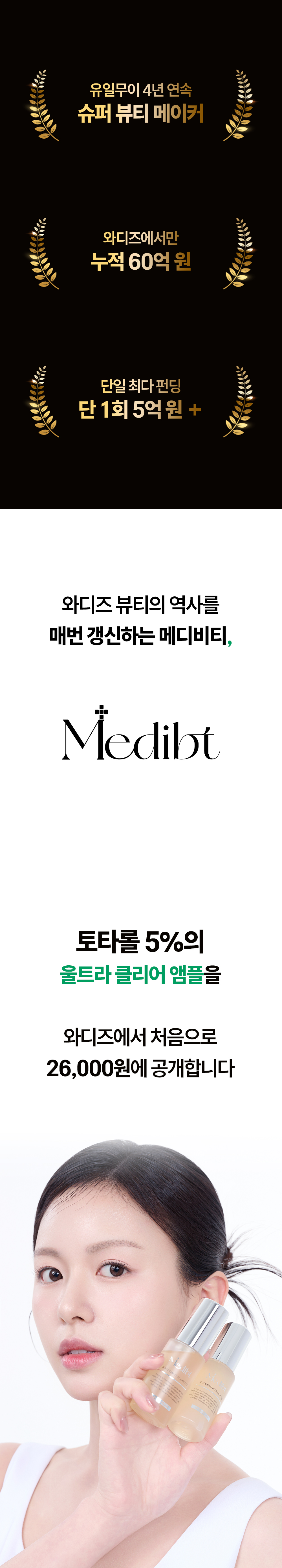 홈쇼핑에서 소위 말하는 '대박'이 난 이후, MD분들의 러브콜이 쏟아집니다. "이번 신제품은 꼭 여기에서 런칭시키자!" 하고요. 하지만 메디비티와 뜻을 같이해 주시는 분들은 와디즈밖에 없는 걸요. 정말 오랜만에 선보이는 울트라 클리어 앰플을 와디즈에서 선보이는 게, 메디비티에게는 홈쇼핑 '대박 매출'보다 훨씬 소중합니다.