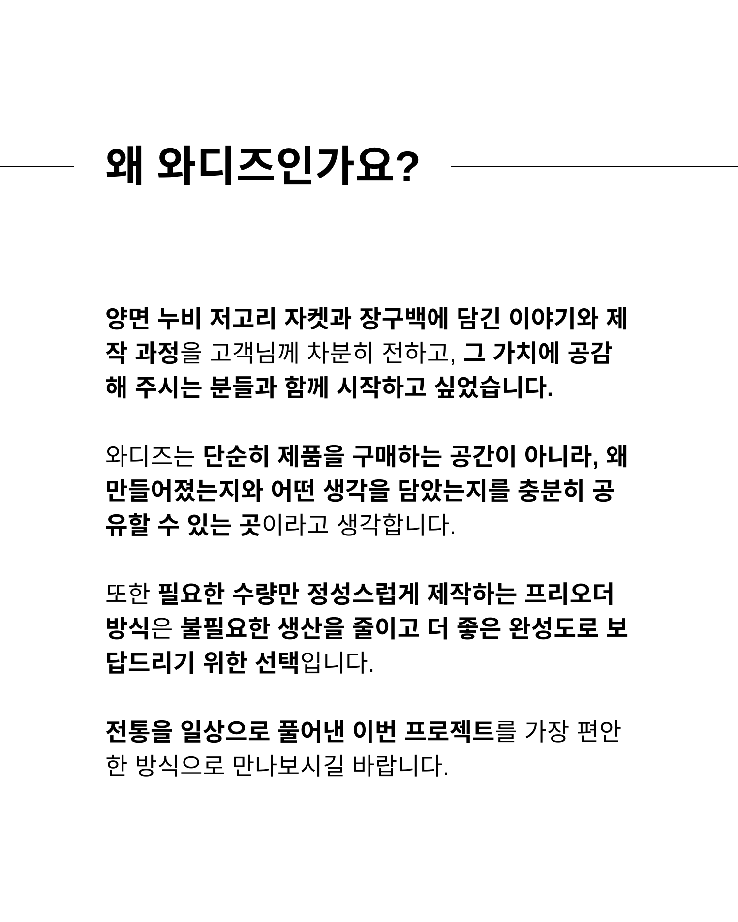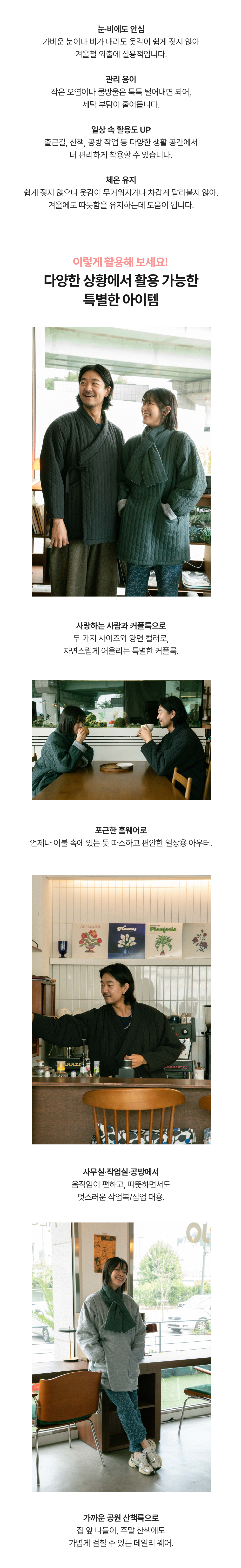 1. 👘 양면 누비 저고리 자켓 - 전통 누비 저고리 디자인을 현대적으로 재해석한 양면 아우터 2. 🎨 일상 속 전통미 - 특별한 날 아닌 일상에 자연스러운 전통의 미감 스며듦 3. 🎁 한정 할인 및 무료배송 - 한정 수량 할인과 무료배송, 우선배송 혜택 제공