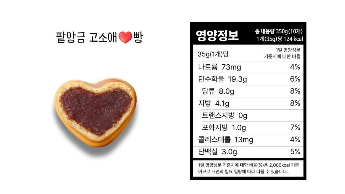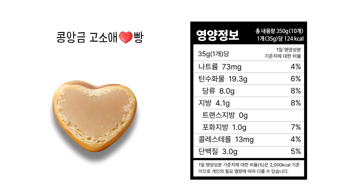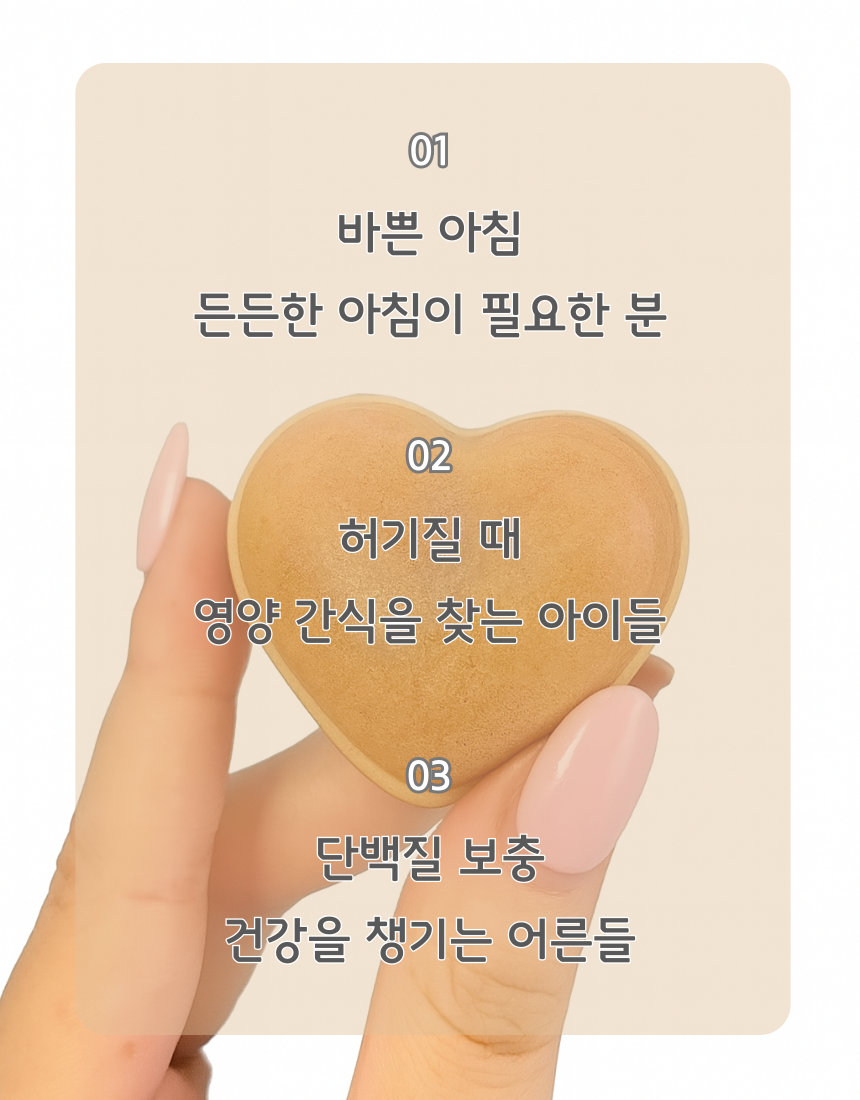 고소애💛빵 1개에는 약 3g의 단백질이 들어 있습니다. 그래서 4개를 먹으면 계란 2개와 비슷한 단백질을 섭취할 수 있어요. 달콤한 간식을 먹으면서 아이들의 성장에 필요한 영양을 챙길 수도 있고, 어른들도 부담 없이 맛있게 먹을 수 있답니다.