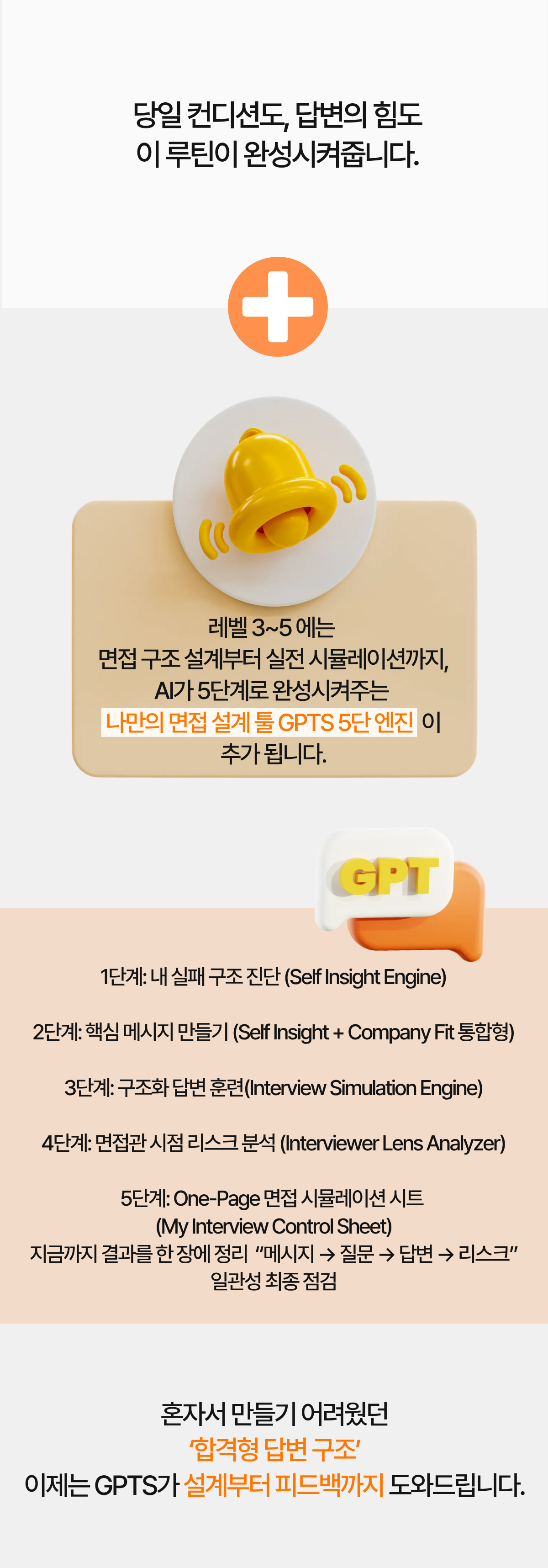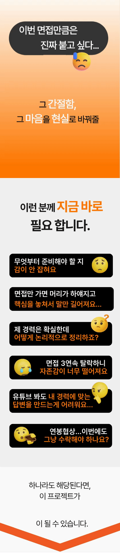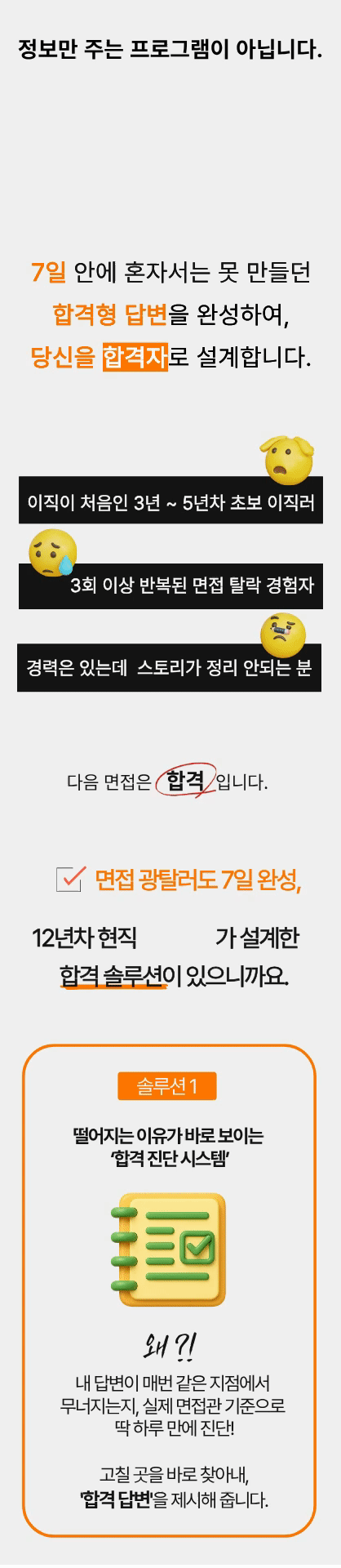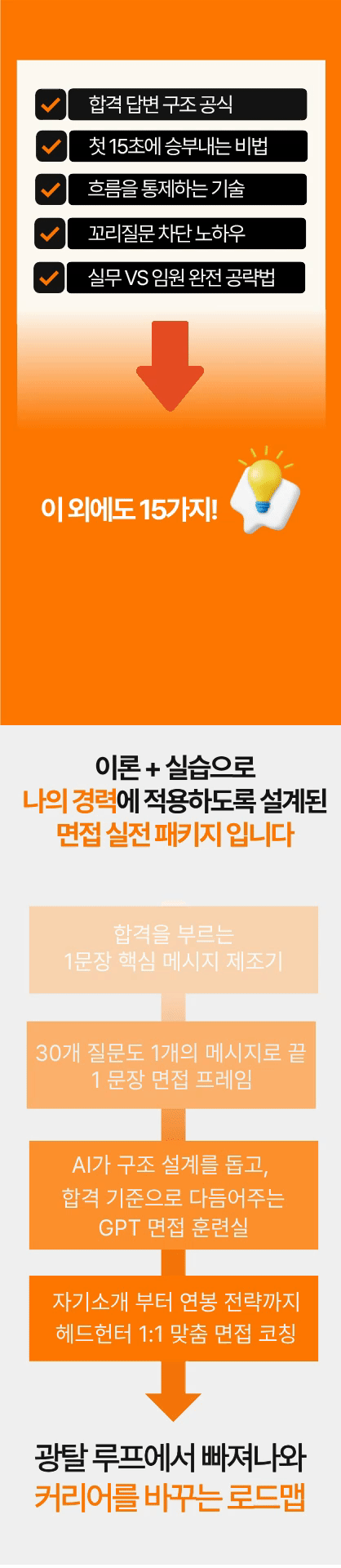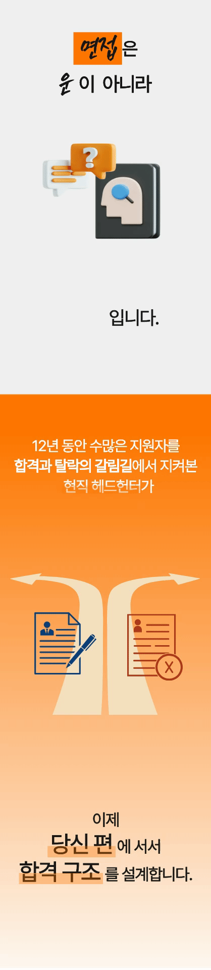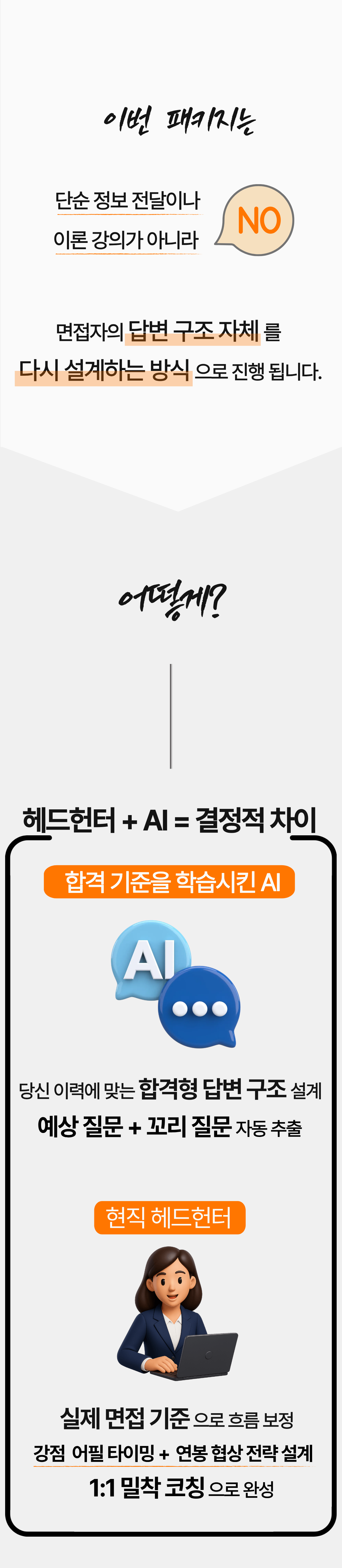 그래서 현장에서 검증한 기준을 학습시킨 AI 도구를 이용해 나만의 답변 구조를 짜고, 현직 헤드헌터의 도움으로 합격 전략을 완성할 수 있는 실전형 ‘합격 매뉴얼’로 완성했습니다.