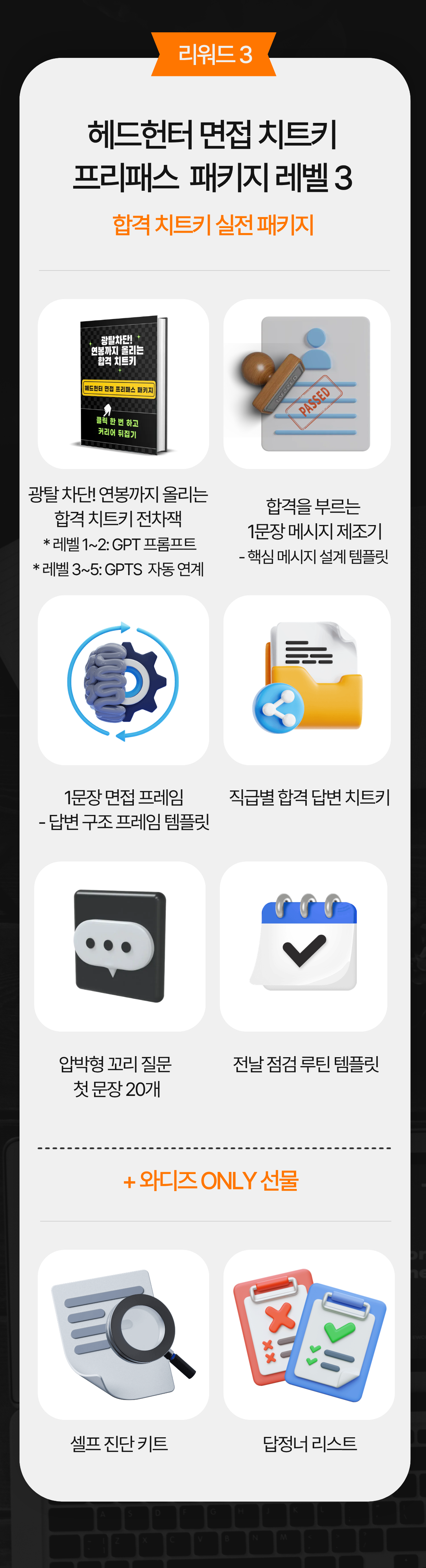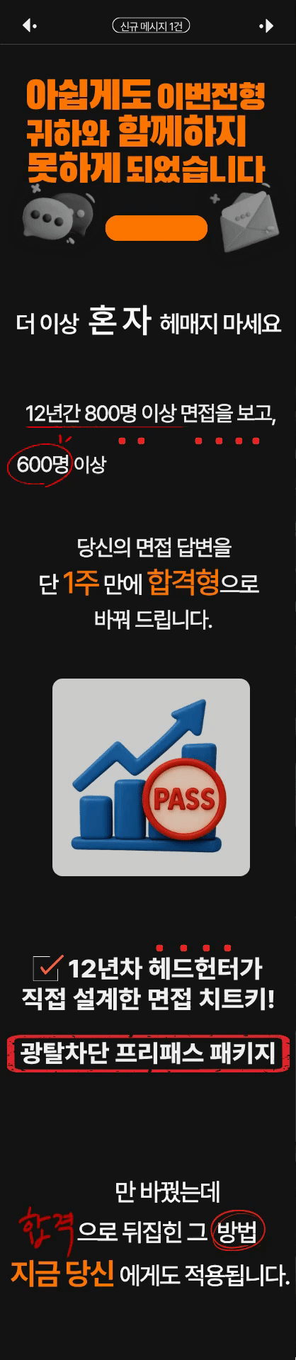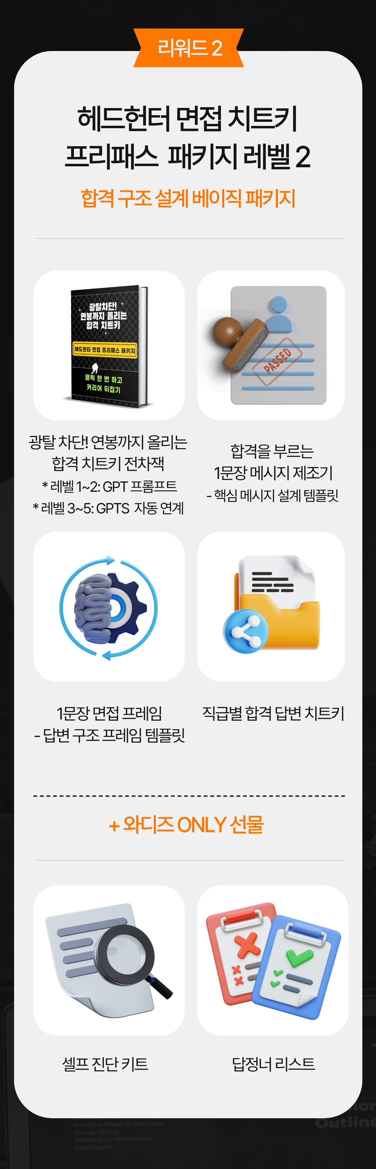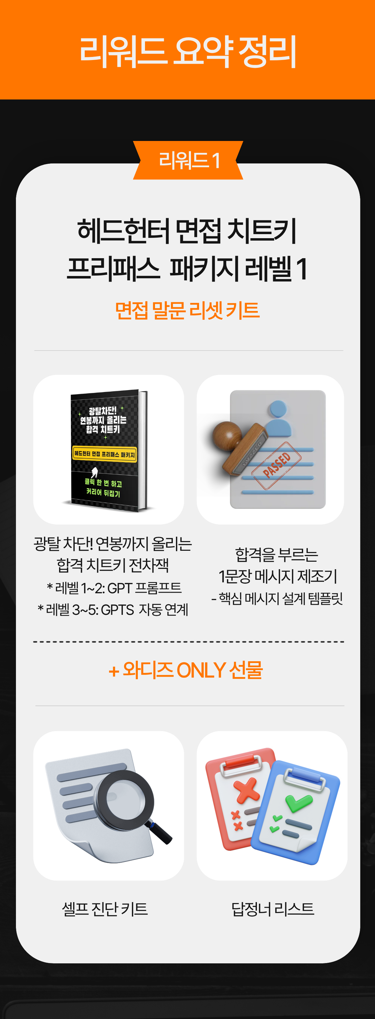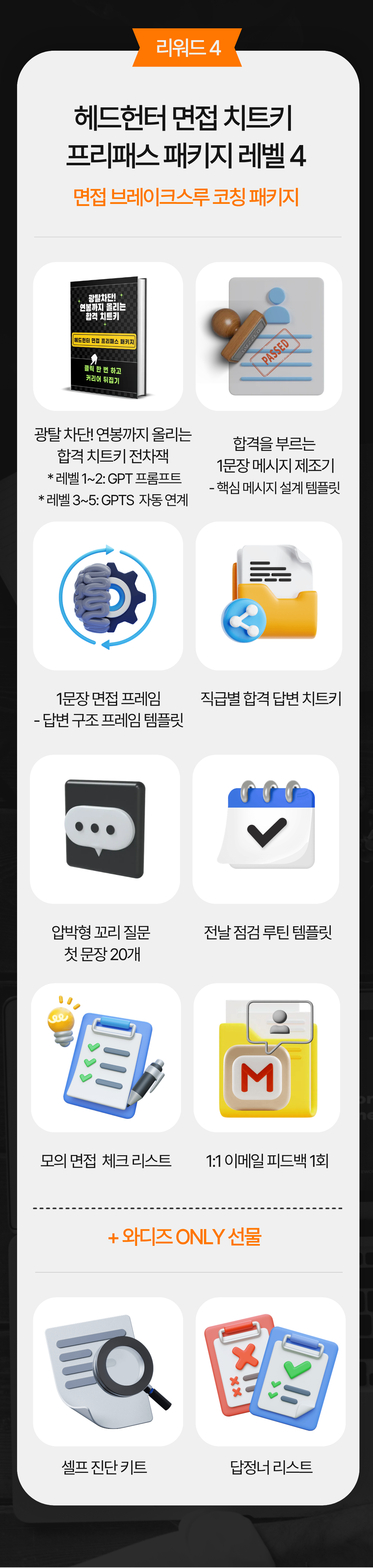그래서 현장에서 검증한 기준을 학습시킨 AI 도구를 이용해 나만의 답변 구조를 짜고, 현직 헤드헌터의 도움으로 합격 전략을 완성할 수 있는 실전형 ‘합격 매뉴얼’로 완성했습니다.