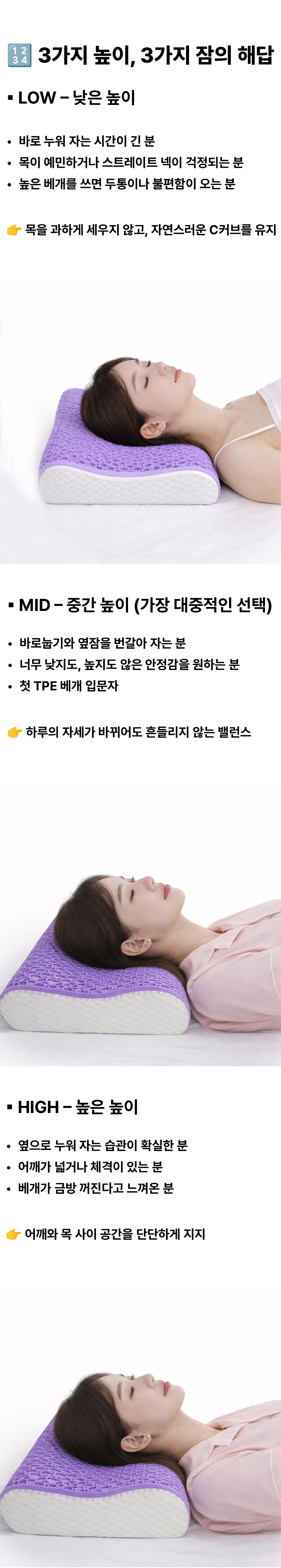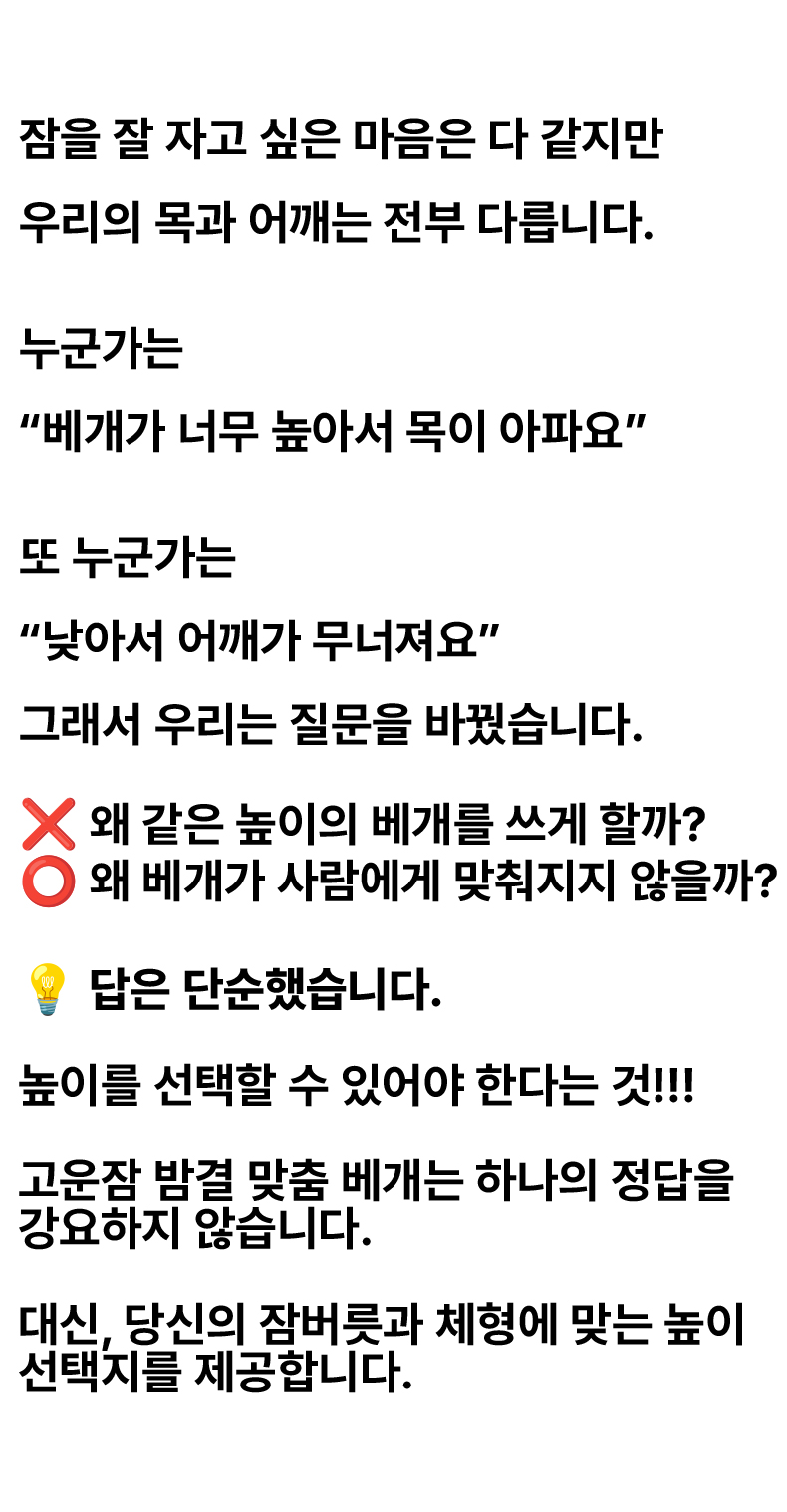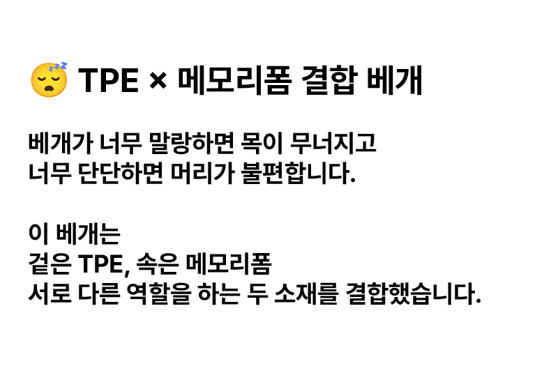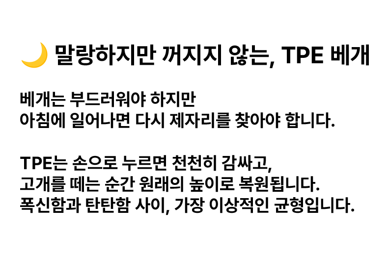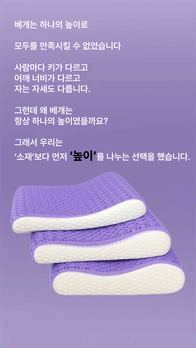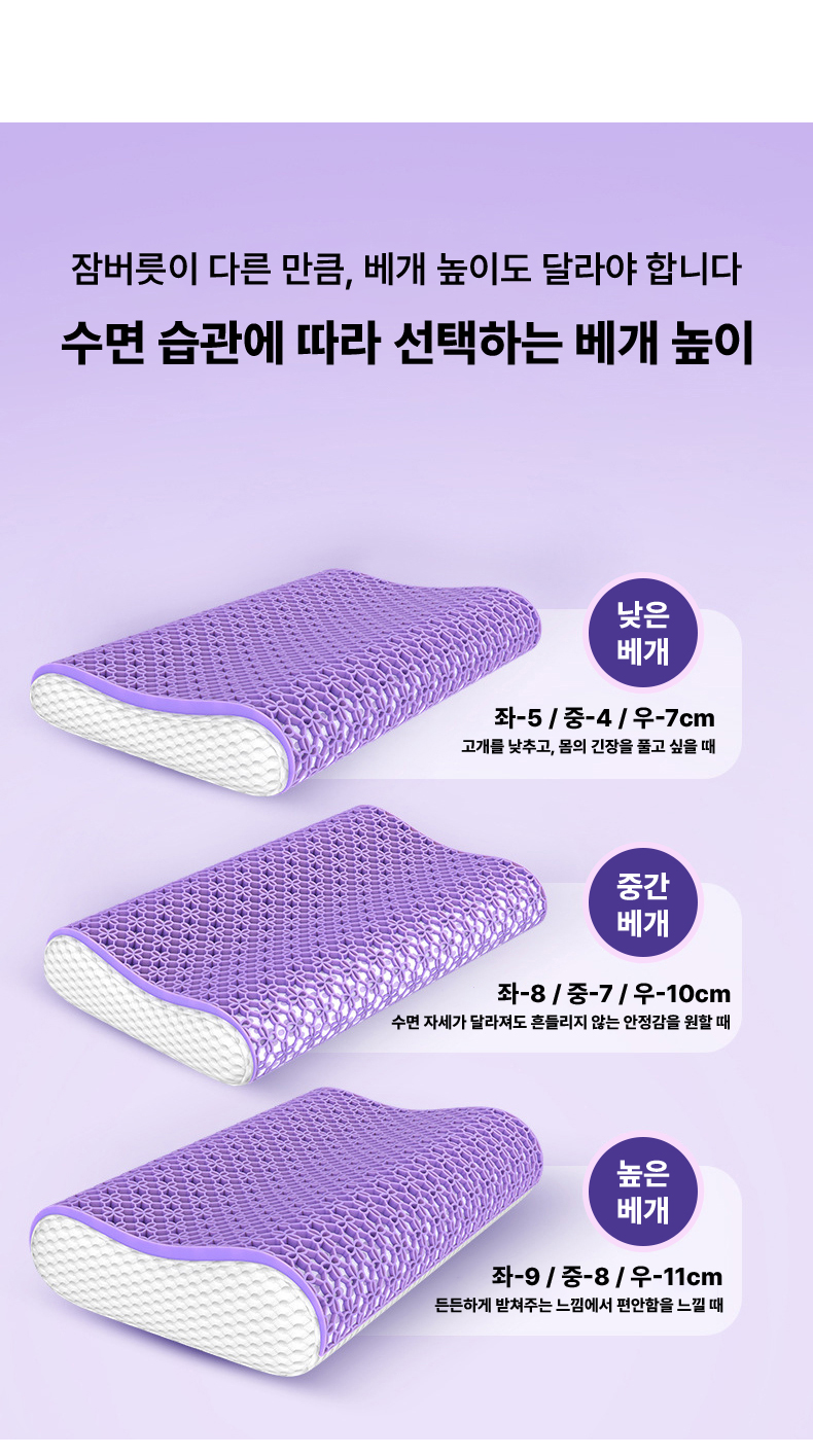 1. 🛏️ 맞춤형 베개 높이 선택 - 낮은·중간·높이 중 체형과 수면 습관에 맞게 선택 가능 2. 🌬️ 통기성 좋은 TPE 구조 - 열과 습기 배출로 쾌적한 잠자리 유지 3. 🎁 분리 세탁 가능한 베개 커버 - 지퍼 탈착식으로 위생적 관리와 편리한 세탁 지원