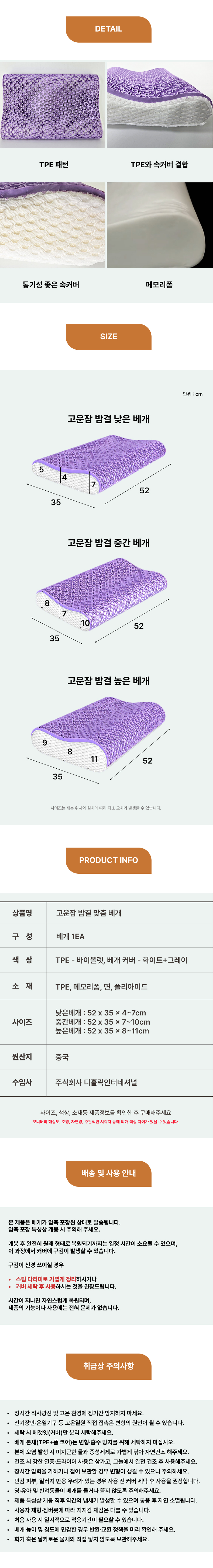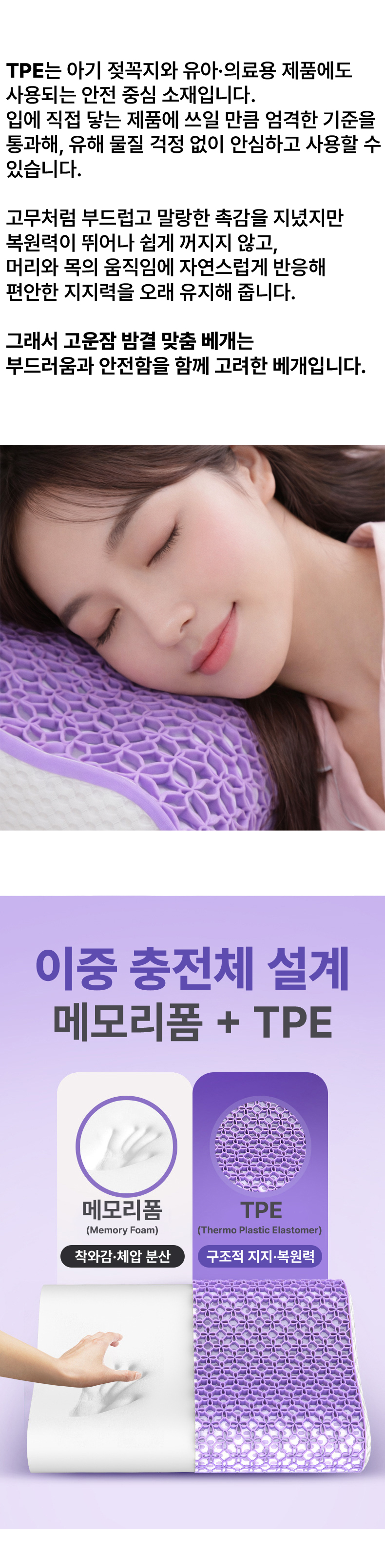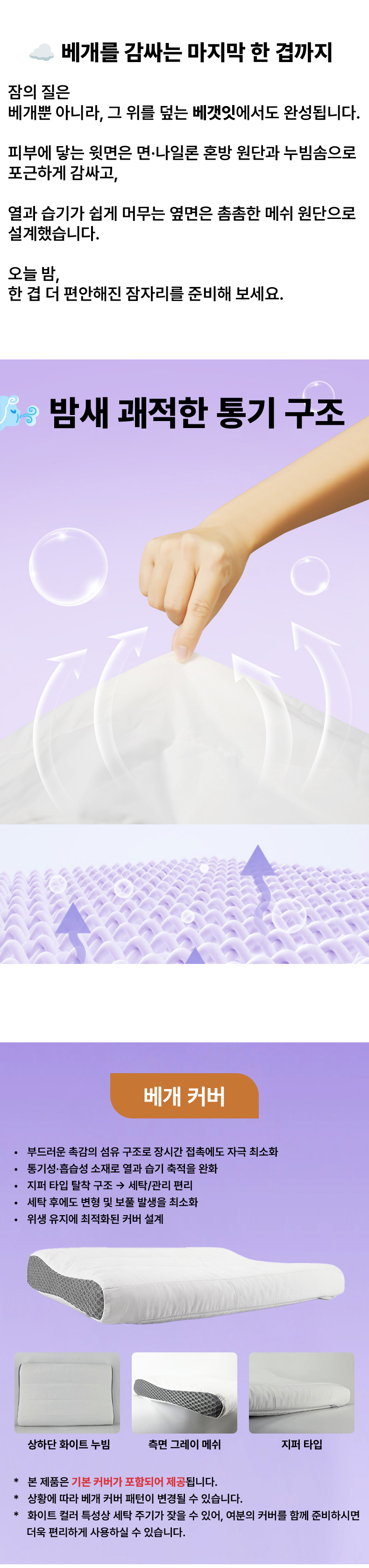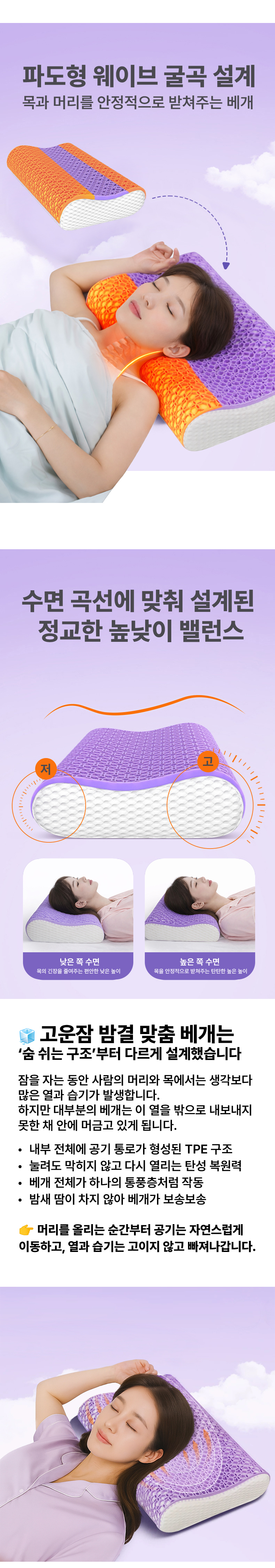 1. 🛏️ 맞춤형 베개 높이 선택 - 낮은·중간·높이 중 체형과 수면 습관에 맞게 선택 가능 2. 🌬️ 통기성 좋은 TPE 구조 - 열과 습기 배출로 쾌적한 잠자리 유지 3. 🎁 분리 세탁 가능한 베개 커버 - 지퍼 탈착식으로 위생적 관리와 편리한 세탁 지원