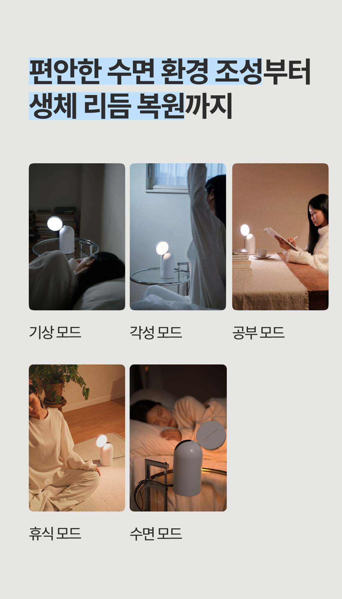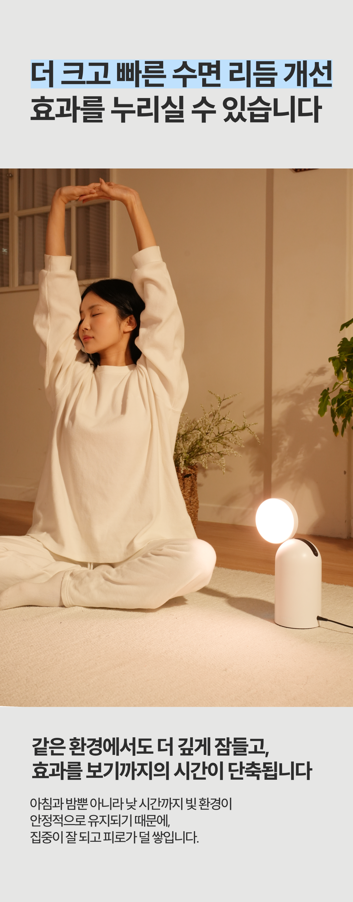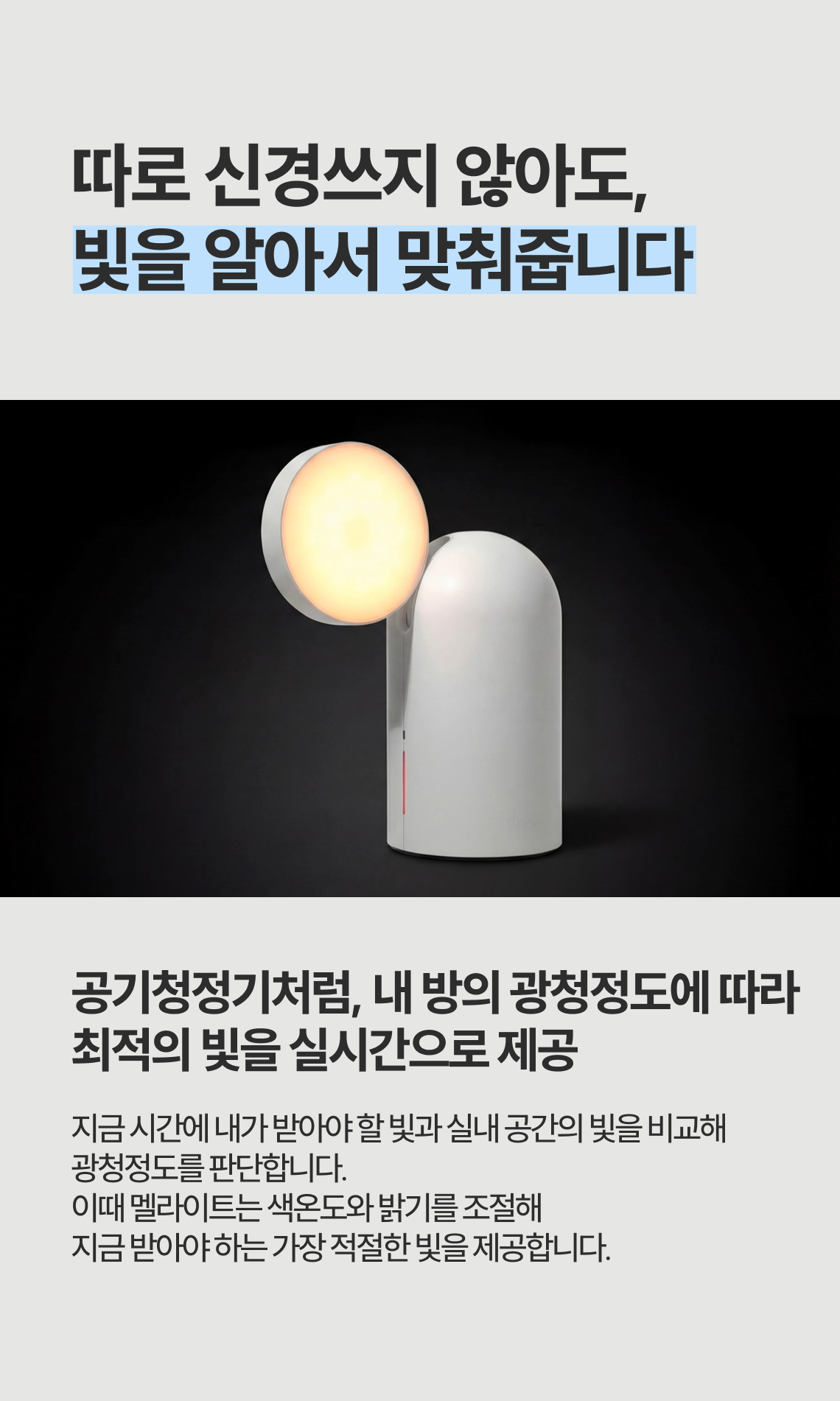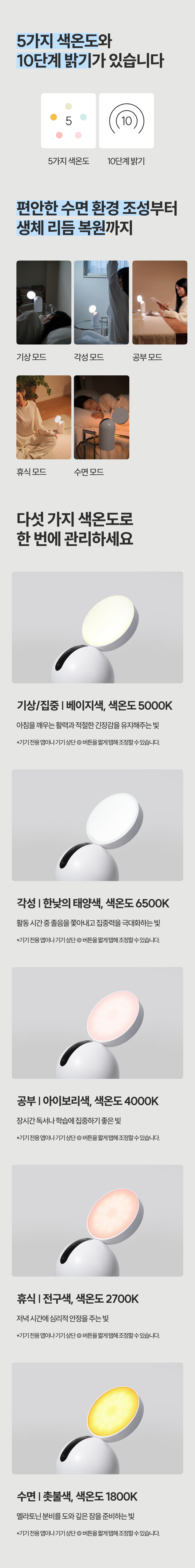 1. 💡 생체 리듬 맞춤형 스마트 조명 - 기상, 각성, 공부, 휴식, 수면 모드 제공 2. 🌙 멜라토닌 분비 조절 수면 솔루션 - 빛으로 자연스러운 수면 유도 및 리듬 복원 3. 🎁 한정 수량 슈퍼얼리버드 할인 - 와디즈 단독 50개 한정 약 38% 할인 제공