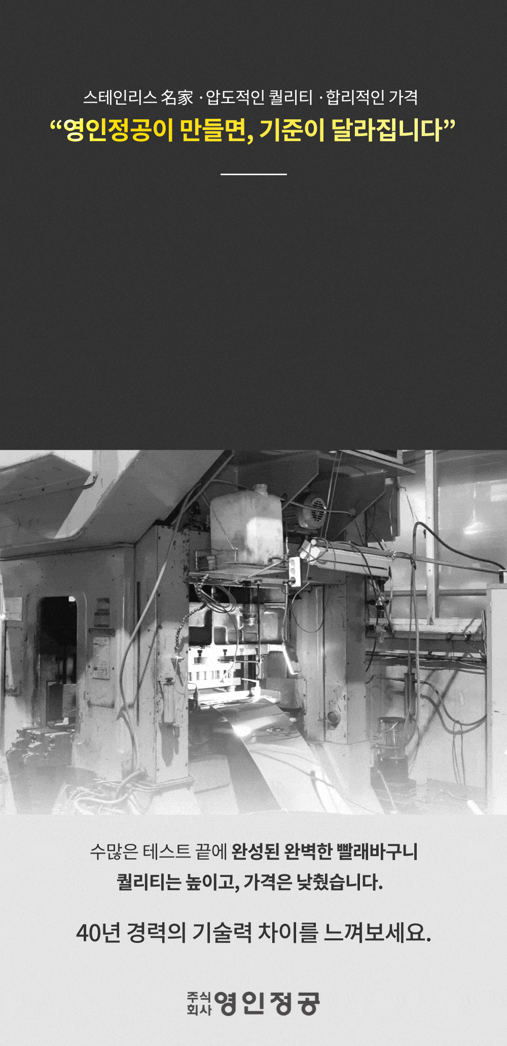 안녕하세요. (주)영인정공 대표 최순철 입니다. 영인정공은 지난 40년간 금속 유형 제조업에 대한 경험과 기술적인 혁신을 바탕으로 제품 개발에 전념해 왔습니다. 우리는 주방용품, 생활용품에 대한 지속적인 도전과 열정을 통해 비약적인 발전을 이루어 왔습니다. 주방용품, 생활용품 제조사인 (주)영인정공을 필두로 해외 협력업체 영인테크비나 및 국내 협력업체로 판매제품을 제조하는 (주)인우아이엔씨와 함께 국내 시장의 석권을 넘어 세계 시장을 향해 계속 발전해 나아가고 있습니다. 고객만족과 품질혁신, 그리고 시대의 트랜드를 따르는 창조적이고 세련된 디자인 개발로 국내 주방용품, 생활용품 산업에서 선도적인 역할을 해왔습니다. 세계 최고 기업으로 성장하기 위하여, 오늘도 최선을 다하고 있습니다.