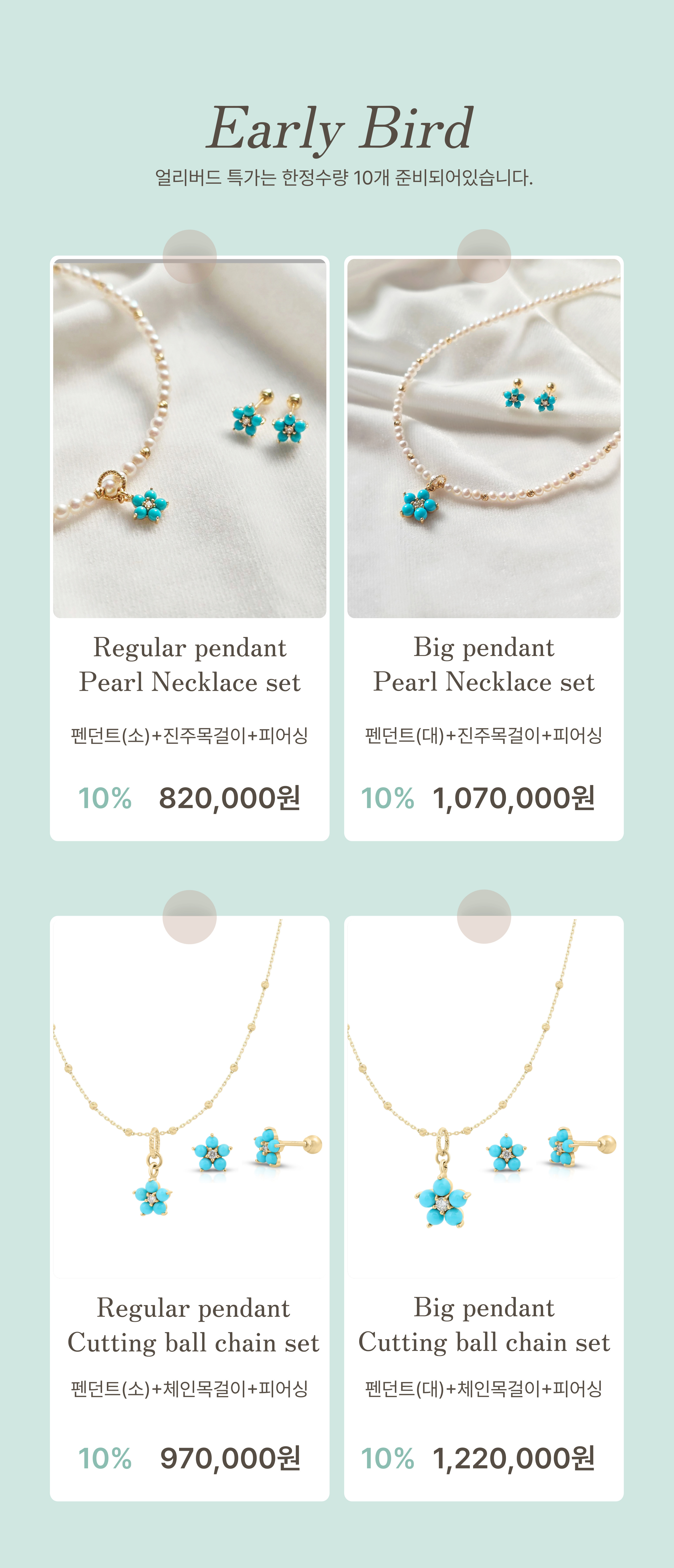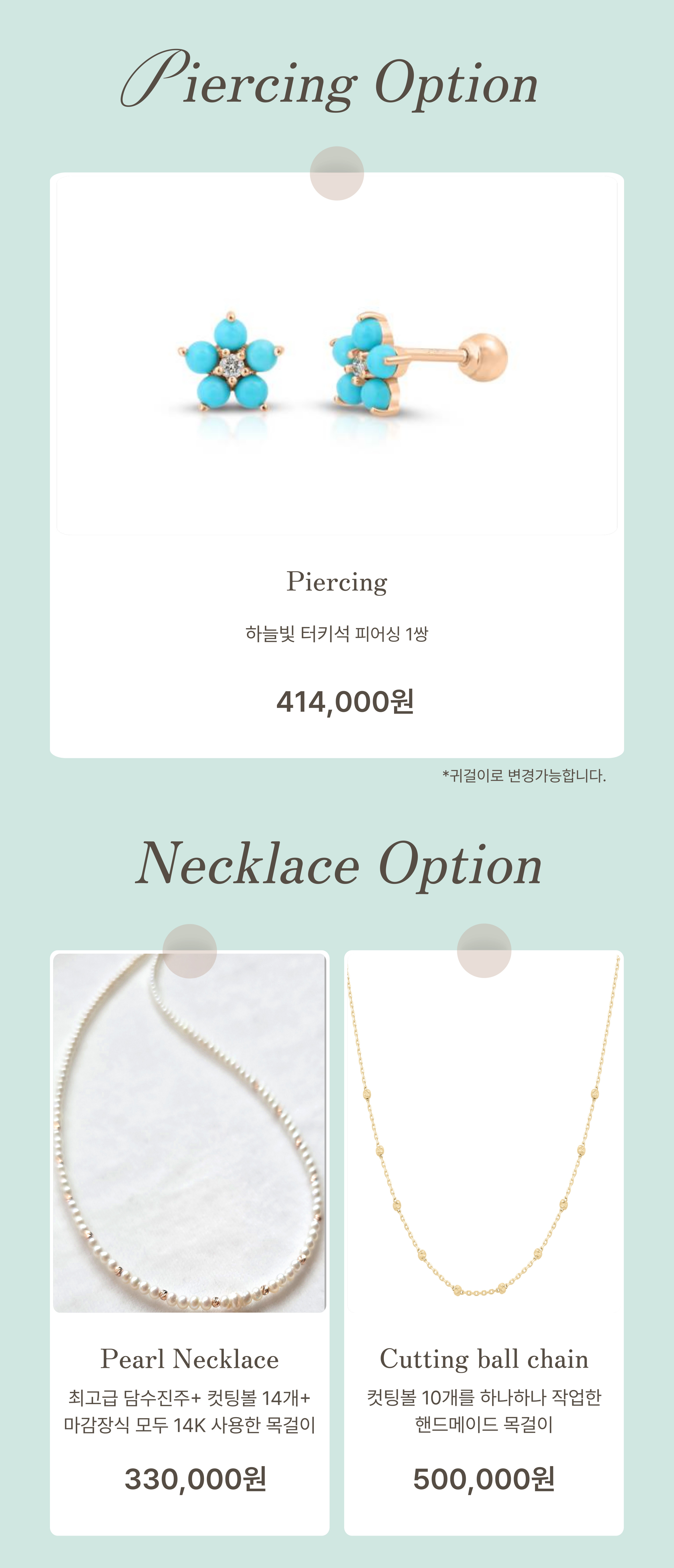 특히나 진주와 터키석은 예민한 보석이기 때문에 세척제를 사용해서 세척하시는 것은 절대 금합니다! 착용 중 보석이 탁해지거나 광이 사라질 수 있어 부드러운 천으로 살살 닦아서 보관하실 것을 권장해 드립니다. 진주가 마모되어 와이어가 보이거나 제품 수선이 필요할 경우 A/S 맡겨주시면 다시 새것처럼 깨끗하게 수선이 가능합니다.