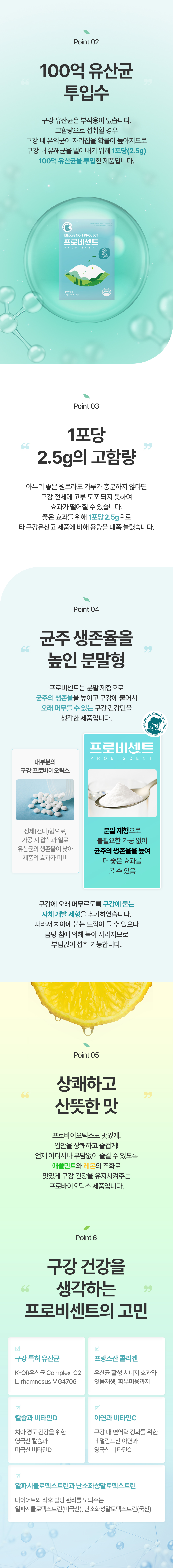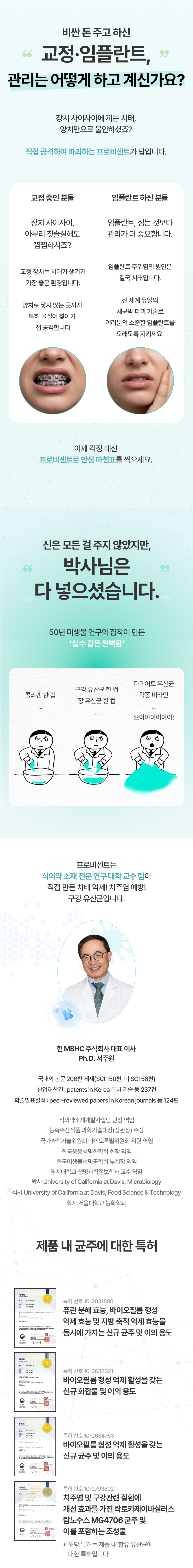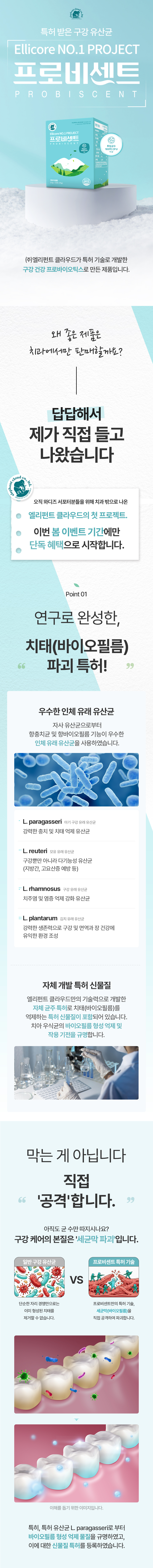 1. 🦷 구강유산균 엘리코어 - 자기전 1포로 구강 코어를 세우는 특허 구강유산균 2. 🛡️ 바이오필름 제거 설계 - 세균막 생성 억제와 제거를 겨냥한 치과 전용 기술 3. 🎁 특허 기술 첫 공개 - 답답해서 직접 가져온 치과 전용 기술의 프로젝트 공개