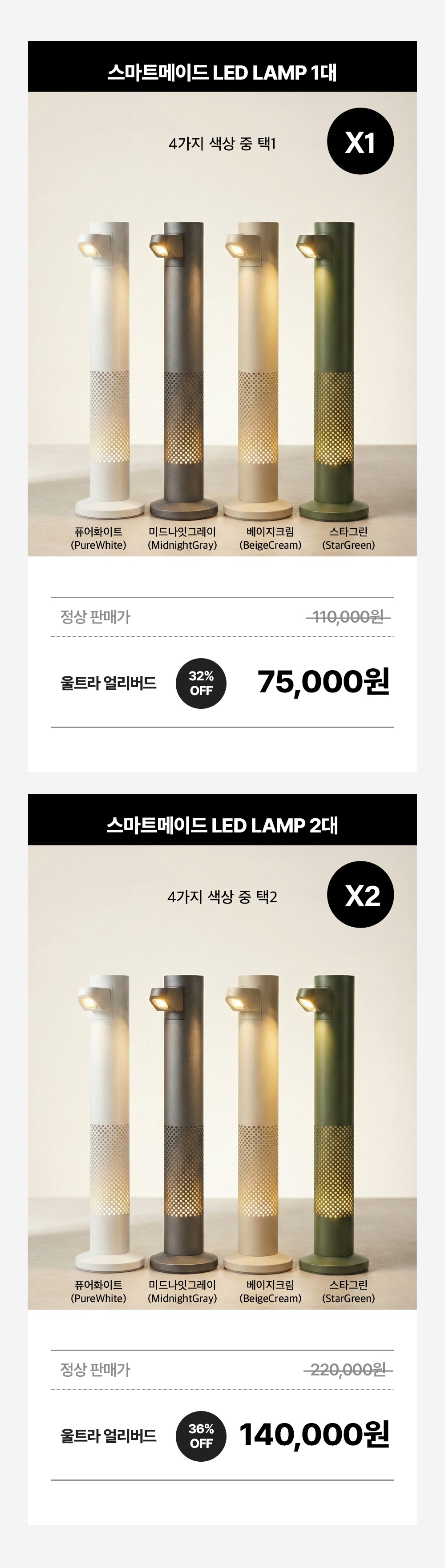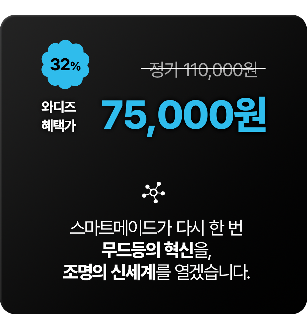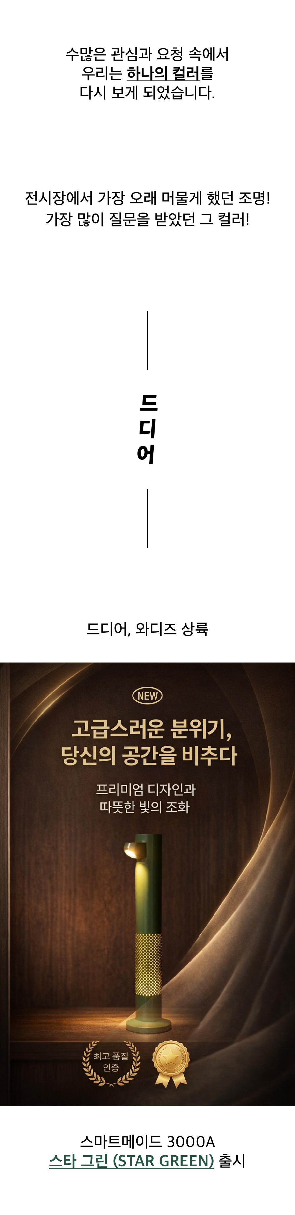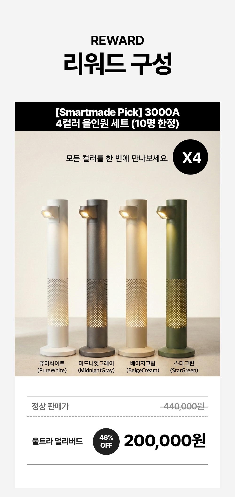 특히, 이번 펀딩에서는 와디즈에서 반응이 좋았던 2000시리즈에 이어, 3000A 모델을 출시하게 되었습니다. 조명은 인테리어의 핵심이기도 하지만, 동시에 일상의 대부분을 같이 보내는 친숙 한 파트너의 역할도 합니다. 좋은 조명을 실용적으로 만드는 것! 이것이 스마트메이드가 제공하는 가치이며, 이를 통해 좋은 공간을 만들고, 그 공간 안에서 건강도 가꾸는 라이프스타일을 경험 할 수 있습니다.