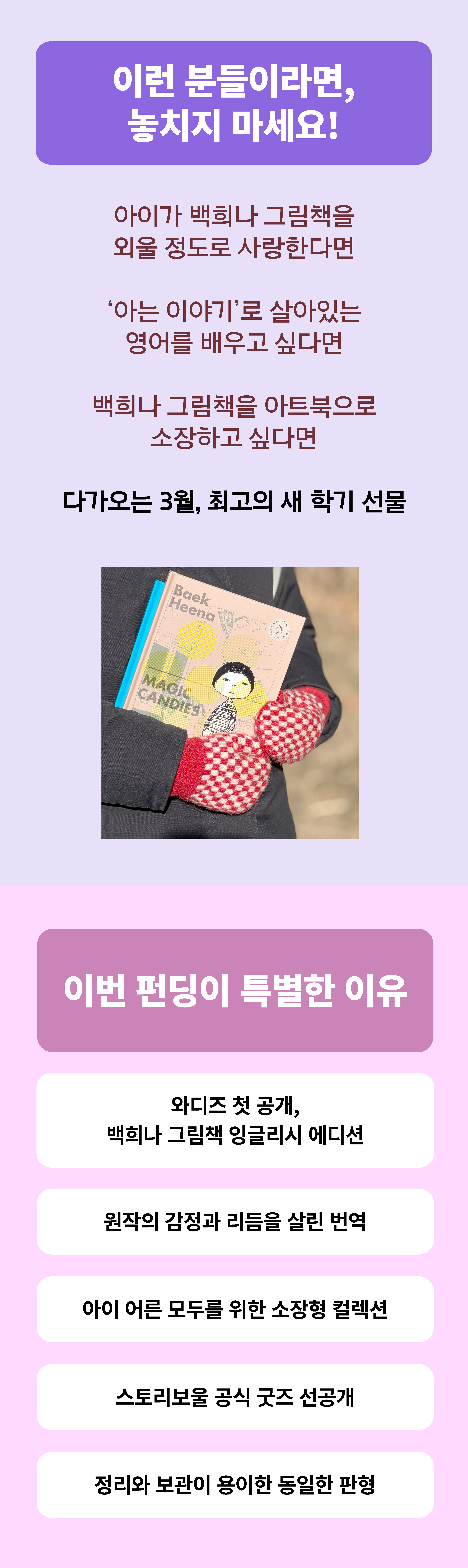 우리는 단순히 영어로 바뀐 책이 아니기를 바랐습니다. 이야기 그대로의 감동을 영어로 다시 만나는 순간, 또 하나의 문학적 경험으로 완성되기를. 소리 내어 읽었을 때 자연스럽게 이어지는 문장, 아이가 들고 다니기 편한 핸디한 판형, 침대 머리맡에서 한 손으로도 펼칠 수 있는 무게,어른도 소장하고 싶은 아트북의 매력, 그리고 읽기의 부담을 덜면서 이야기 속으로 더 깊이 들어가게하는 ‘듣는 경험’까지. 하나도 놓치고 싶지 않았지요. 그래서 과정은 느렸습니다. 지난 시간 동안 번역과 디자인, 구성은 수없이 수정되었고 정답 없는 선택을 반복했습니다. 아이부터 어른까지 오래 곁에 두고 싶은 백희나 그림책을 온전히 전하는 과정, 이제 그 마지막 단계를 서포터 여러분과 함께 완성하고 싶습니다.