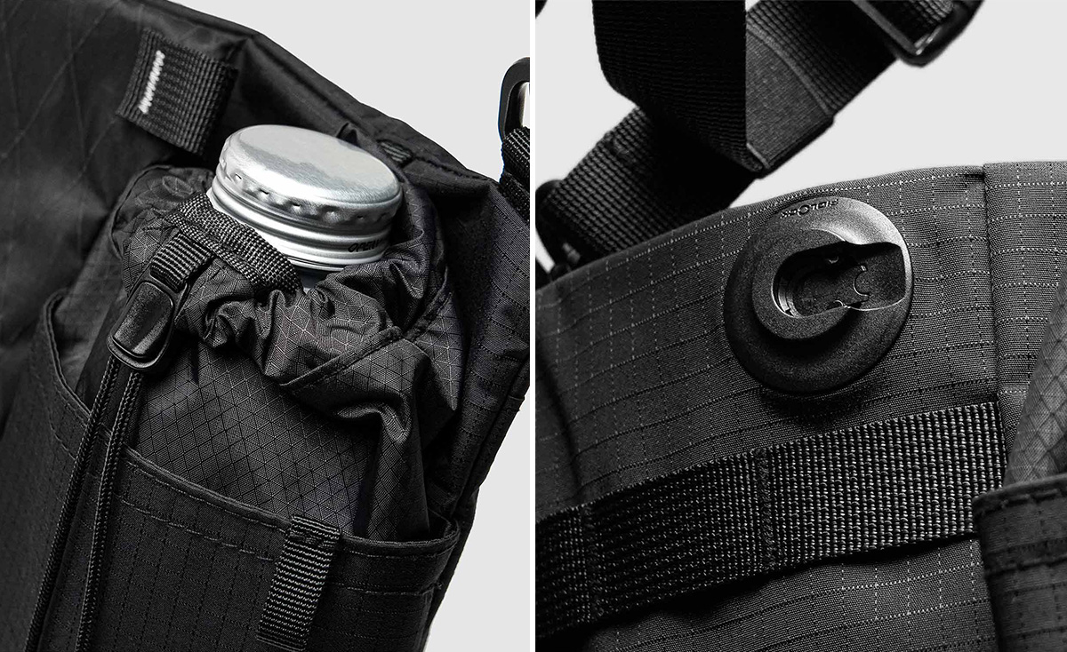 오른쪽에는 조임끈이 달린 포켓이 있어 물병이나 작은 우산을 간편하게 수납할 수 있으며