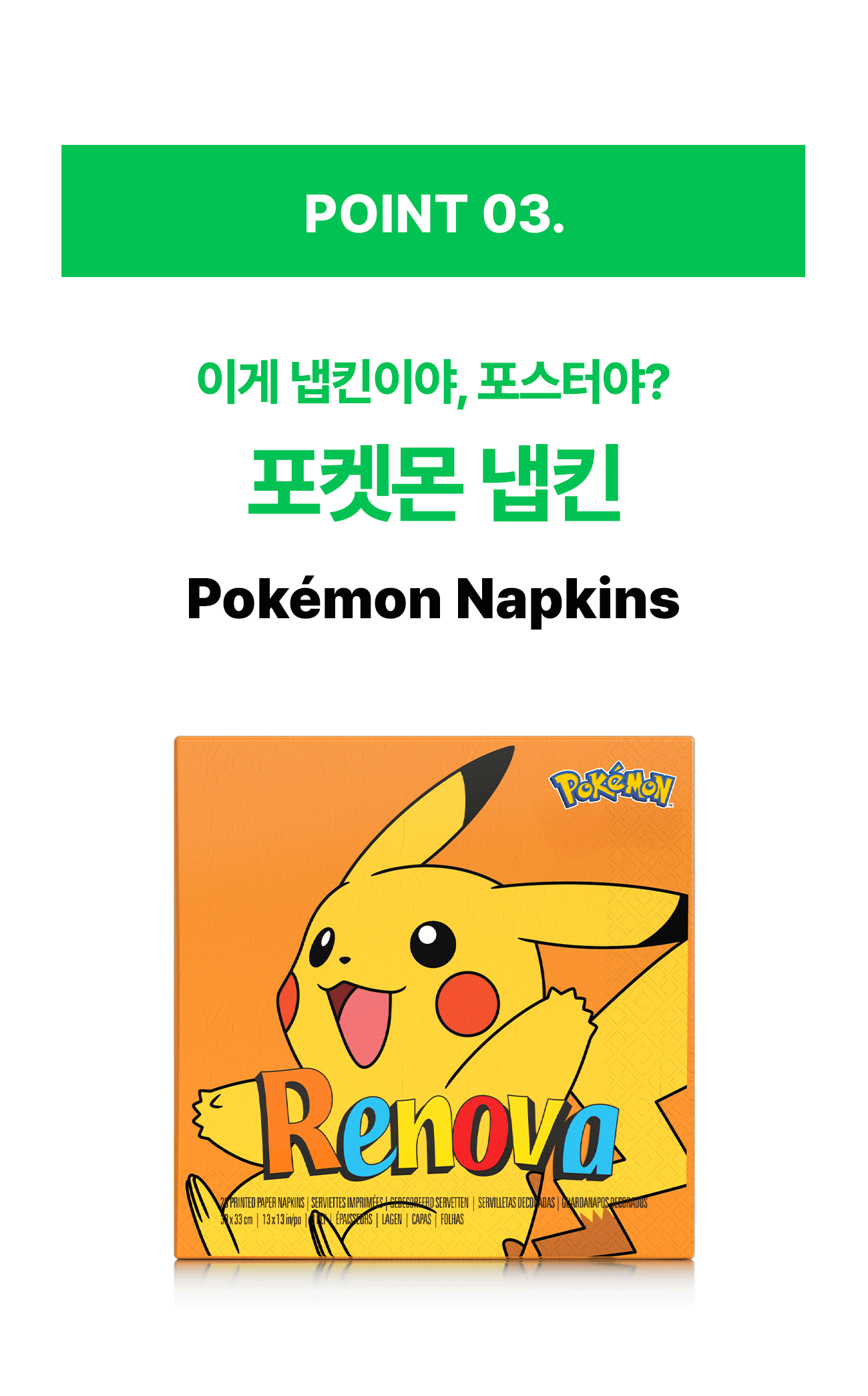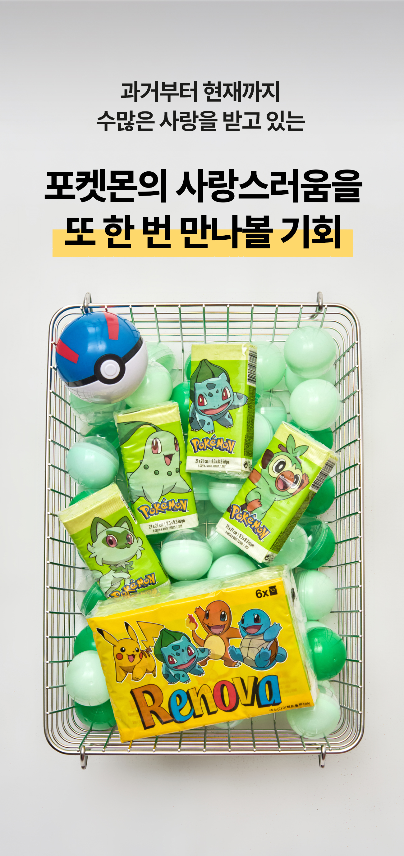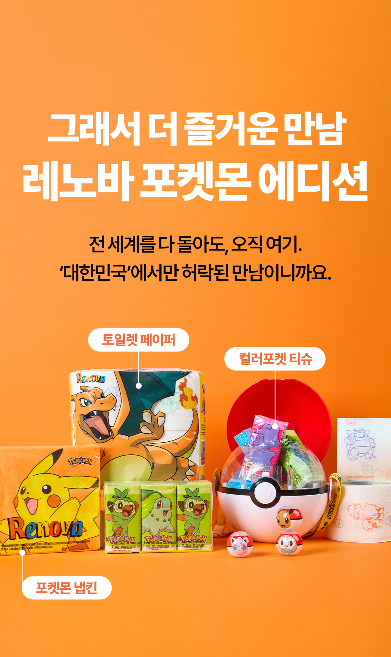 레노바(Renova)는 유럽에서 시작된 프리미엄 티슈 브랜드로, 생활용품에 디자인과 감성을 더해온 글로벌 기업입니다. 단순한 기능을 넘어 ‘일상을 디자인한다’는 철학으로 컬러 티슈 시장을 개척하며 차별화된 브랜드 이미지를 구축해왔습니다. 오랜 제지 산업의 역사와 기술력을 바탕으로 품질 중심의 제품을 선보이고 있습니다. 또한 지속 가능한 산림 관리 원칙에 따라 FSC® 인증 원료를 사용하는 등 친환경 생산 체계를 갖추고 있습니다. 환경 기준을 준수한 제조 공정과 에너지 효율 개선을 통해 지속 가능한 경영을 실천하고 있습니다. 레노바는 소비재도 문화가 될 수 있다고 믿습니다. 이번 포켓몬 에디션 역시 그 철학에서 출발한 프로젝트입니다. 일상에서 가장 자주 사용하는 티슈에 설렘과 놀이의 요소를 더해 새로운 경험을 제안합니다. 기능적 소비를 넘어 감성과 추억을 담는 브랜드, 그것이 레노바가 추구하는 방향입니다.