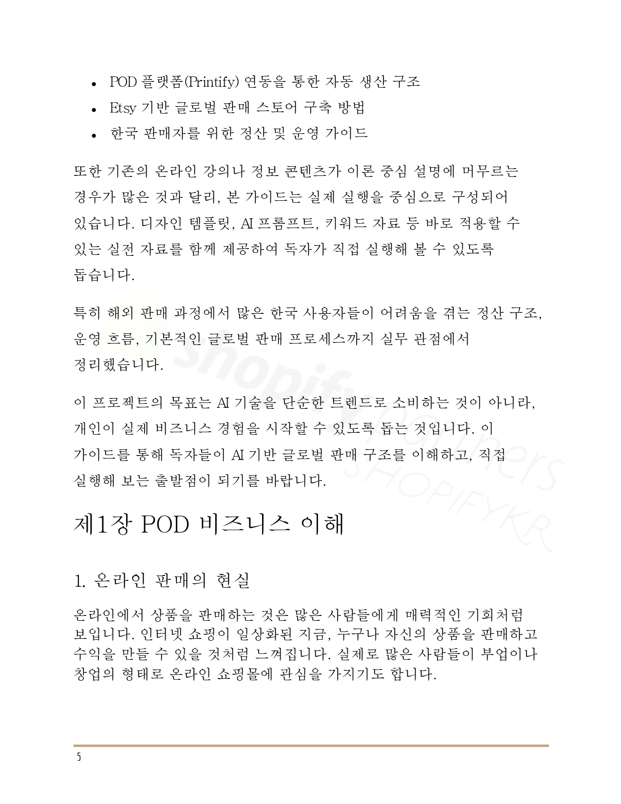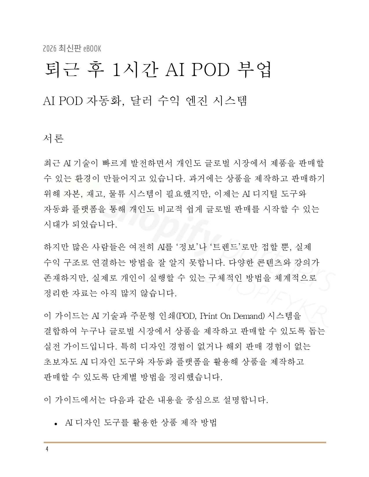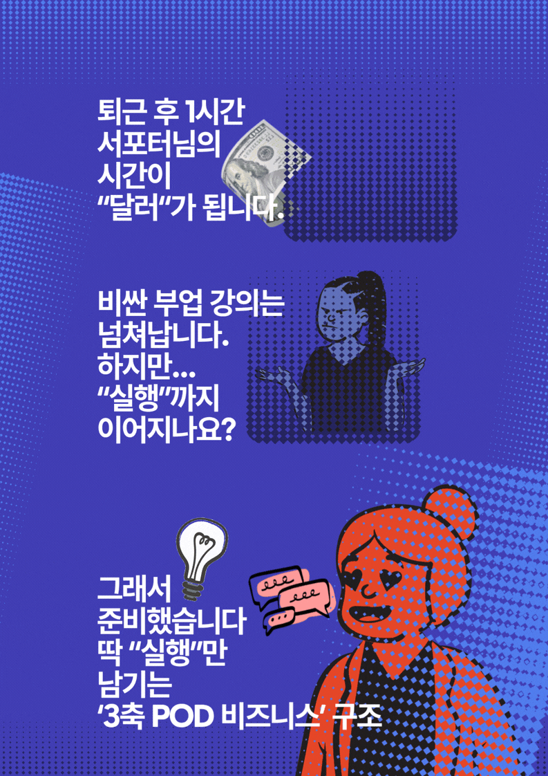 이 전자책 한 권을 통해 글로벌 POD 시스템의 핵심 구조를 이해하고, 실제 실행까지 이어질 수 있도록 구성했습니다. 과거에는 여러 강의와 경험이 필요했던 과정이, 이제는 AI를 통해 훨씬 간결해졌습니다.