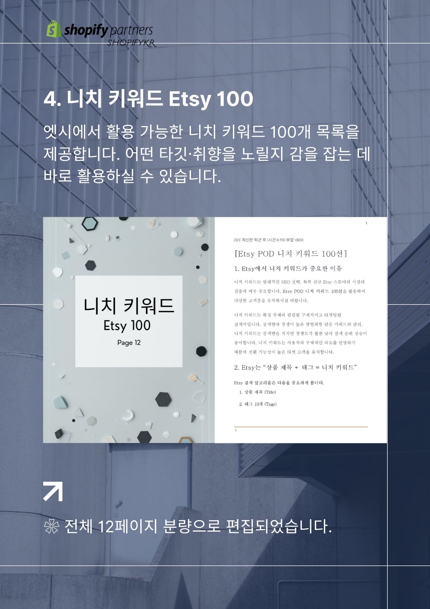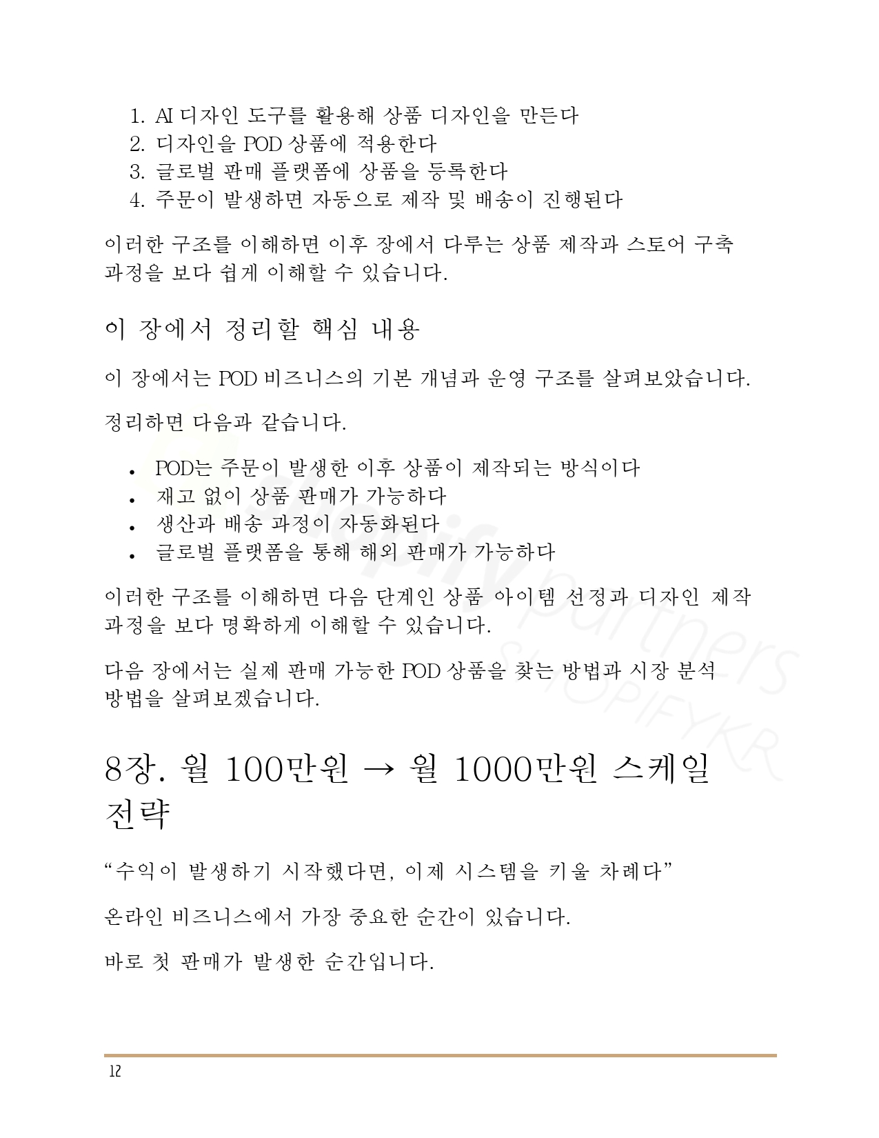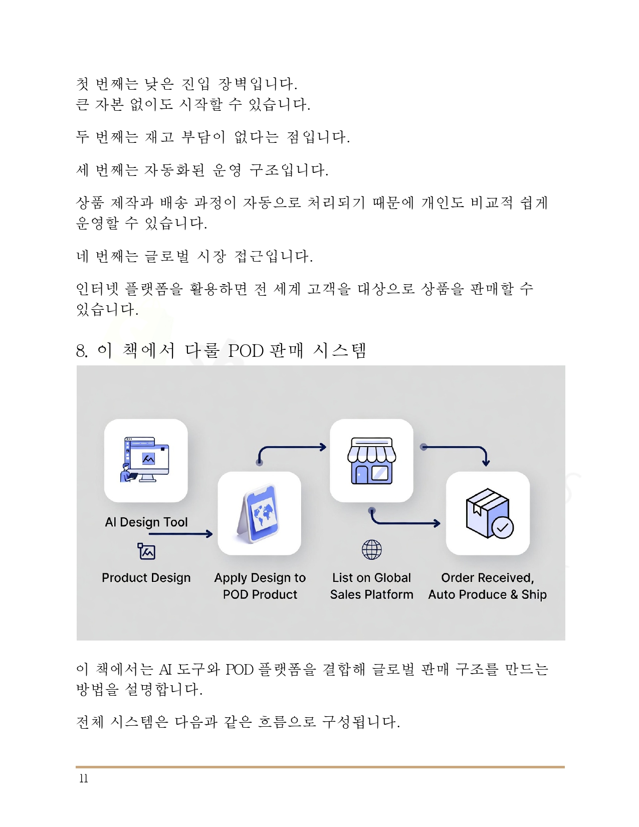 이 전자책 한 권을 통해 글로벌 POD 시스템의 핵심 구조를 이해하고, 실제 실행까지 이어질 수 있도록 구성했습니다. 과거에는 여러 강의와 경험이 필요했던 과정이, 이제는 AI를 통해 훨씬 간결해졌습니다.