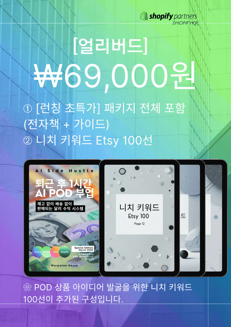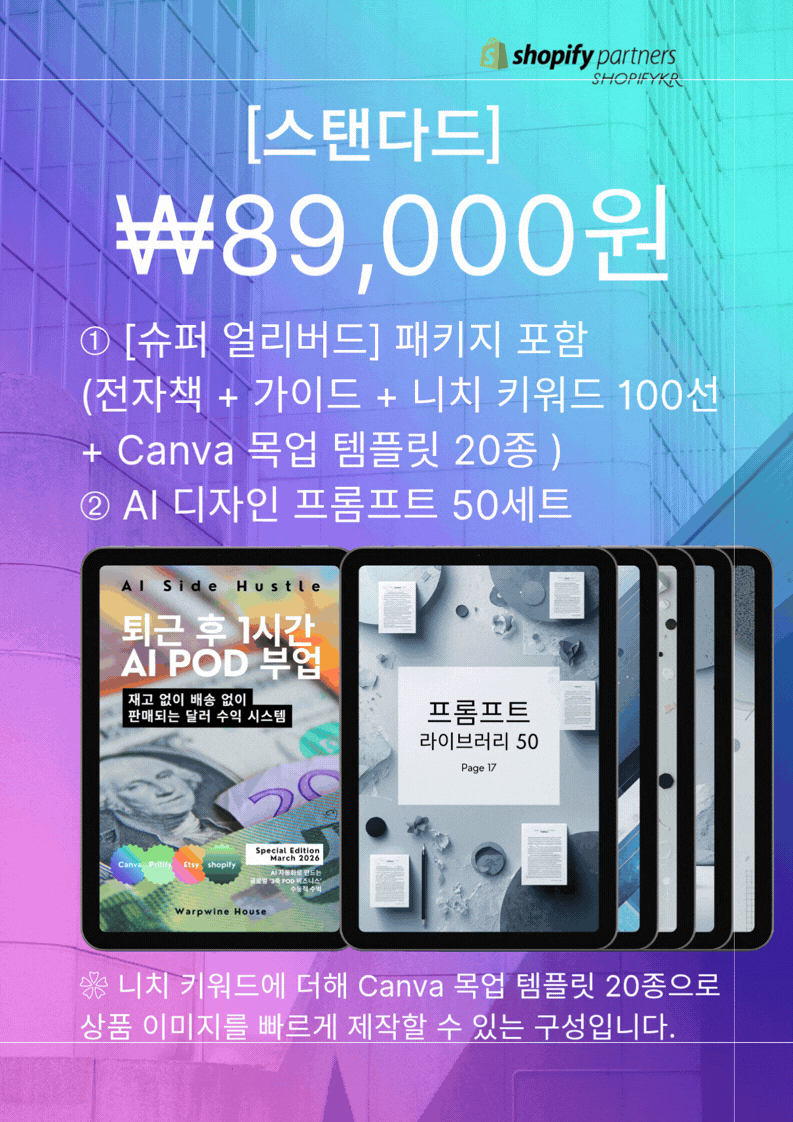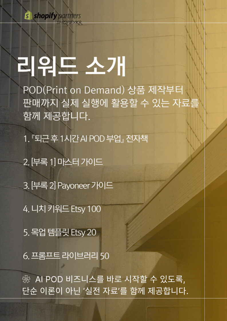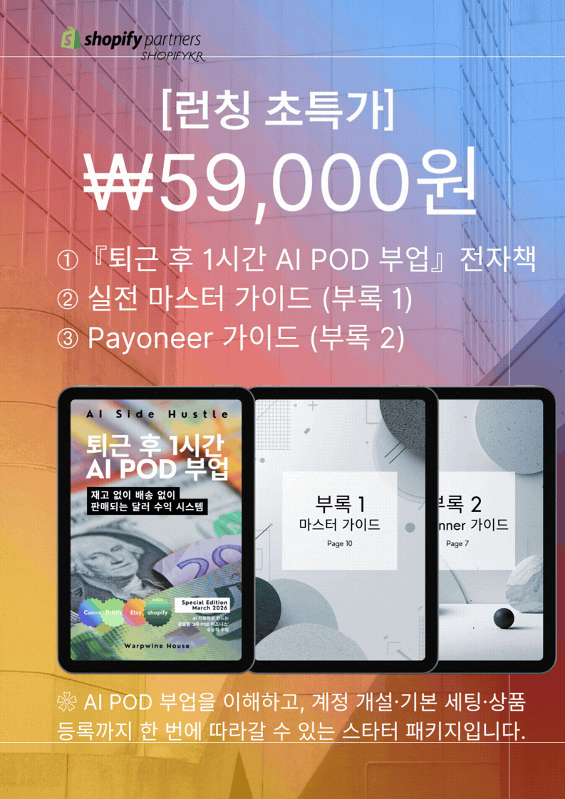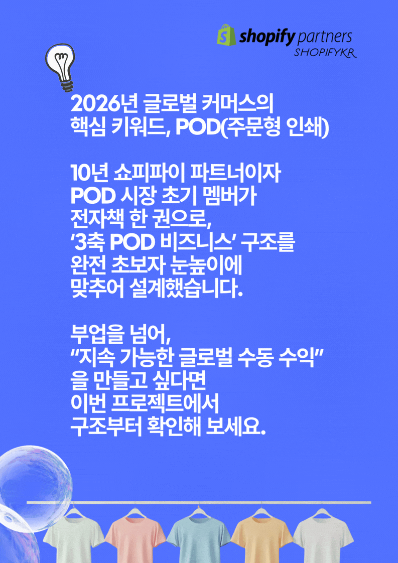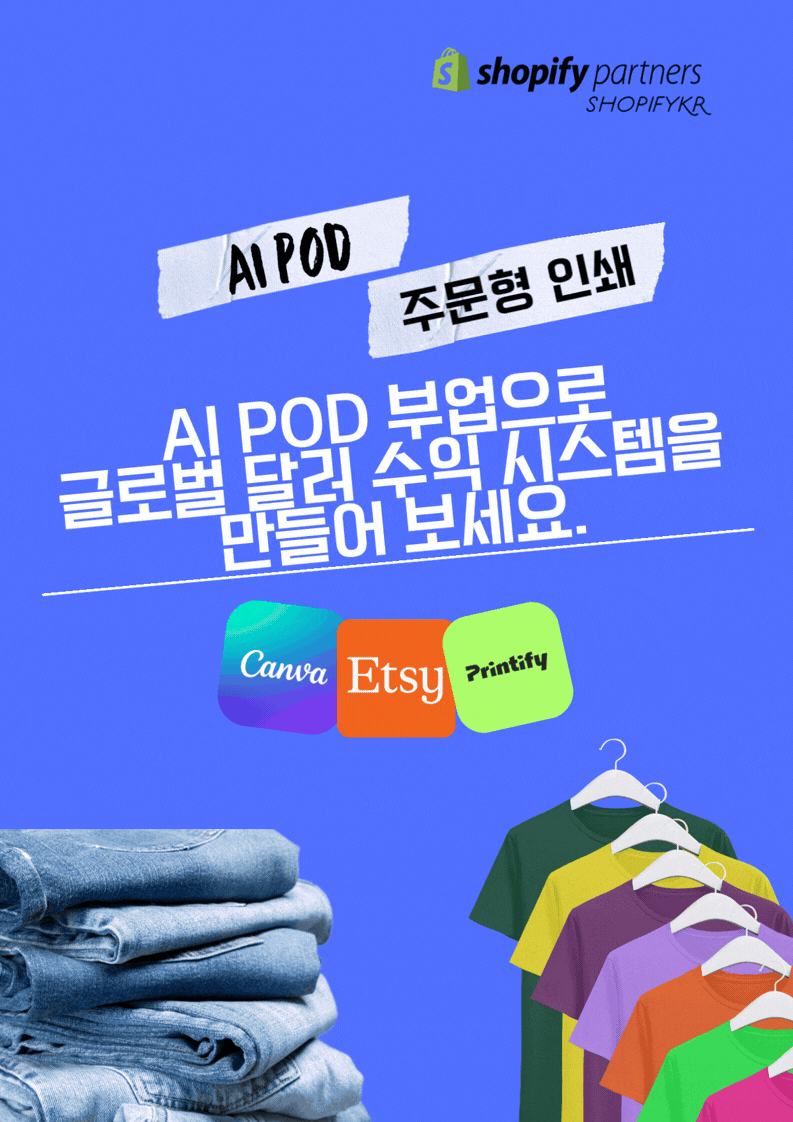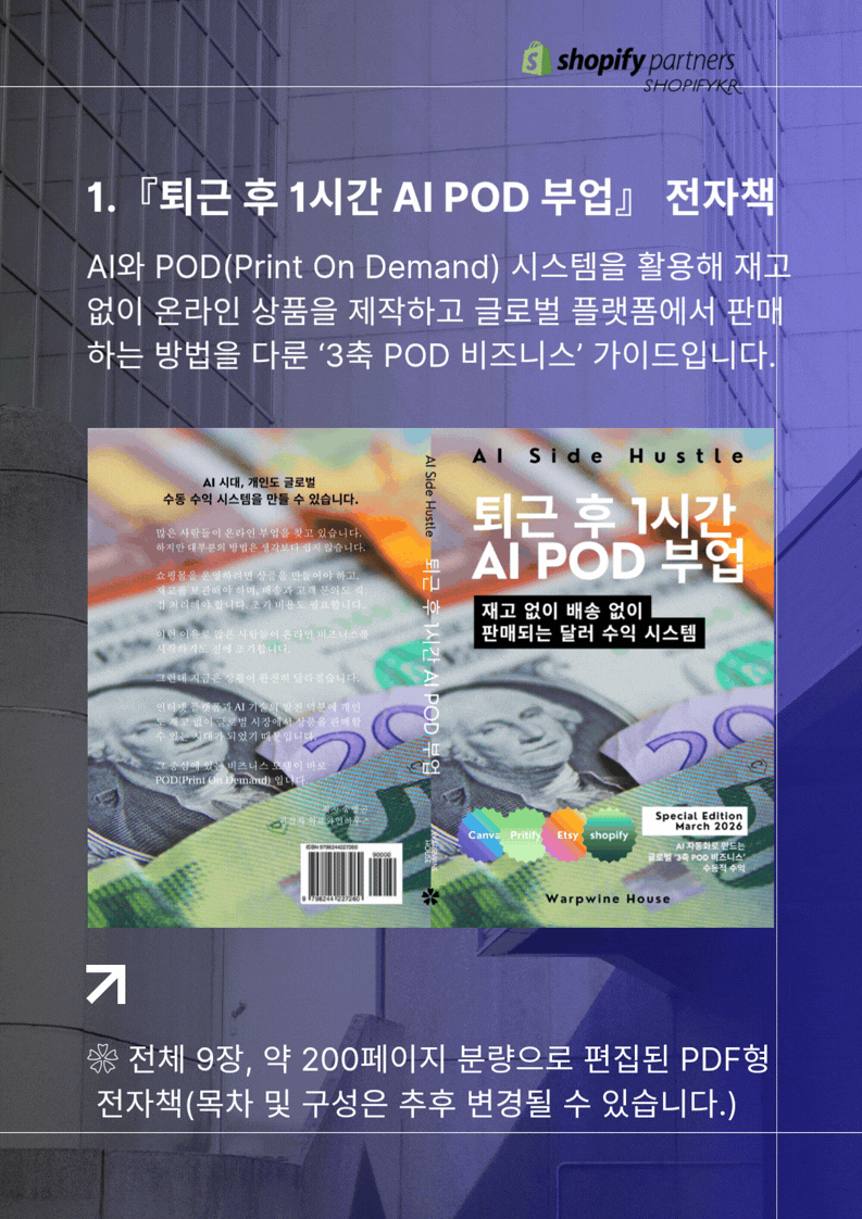 ❀ AI와 POD(Print On Demand) 시스템을 활용해 재고 없이 온라인 상품을 제작하고, 글로벌 플랫폼에서 판매하는 방법을 다룬 쇼피파이코리아에서 설계한 ‘3축 POD 비즈니스’ 실전 가이드입니다.