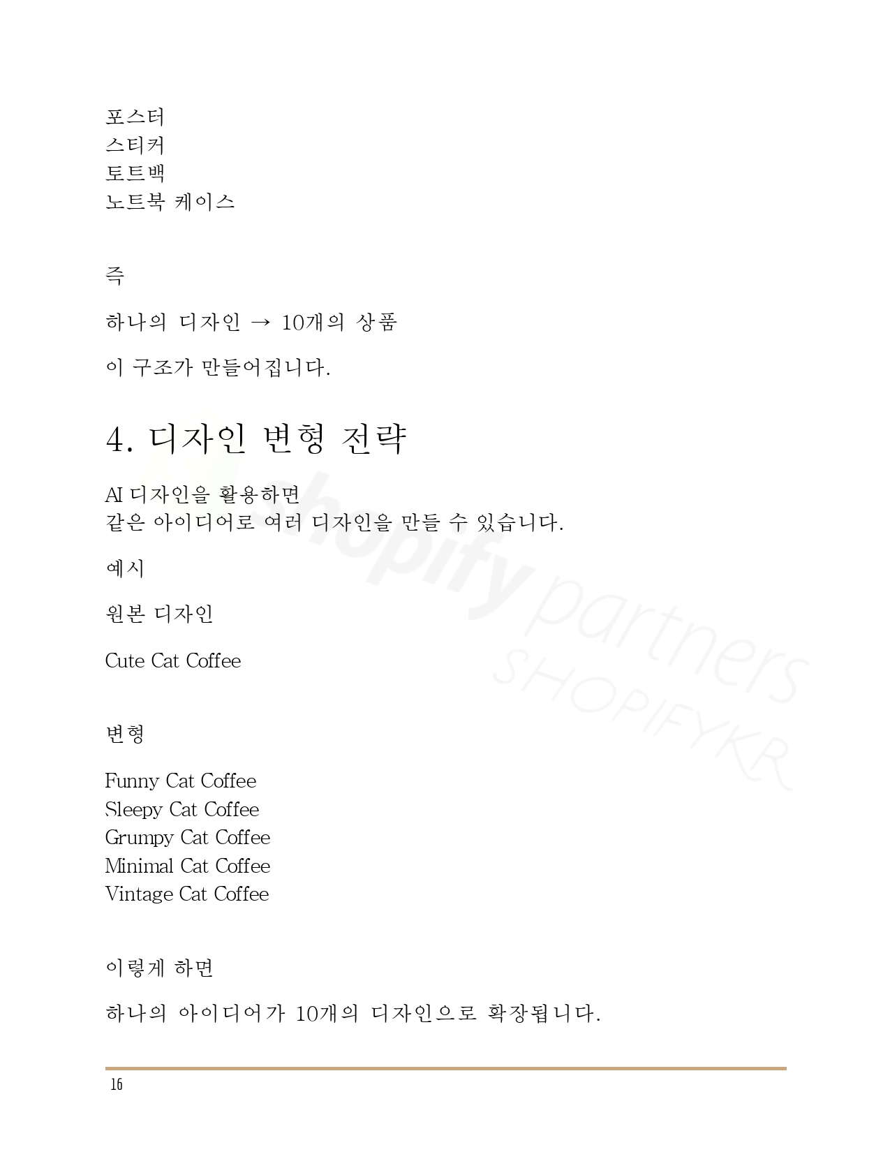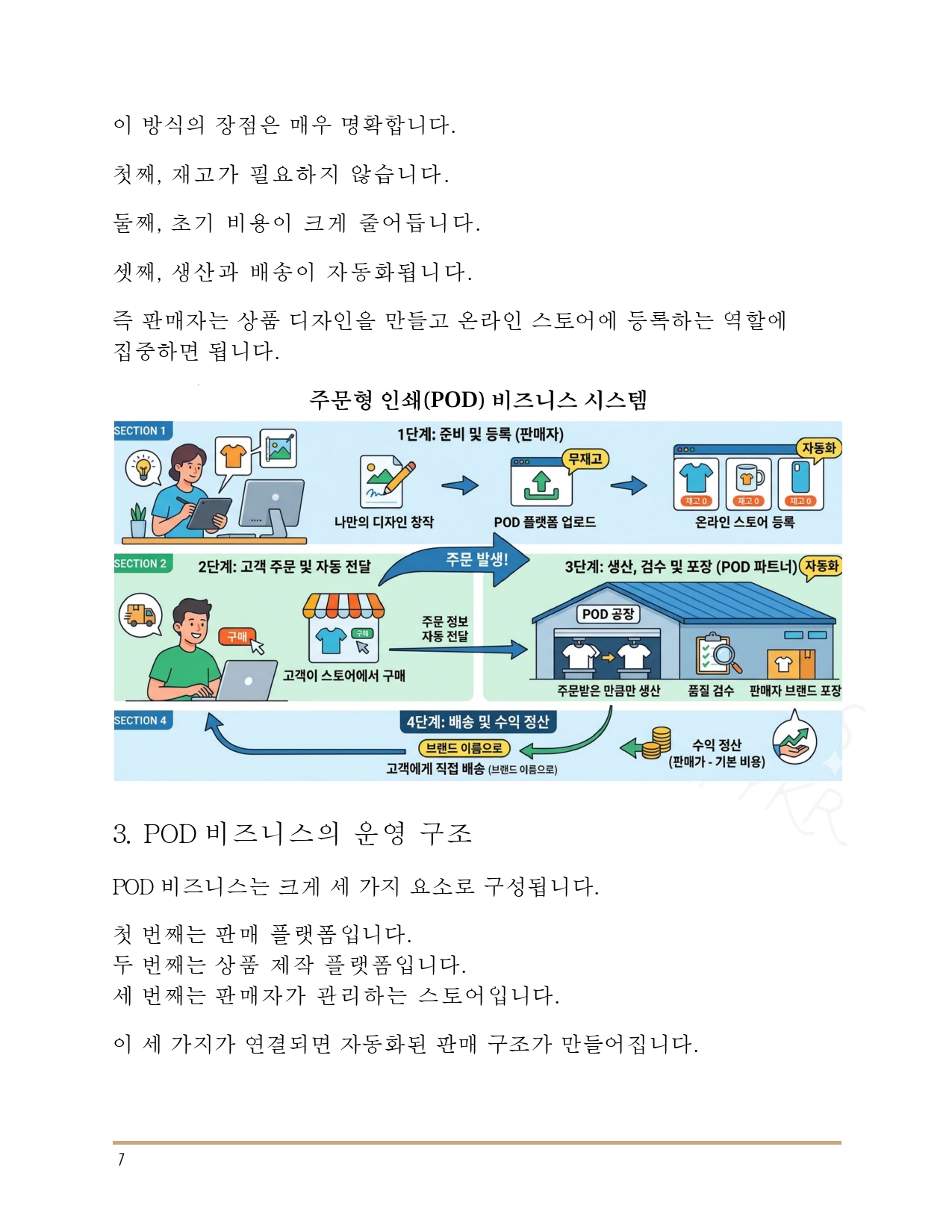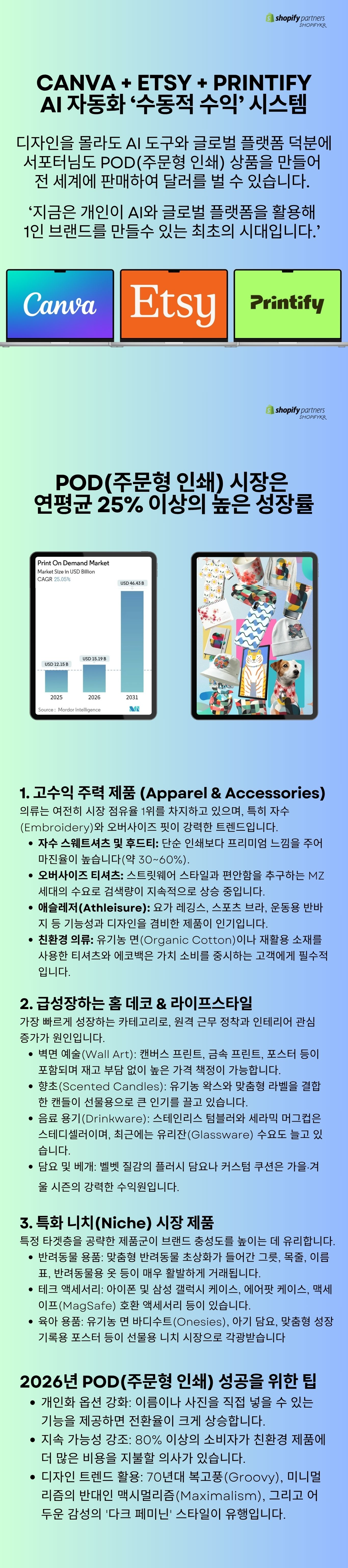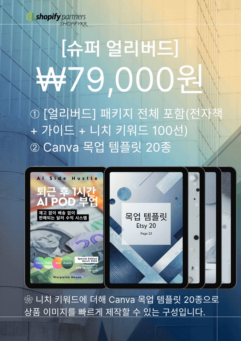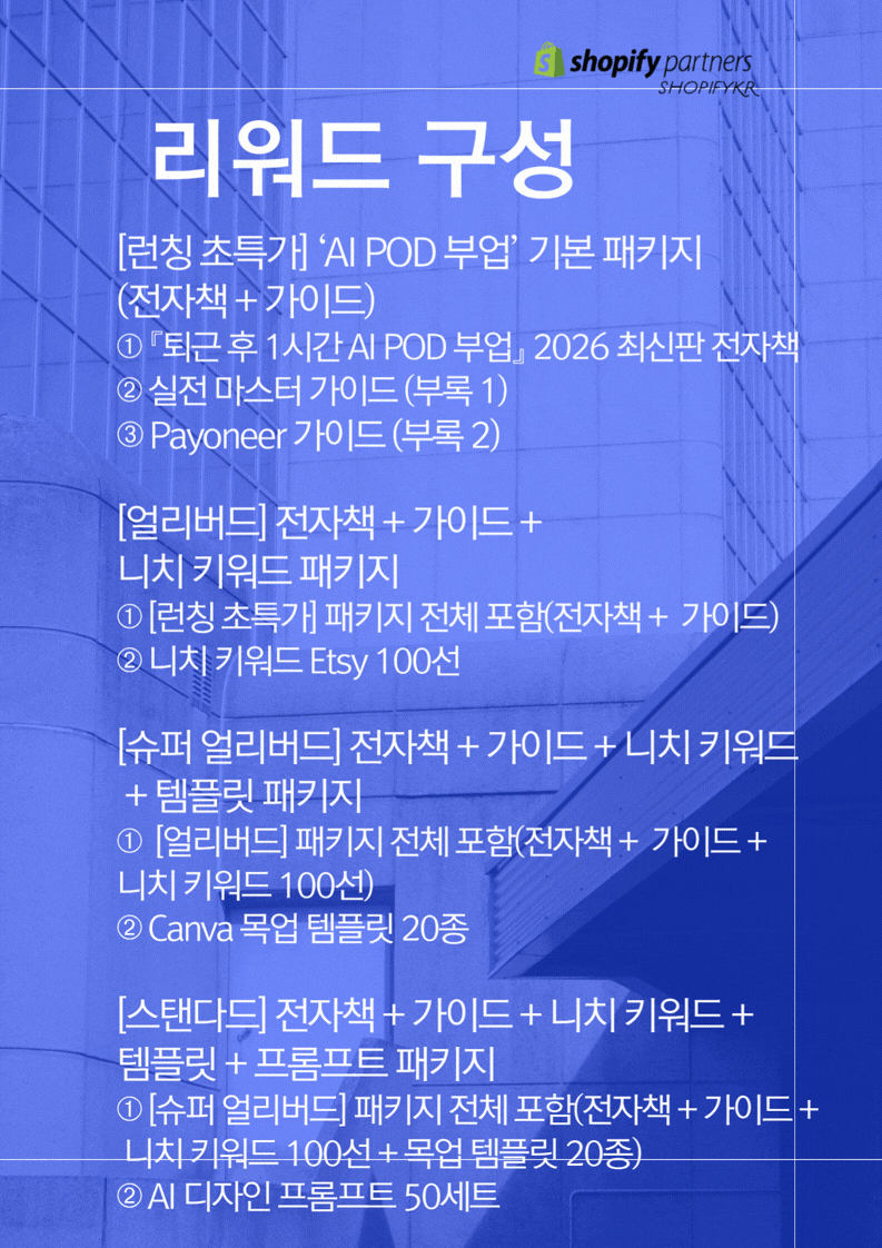 ❀ AI와 POD(Print On Demand) 시스템을 활용해 재고 없이 온라인 상품을 제작하고, 글로벌 플랫폼에서 판매하는 방법을 다룬 쇼피파이코리아에서 설계한 ‘3축 POD 비즈니스’ 실전 가이드입니다.