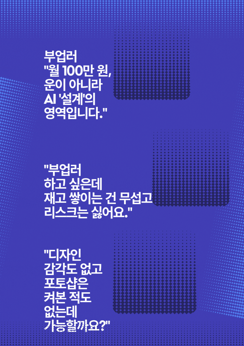 디자인은 AI가 하고, 제작·배송은 플랫폼이 담당합니다. 서포터님께서는 ‘무엇을 선택할지’ 결정하는 역할에 집중하시면 됩니다.