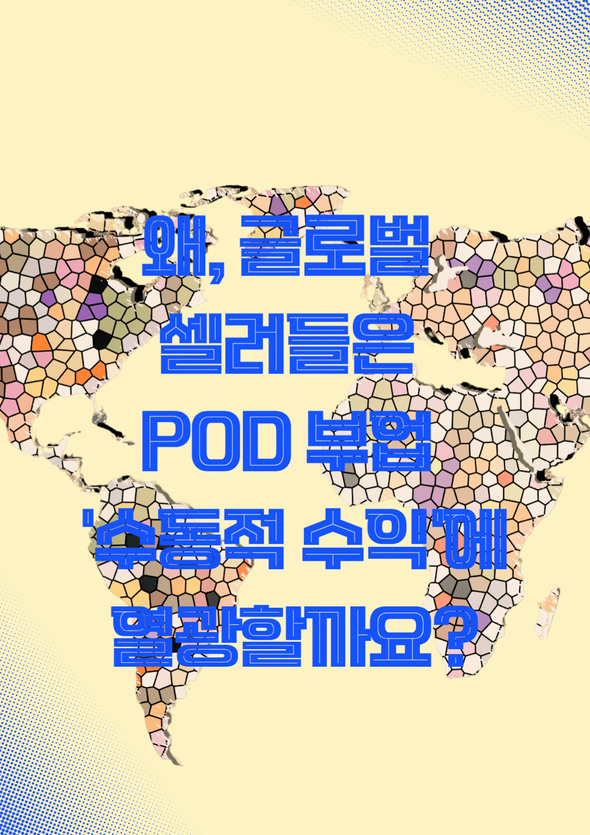 이미 해외에서는 POD가 “대표적인 온라인 부업 모델”로 자리 잡고 있지만, 한국 시장은 아직 정보와 실전 가이드가 부족한 초기 단계입니다. 실제로 한국 셀러 비중은 매우 낮아, 지금이 진입하기에 유리한 시점입니다.