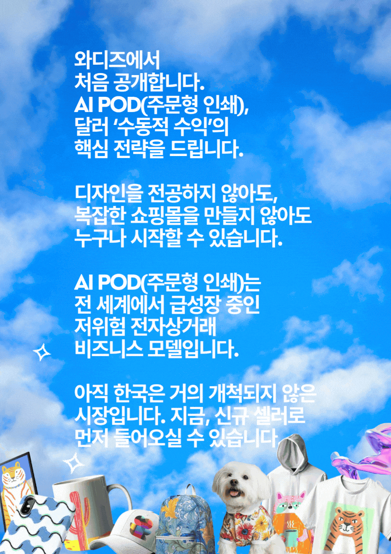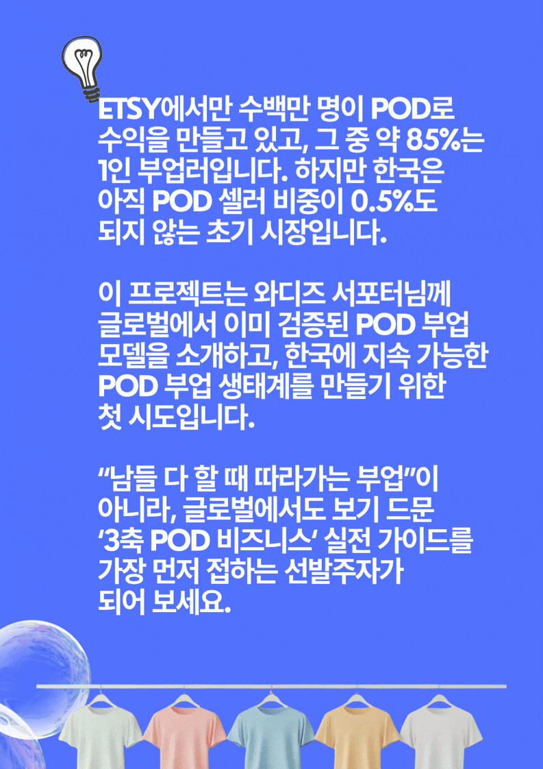 ❀ 이번 펀딩을 계기로, AI POD(Print On Demand) 비즈니스를 와디즈 서포터님들과 한국 시장에 더 널리 알리고, 누구나 도전할 수 있는 새로운 부업 모델로 함께 키워 가고자 합니다.