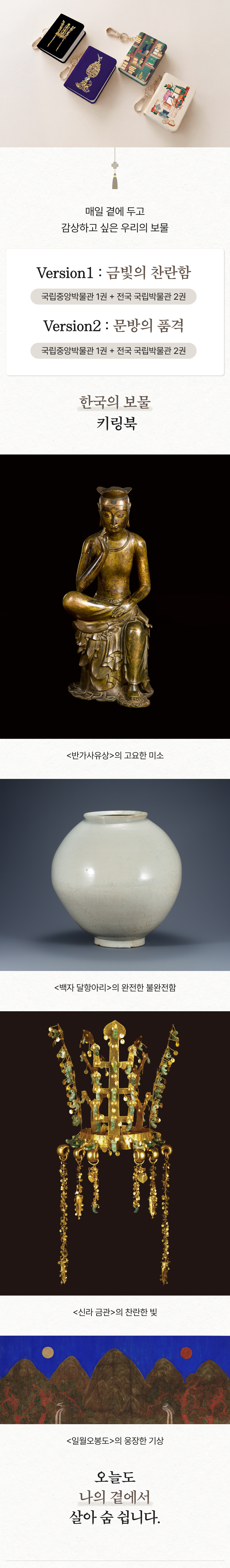 이제 북로그컴퍼니는 우리 문화유산을 누구나 쉽고 친근하게 만날 수 있도록 새로운 도전을 시작합니다. 드라마 대본을 책으로 남긴 것처럼, 우리가 꼭 기억해야 할 문화재를 손 안의 작은 책, 키링북에 담았습니다. 수록된 모든 이미지는 전국 15개 국립박물관이 공식 제공하는 공공누리 저작물로, 전문가가 촬영한 고화질 이미지만을 엄선했습니다. 출처가 명확하고 색감과 디테일이 원본에 충실한 프리미엄 도록을 손 안에서 만나보세요. 대중과 문화를 잇는 북로그컴퍼니의 또 하나의 여정에 함께해 주세요.