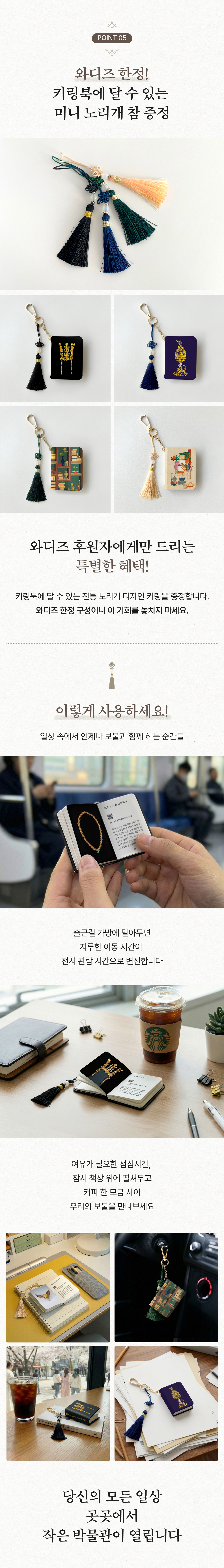 박물관에서 받은 감동을 "그날"로 끝내고 싶지 않았습니다. 전시장에서 스쳐 지나간 유물의 디테일과 분위기를, 일상에서도 자주 꺼내 보고 싶었어요. 그래서 가방이나 열쇠에 달아 언제든 펼칠 수 있는 키링북을 만들었습니다.