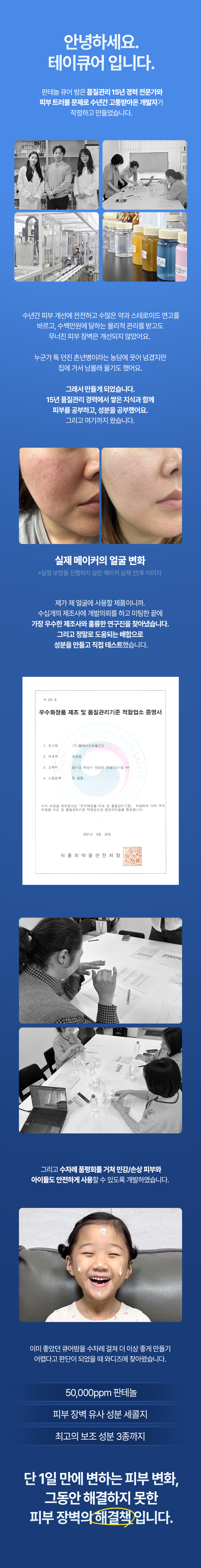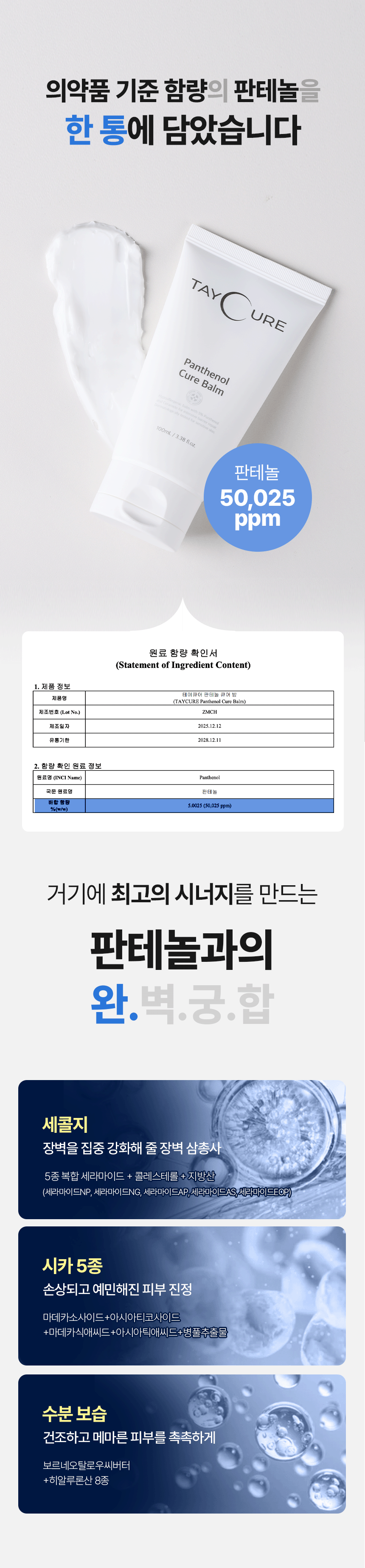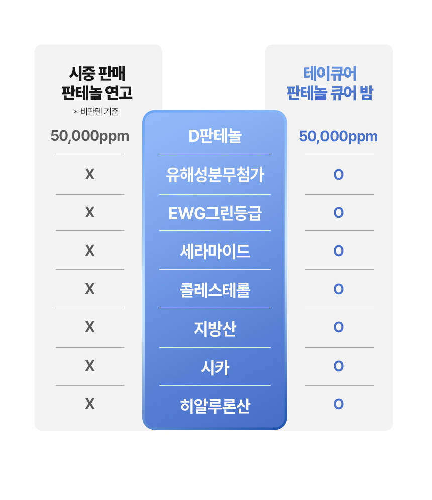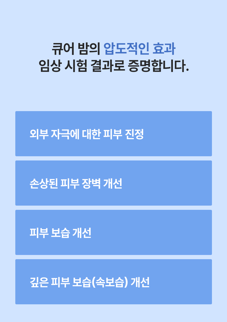 큐어 밤은 의약품 기준 함량인 50,000ppm을 적용해, 피부가 실제로 반응할 수 있는 농도로 설계했습니다.