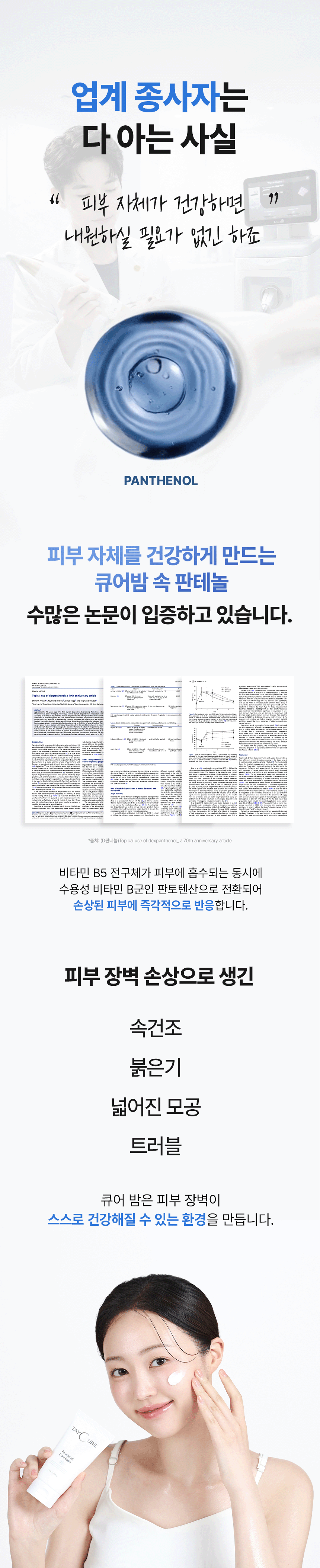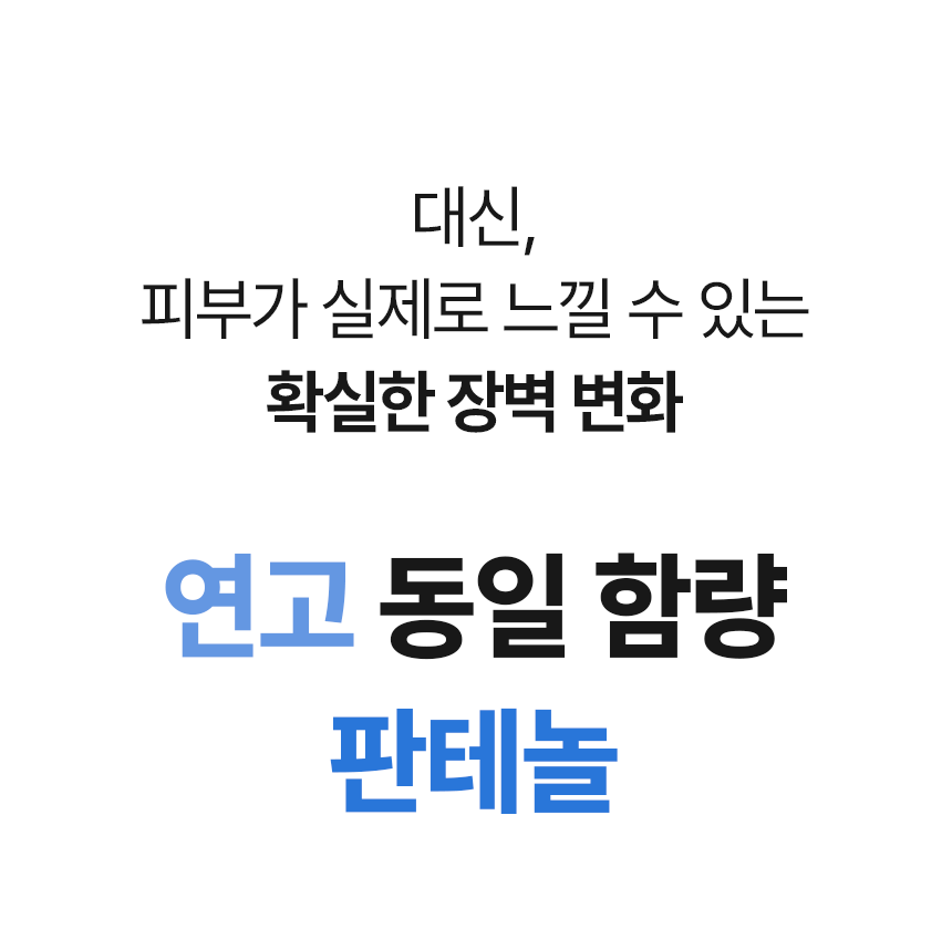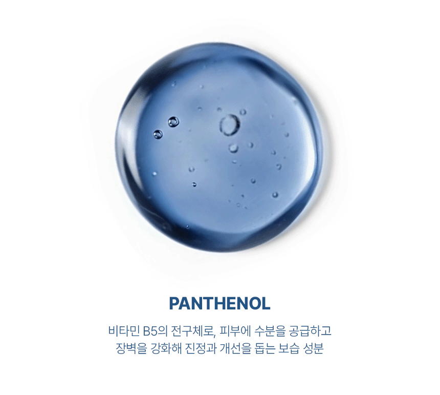 - 판테놀은 손상된 피부의 염증 완화와 장벽 회복을 돕는 성분입니다.