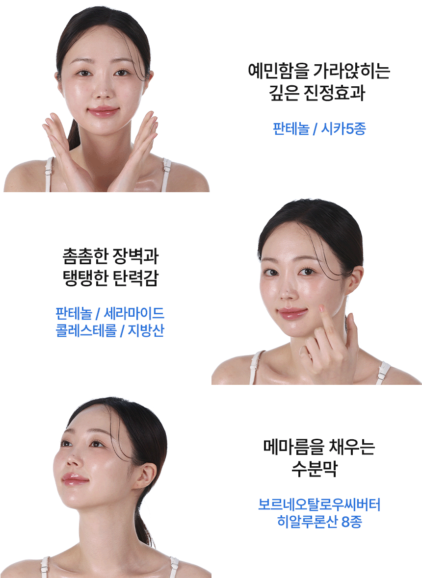 향료, 색소, 알코올 등 자극이 될 수 있는 성분은 배제하고, 피부 장벽 회복과 진정에 필요한 핵심 성분만을 신중하게 선택했습니다.