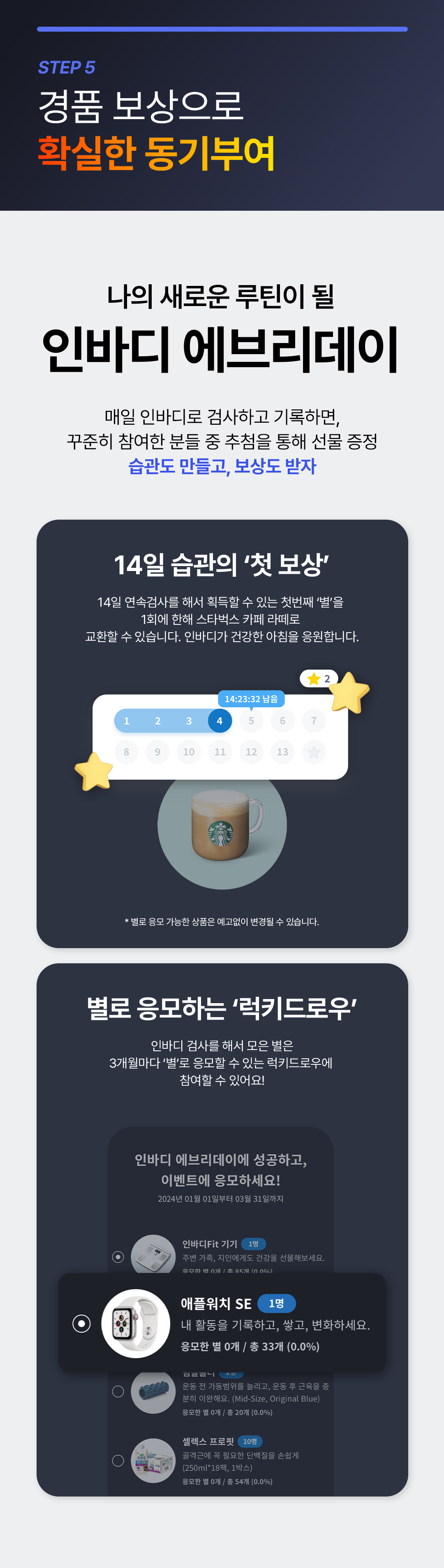 1. 📊 AI 기반 인바디 체성분 분석기 - AI와 인바디 기술로 체성분 측정부터 맞춤 분석 제공 2. 🏠 가정용 체성분 관리 솔루션 - 집에서 간편하게 체성분 측정 및 데이터 실시간 확인 3. 🎁 동기부여 경품 보상 시스템 - 연속 검사 달성 시 경품 제공으로 꾸준한 관리 유도