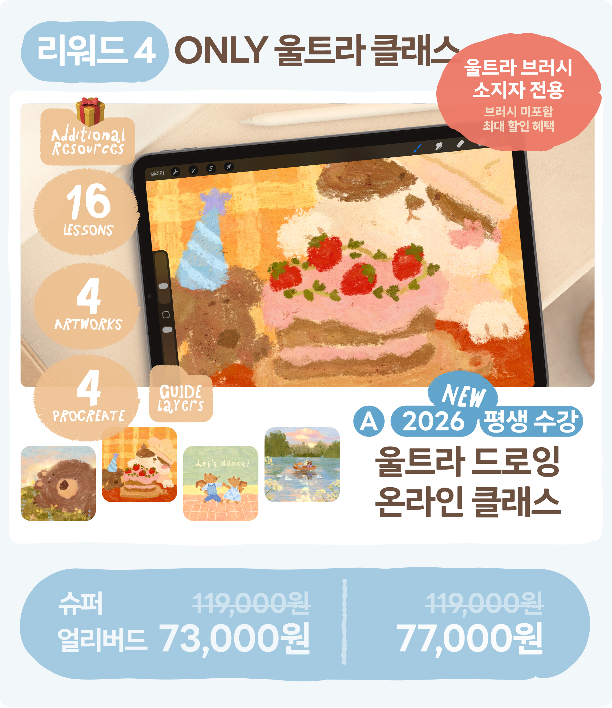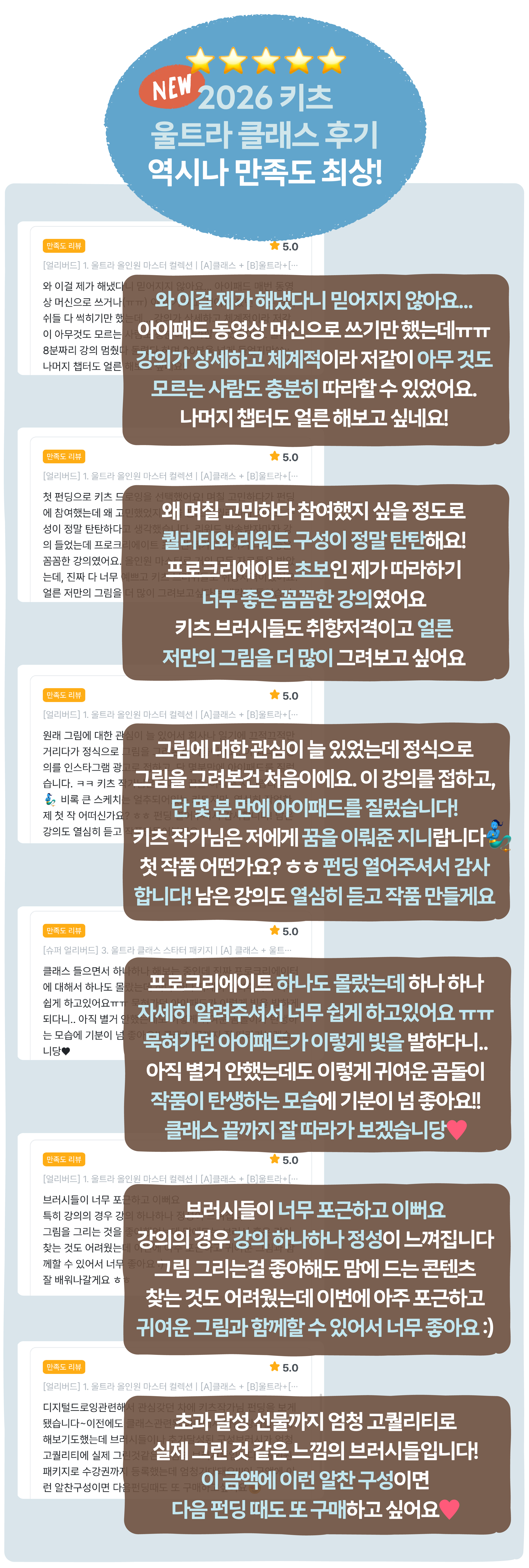 키츠 브러시는 지난 클래스101 TOP20 선정 이력의 아이패드 드로잉 '아날로그 텍스처' 시리즈 클래스들을 통해 2020년 1월부터 과슈, 오일 파스텔, 수채화, 색연필 등의 재료 및 종이 텍스처가 담긴 커스텀 브러시 세트를 제공드리며 시작되었습니다.