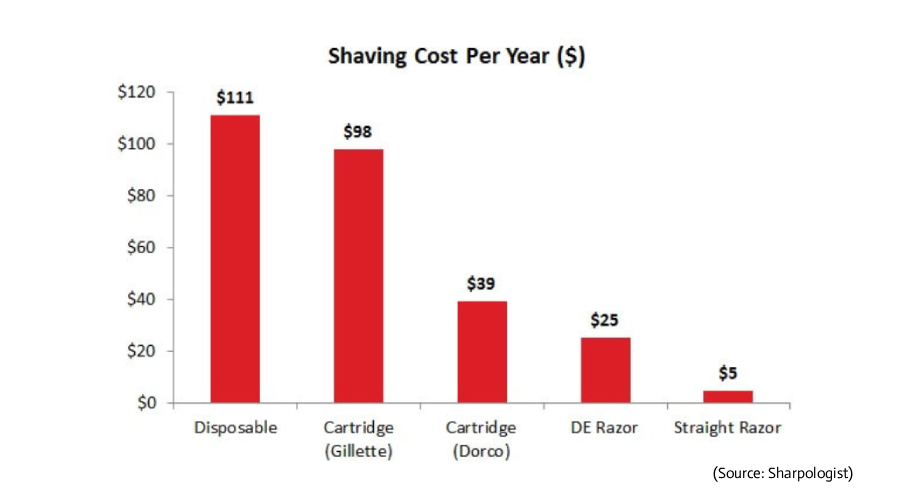 클래식 면도 시장에는 장 당 200~400원 수준의 다양한 저렴한 면도날들이 있어 카트리지 다중날 면도날의 가격이 부담되는 분들에게는 클래식 면도의 초기 구매 비용은 다소 높더라도 반영구적으로 사용 가능한 면도기와 저렴한 면도날로 인해 경제성을 신경쓴다면 장기적으로 면도 비용을 상당히 절감할 수 있다.