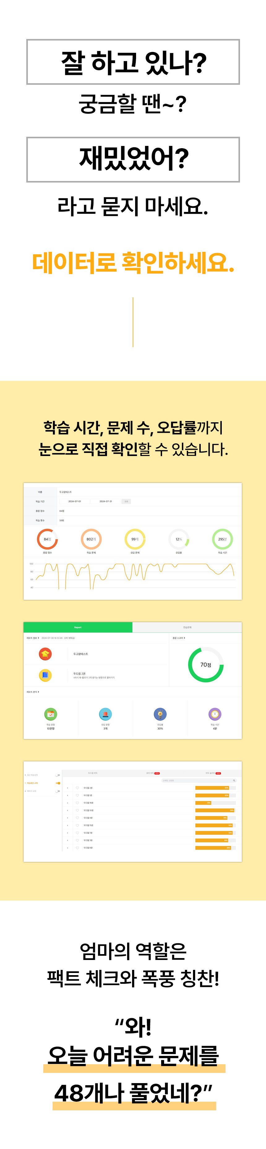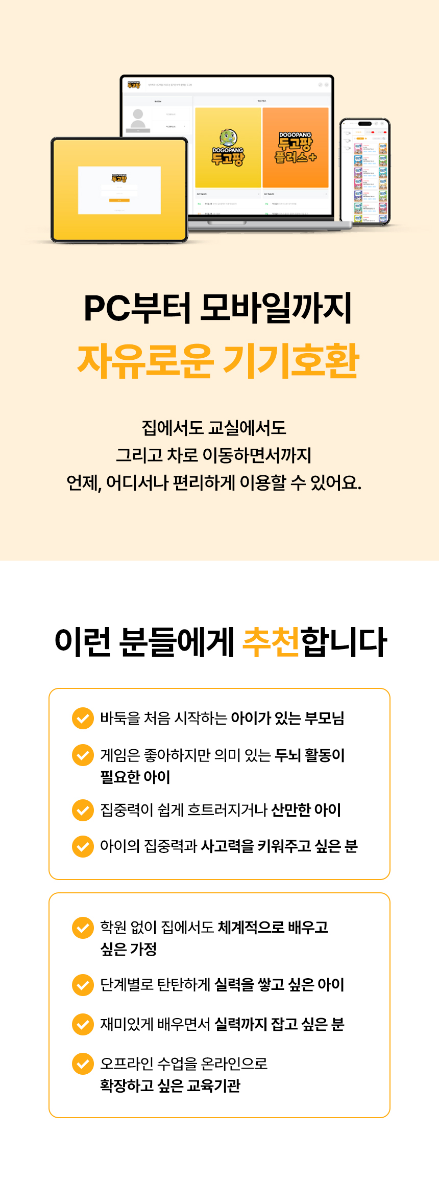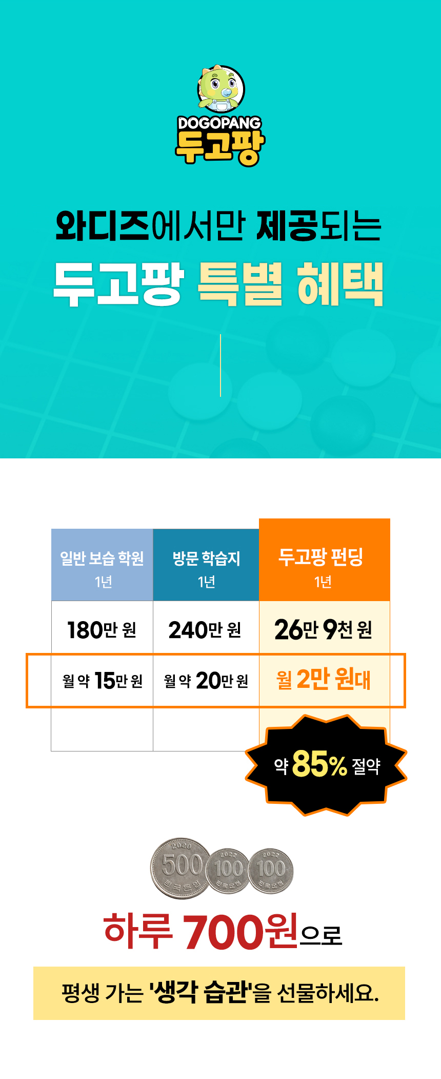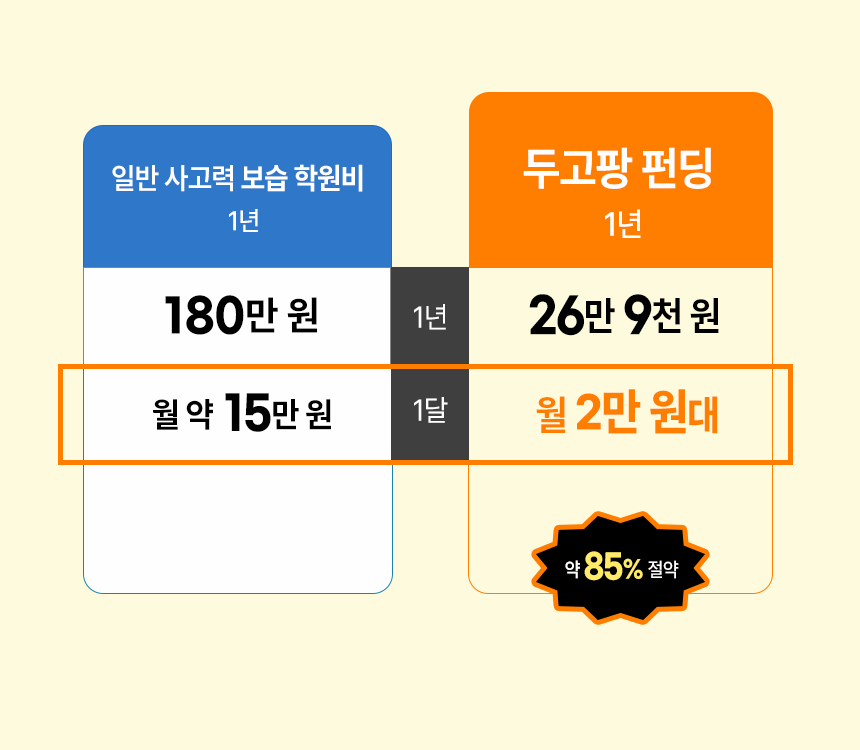 B2B(학교/학원) 시장에서 완벽하게 검증된 '두고팡'의 커리큘럼을 더 많은 가정에 합리적인 가격으로 제공하고자 합니다. 우리 아이들의 팝콘 브레인을 예방하고 수학적 사고력을 키워줄 가장 완벽한 홈스쿨링 솔루션, 두고팡&이 세상에 나오게 되었습니다.