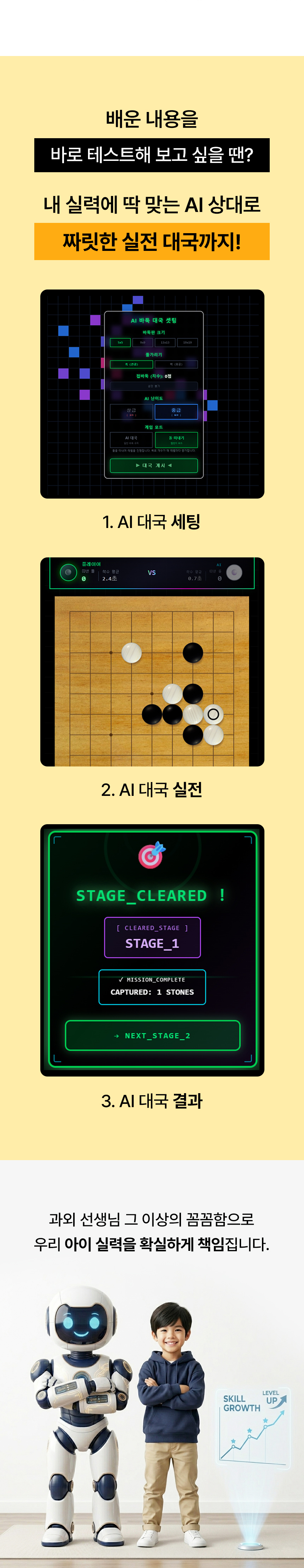 아이들이 좋아하는 애니메이션과 게임(디지털) 요소로 흥미를 끌고, 직접 바둑돌을 만지며 교재에 연필로 풀어가는(아날로그) 방식을 결합한 '3-Way 하이브리드 학습법'을 고안했습니다. 바둑을 모르는 부모님도 쉽게 지도할 수 있도록 '에듀테크 활용 실시간 채점 시스템' 개발에 착수했습니다.
