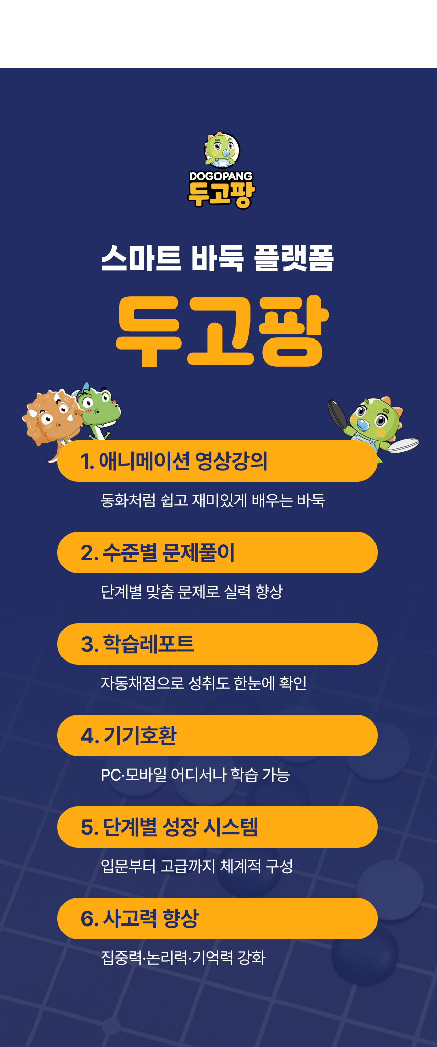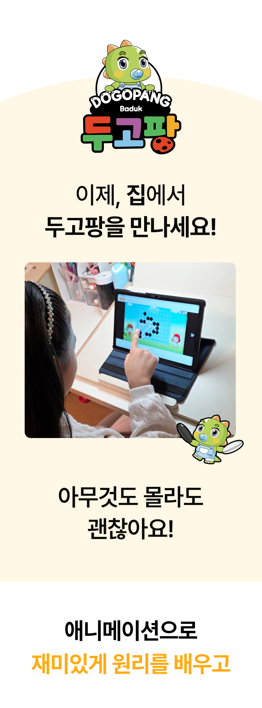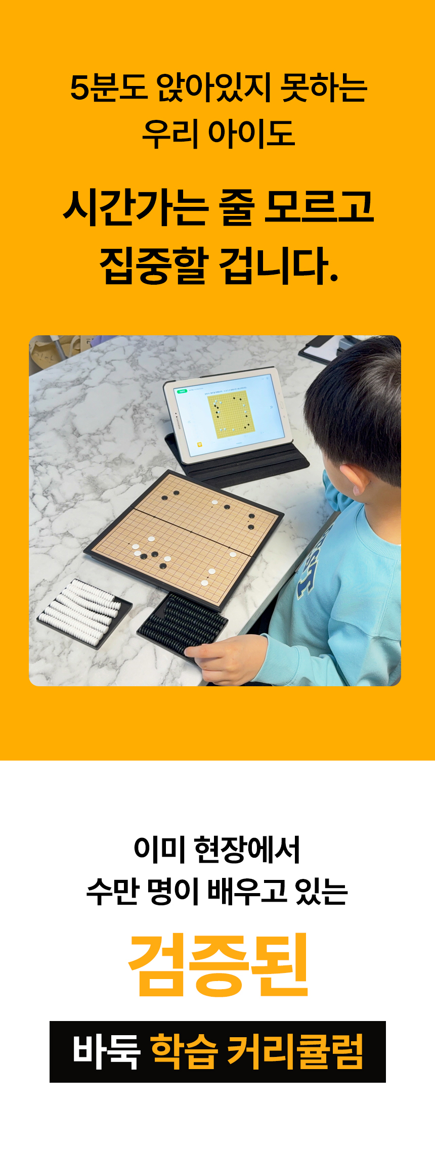 스마트폰을 무조건 빼앗는 대신, 스마트폰보다 더 재미있게 '생각하는 힘'을 기를 수 있는 건강한 디지털 놀이터를 만들어주고 싶었습니다. 수만 명의 아이들이 검증한 두드림에듀의 탄탄한 오프라인 교재 노하우를 이제 온라인 기술을 통해 더 재미있는 바둑 콘텐츠가 되어 가정으로 찾아갑니다.
